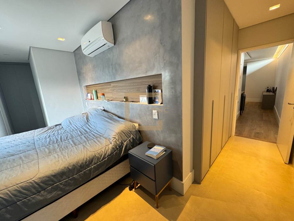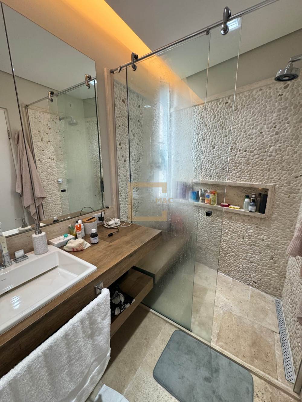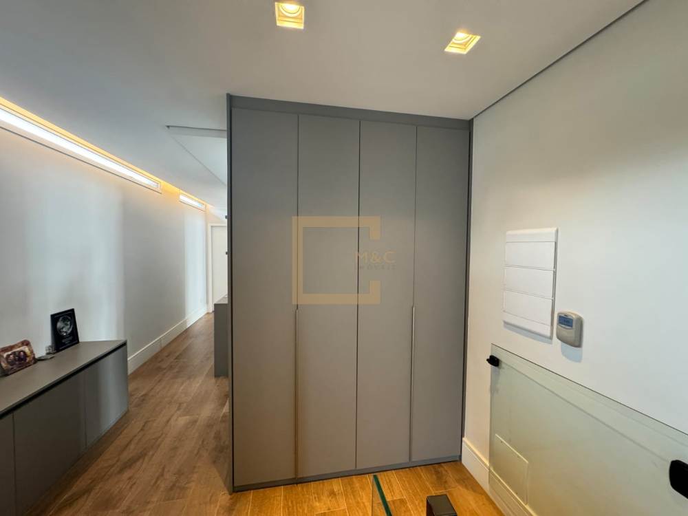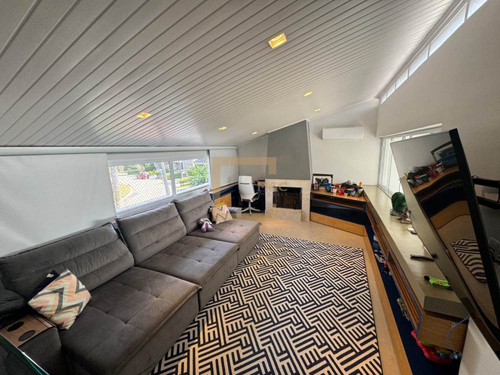 Piso superior com 3 amplas suítes, banheiros novos, completa de armários e ar condicionado, sala de TV e roupeiro.