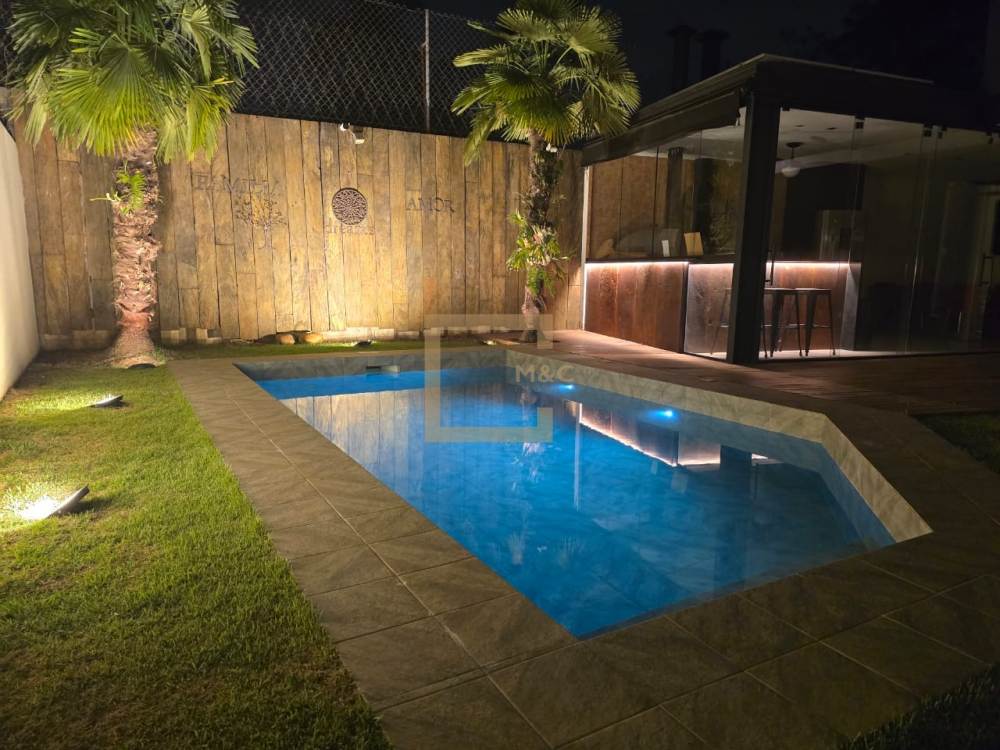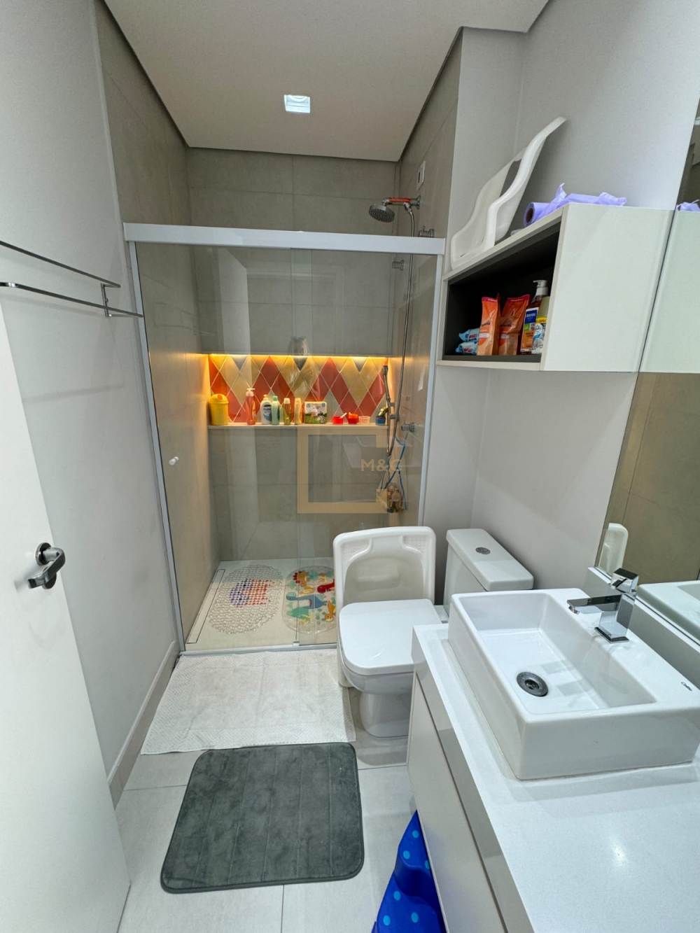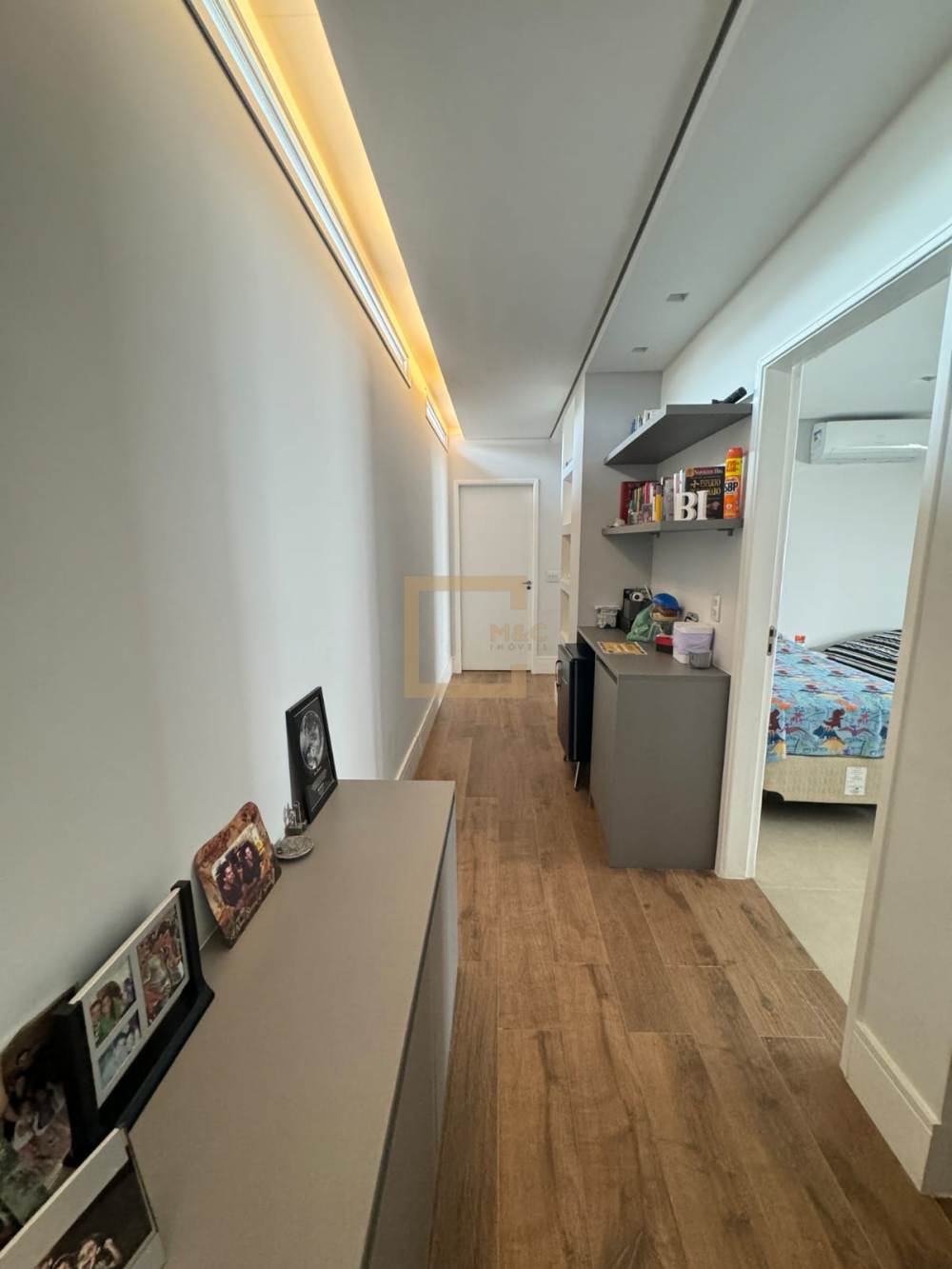 Piso superior com 3 amplas suítes, banheiros novos, completa de armários e ar condicionado, sala de TV e roupeiro.