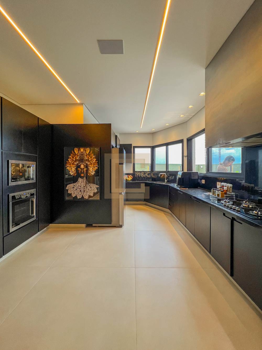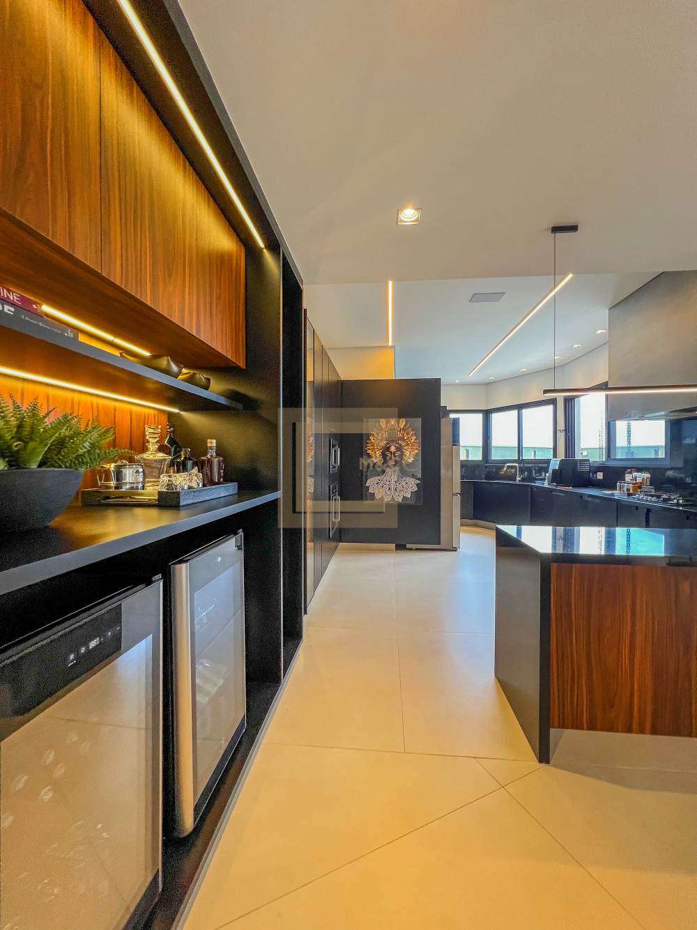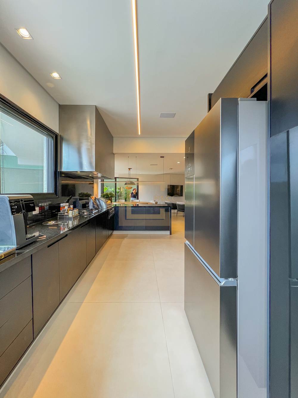 Sala de estar e TV, integradas ao espaço gourmet e a cozinha, dispensa