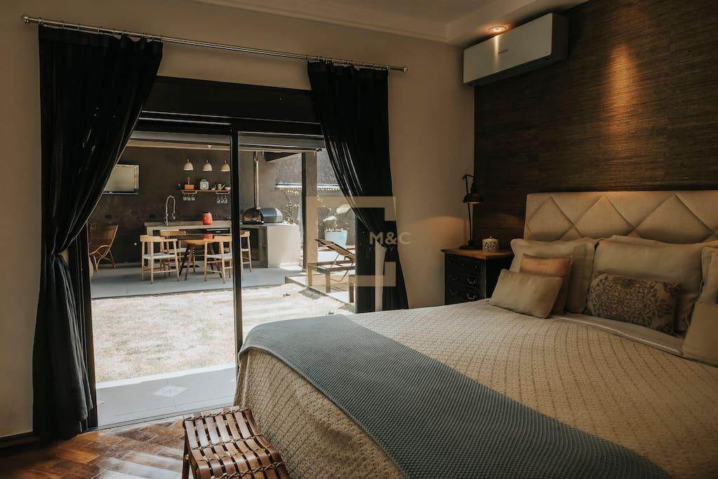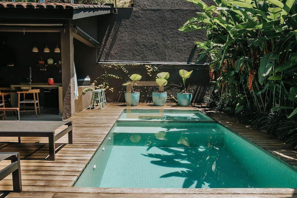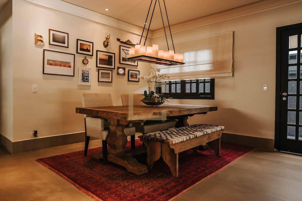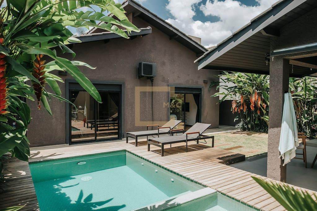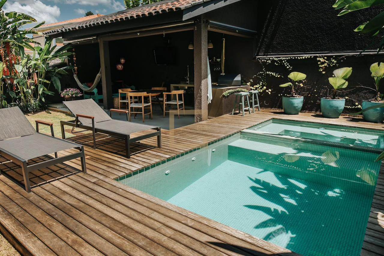 Para todas as estações a área de lazer da casa é um oásis com paisagismos tropical, piscina e jacuzzi aquecidas, área gourmet com forno de pizza;