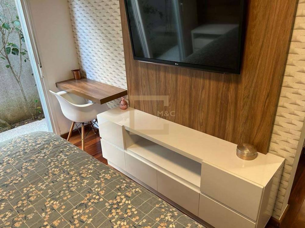 Suíte principal com porta balcão, closet, ar-condicionado quente/frio, painel de cabeceira, painel com rack para TV e gabinete nos banheiros.