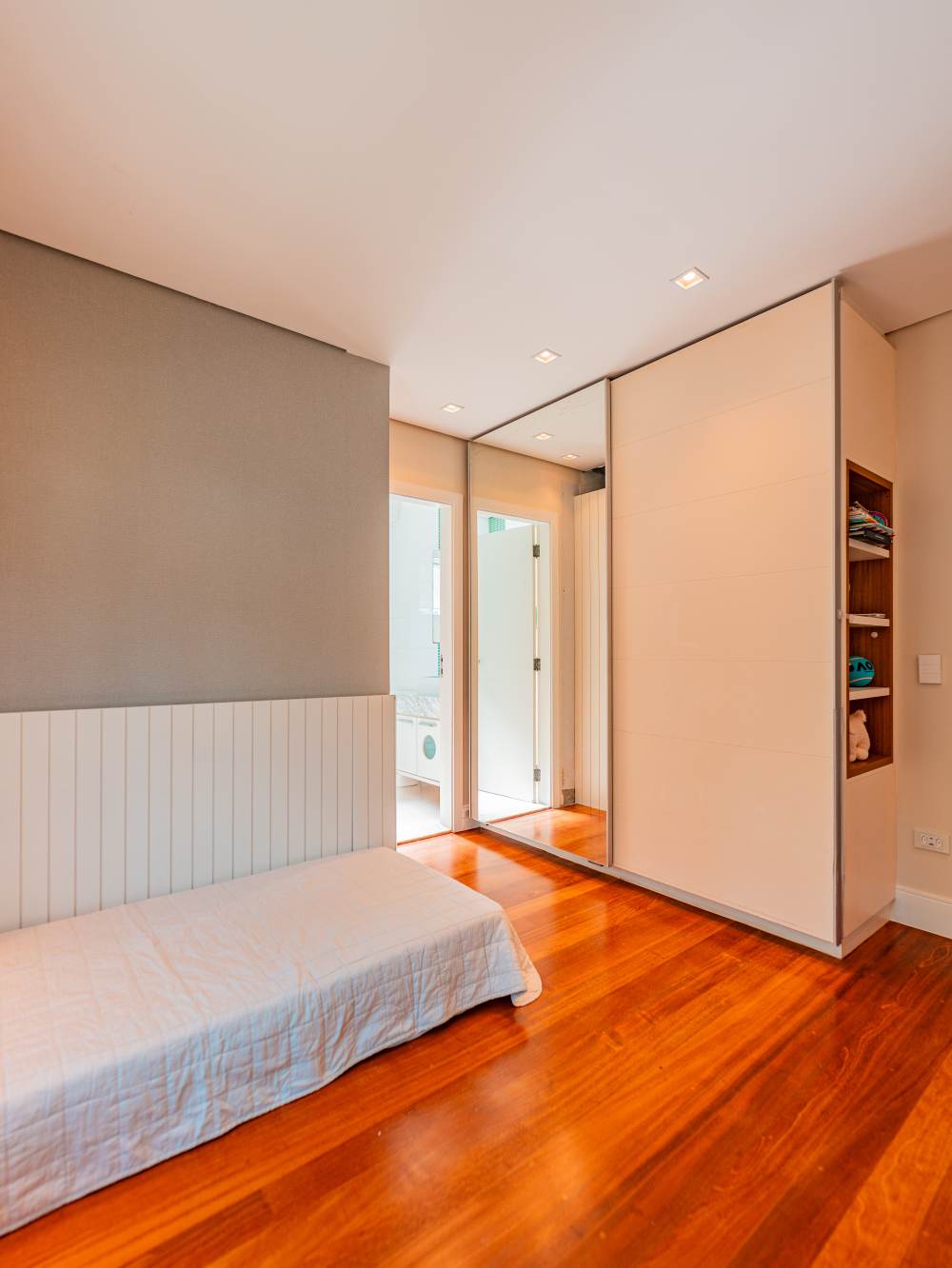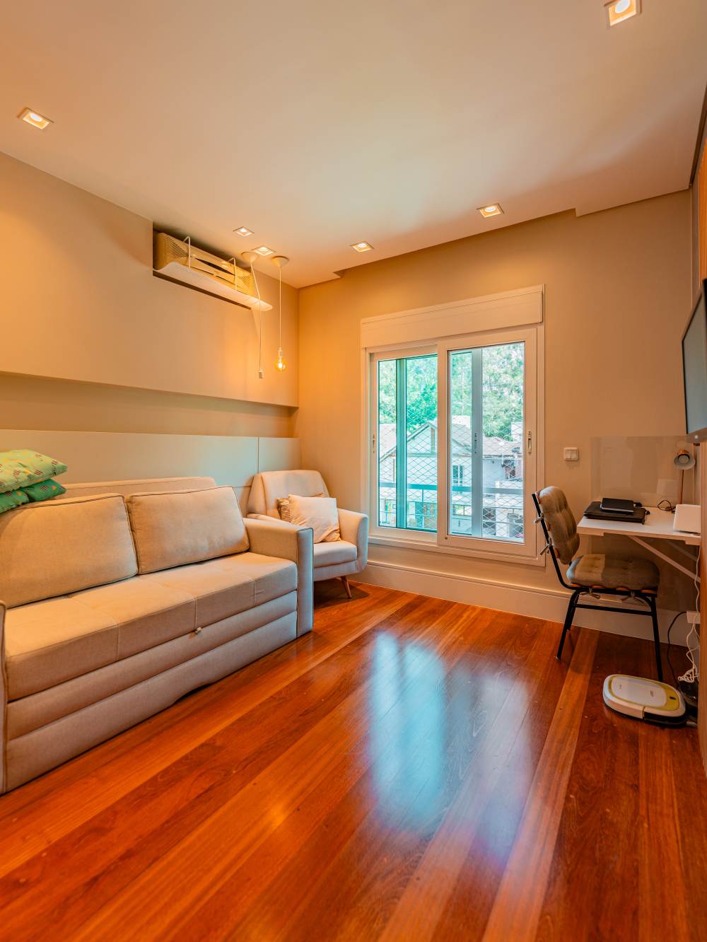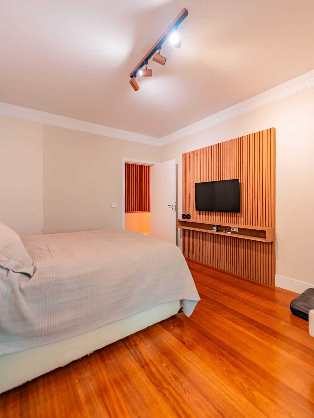 No pavimento superior, um belíssimo assoalho de madeira jatobá reveste os