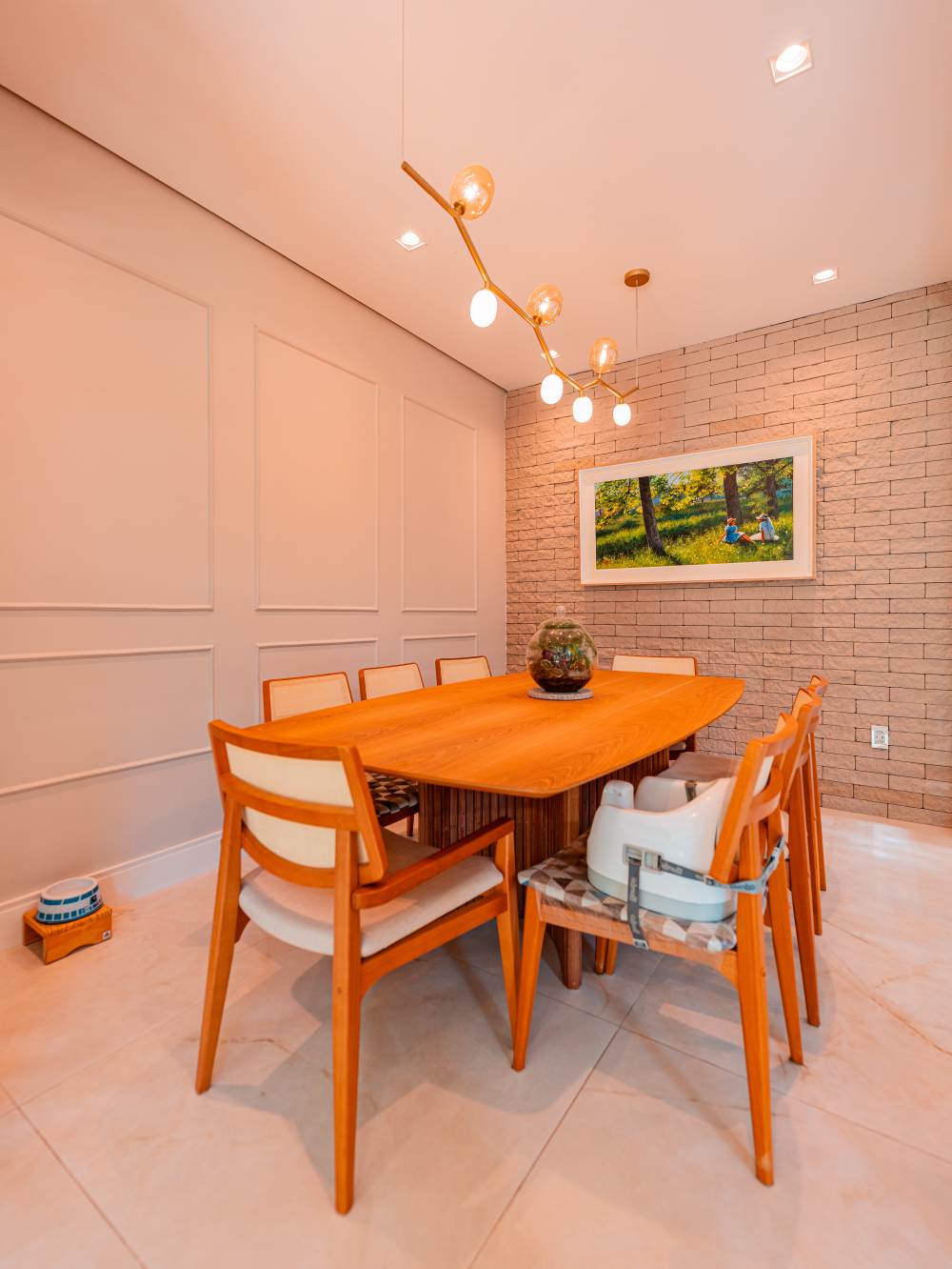 A sala de jantar, a cozinha e o living principal estão integrados de maneira harmoniosa, criando um fluxo