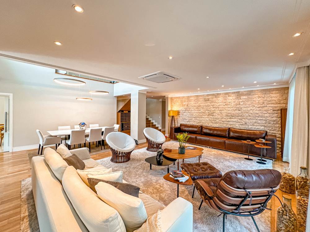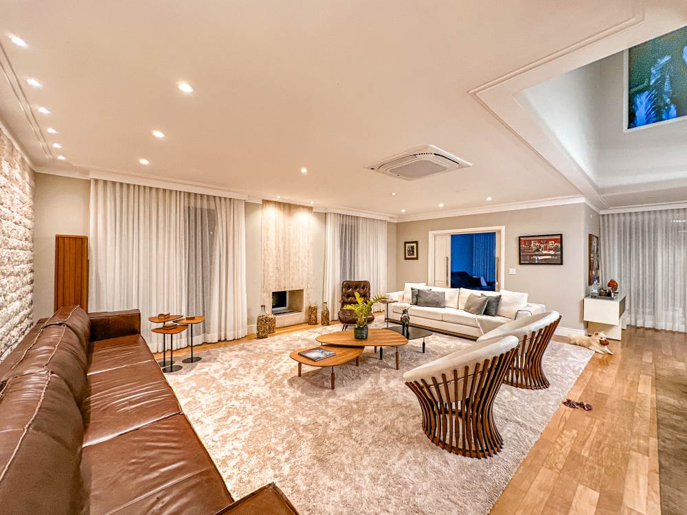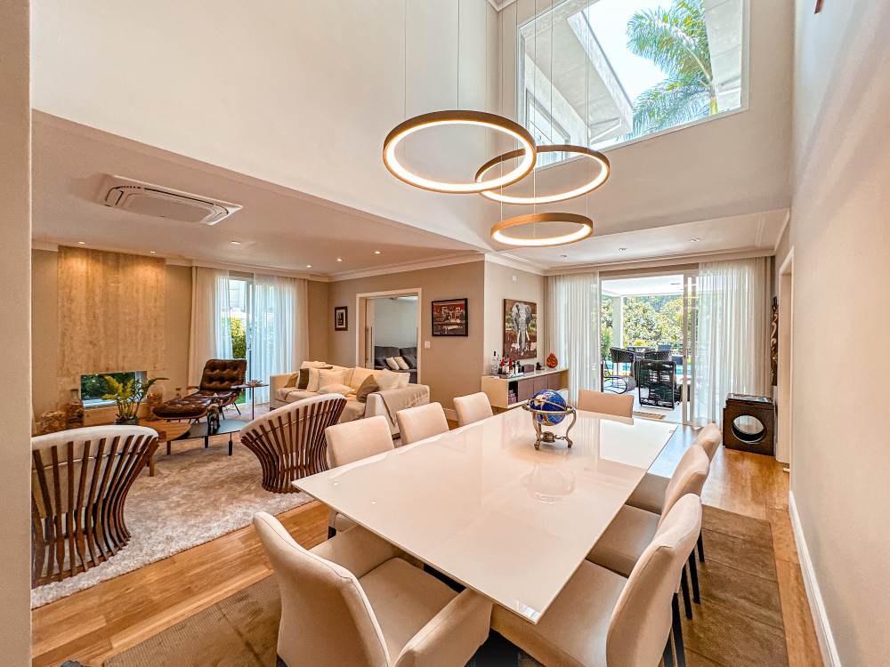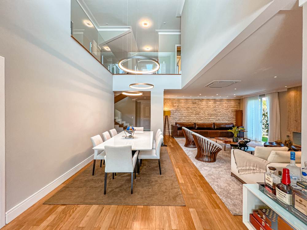 Living amplo com Lareira ecológica, Home theater, sala de jantar com pé direito duplo, Adega.