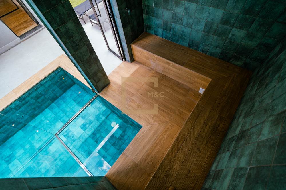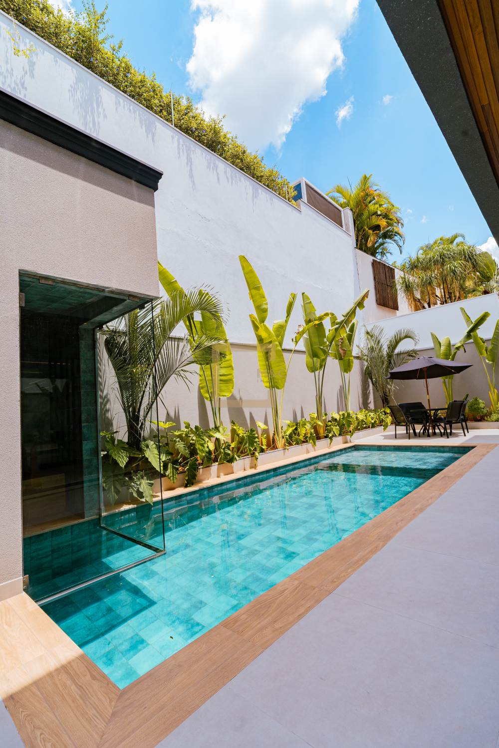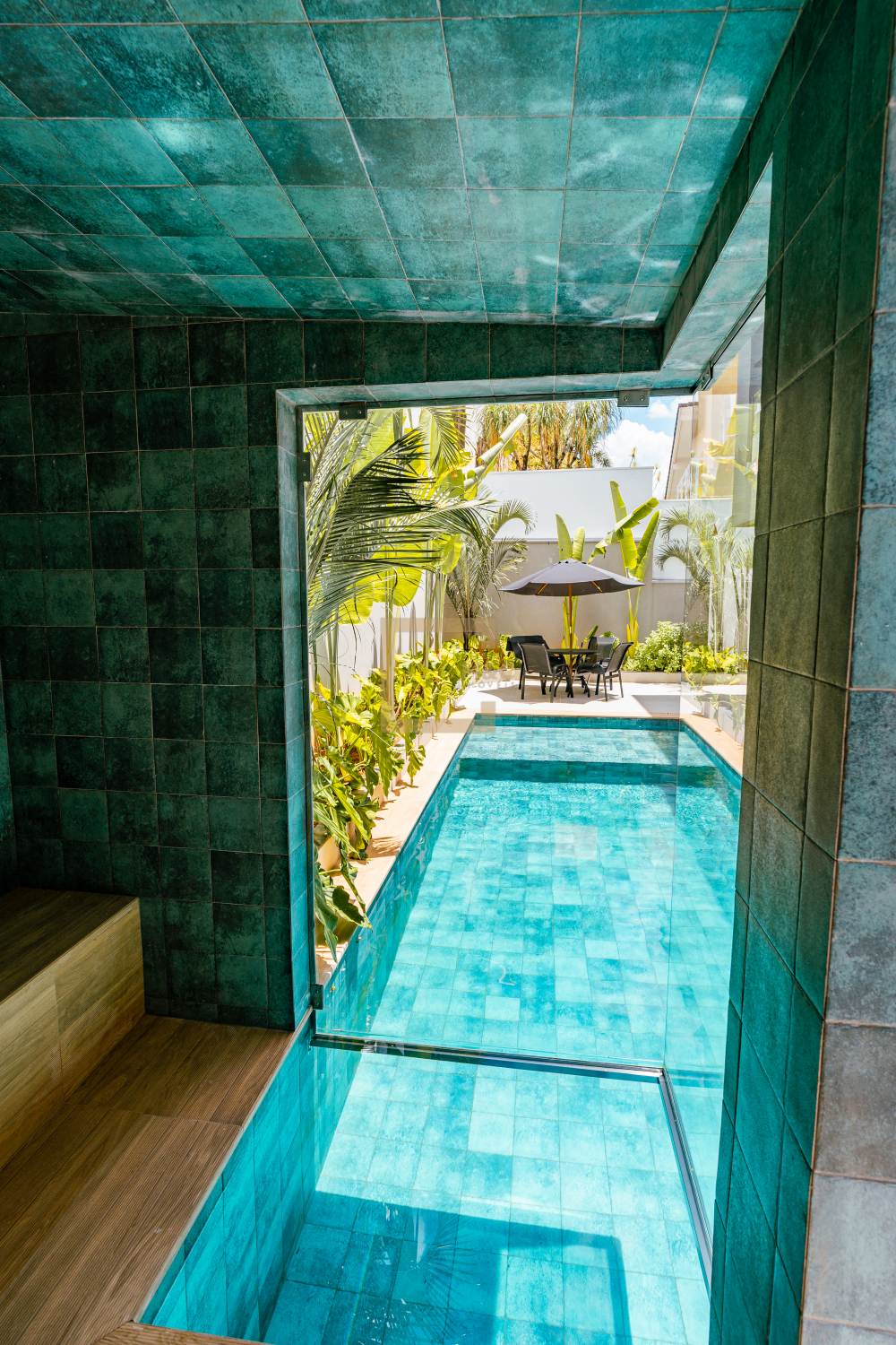 Piscina (8 x 2,9 - 25 mil litros) com aquecimento (trocador de calor para 60 mil litros). Sauna úmida para 6 pessoas, com chuveiro de teto e passagem interna para a piscina.