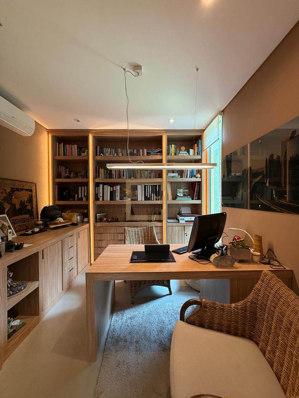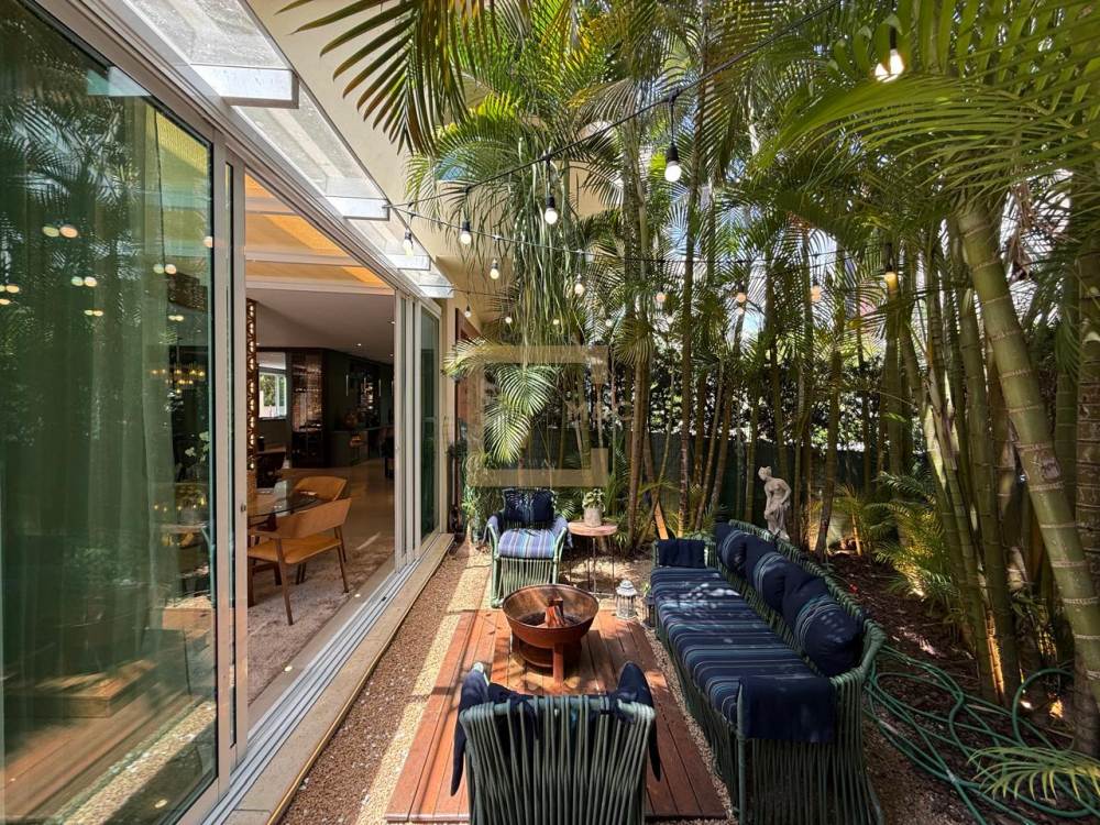 Integração do living com o lazer, onde materiais modernos e rústicos conversam harmoniosamente no projeto,
