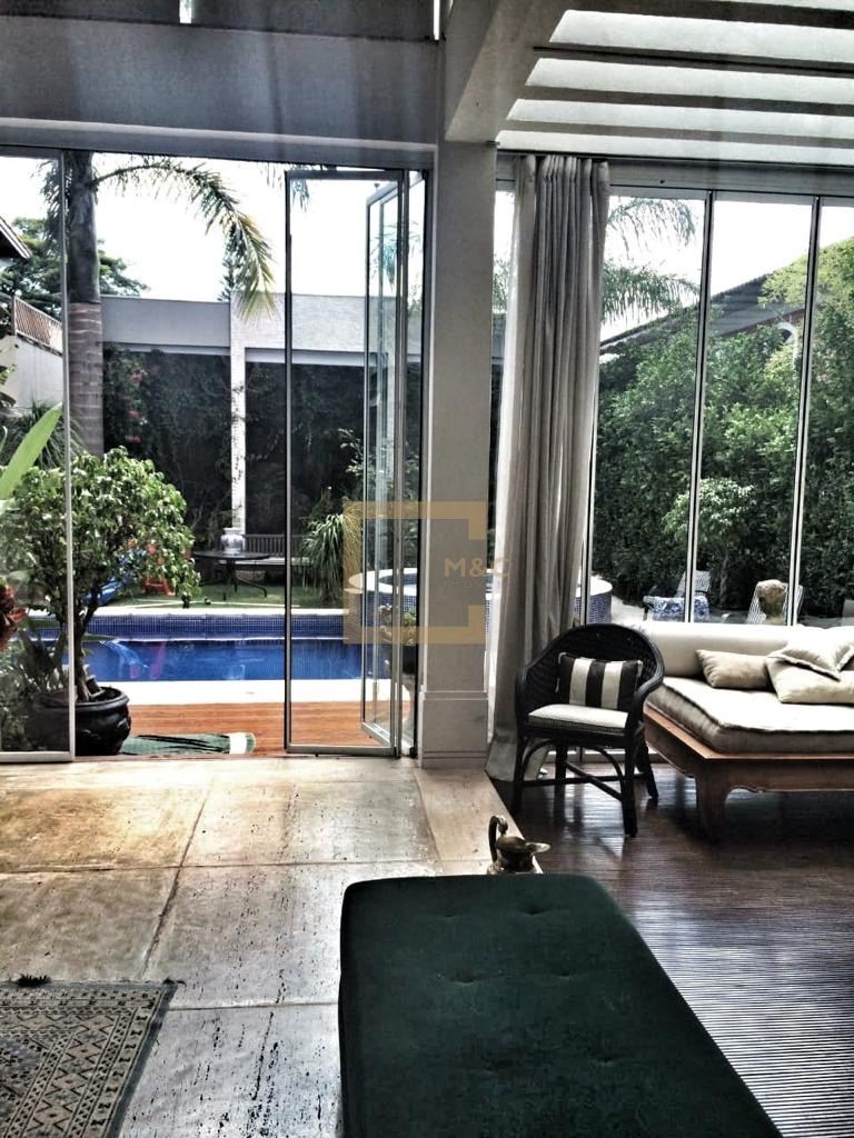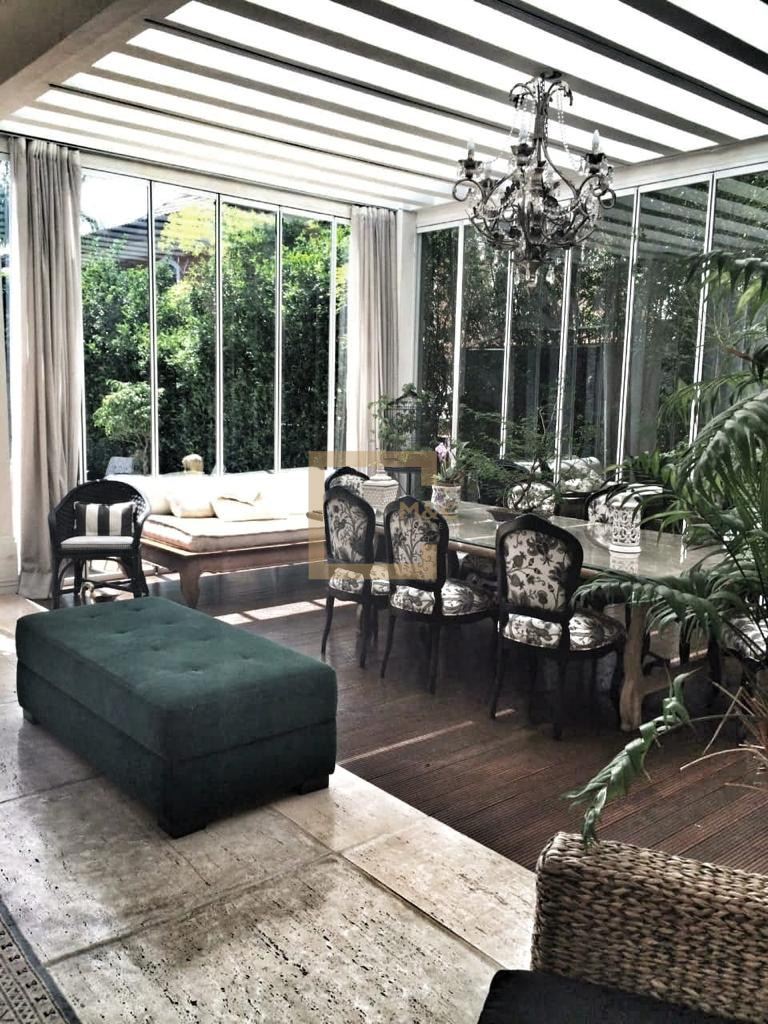 Área de lazer integrada, toda envidraçada com muito verde.