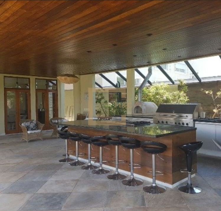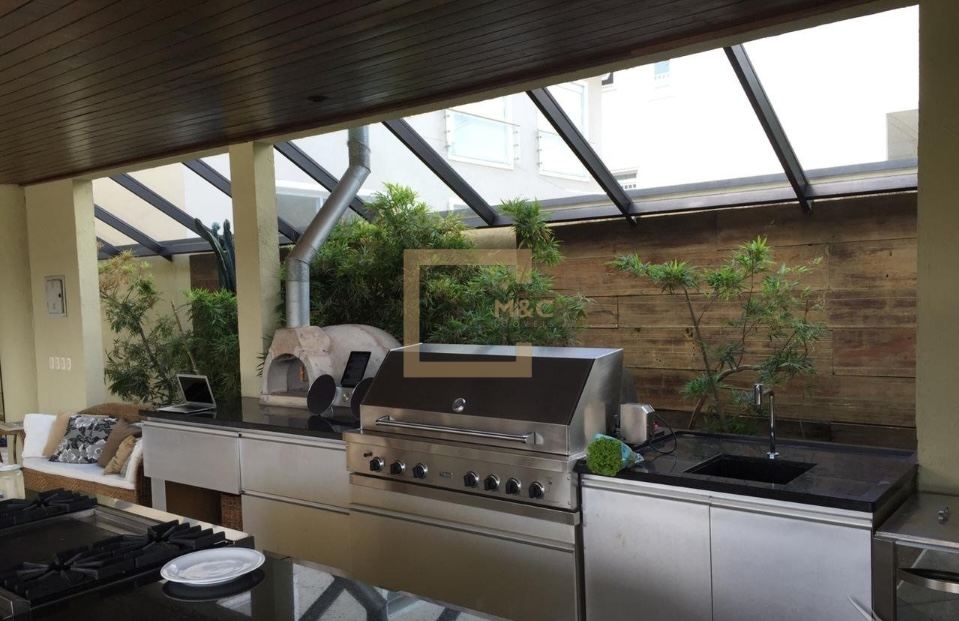Área gourmet com churrasqueira, forno de pizza e piscina.