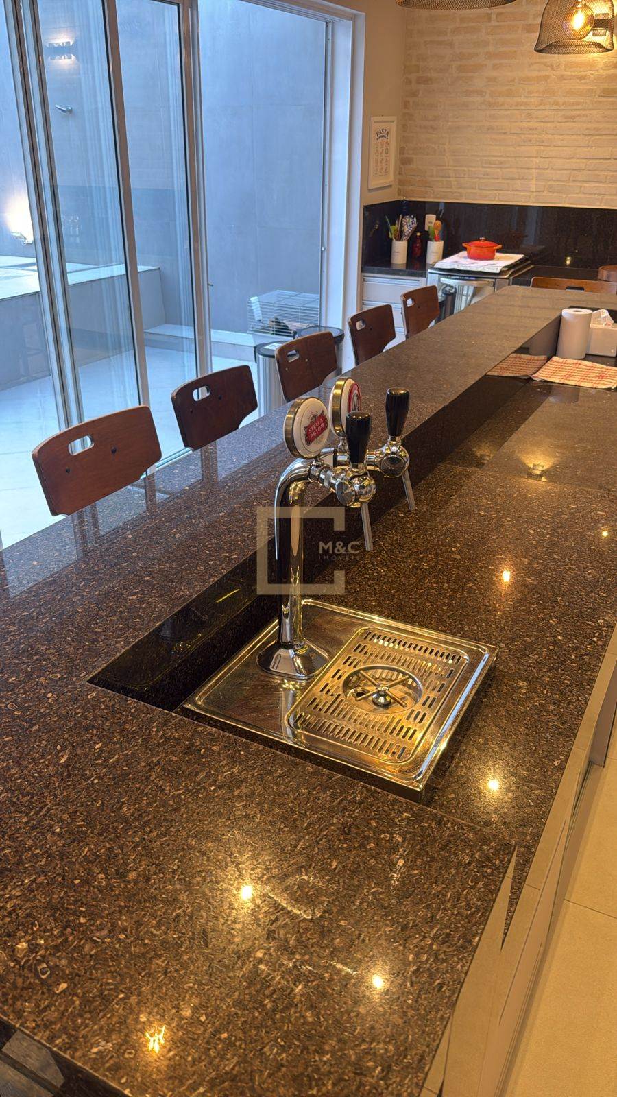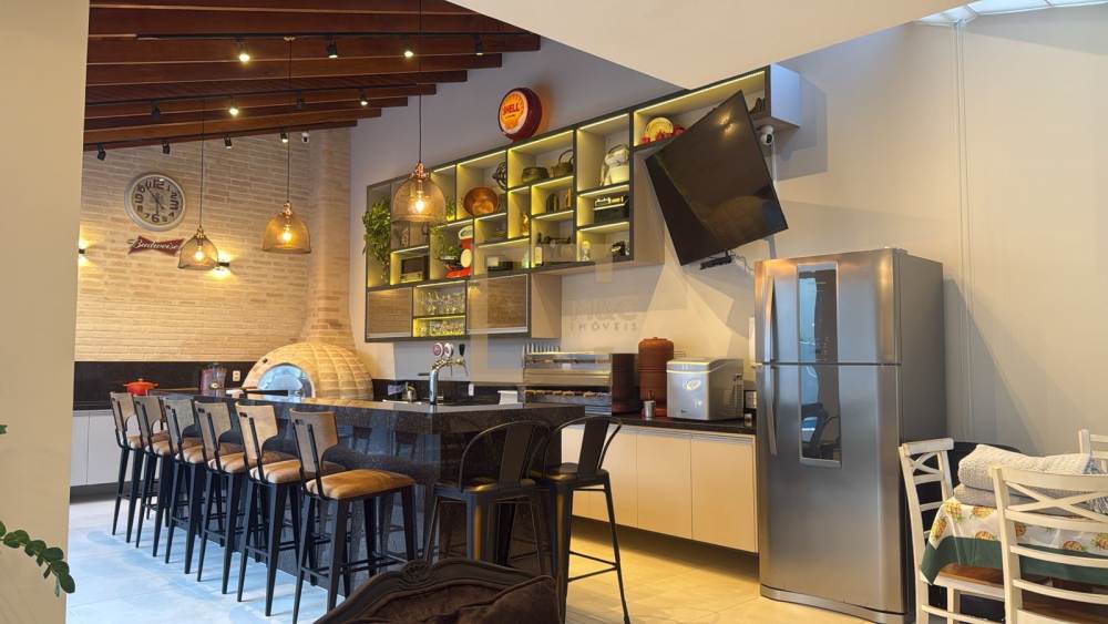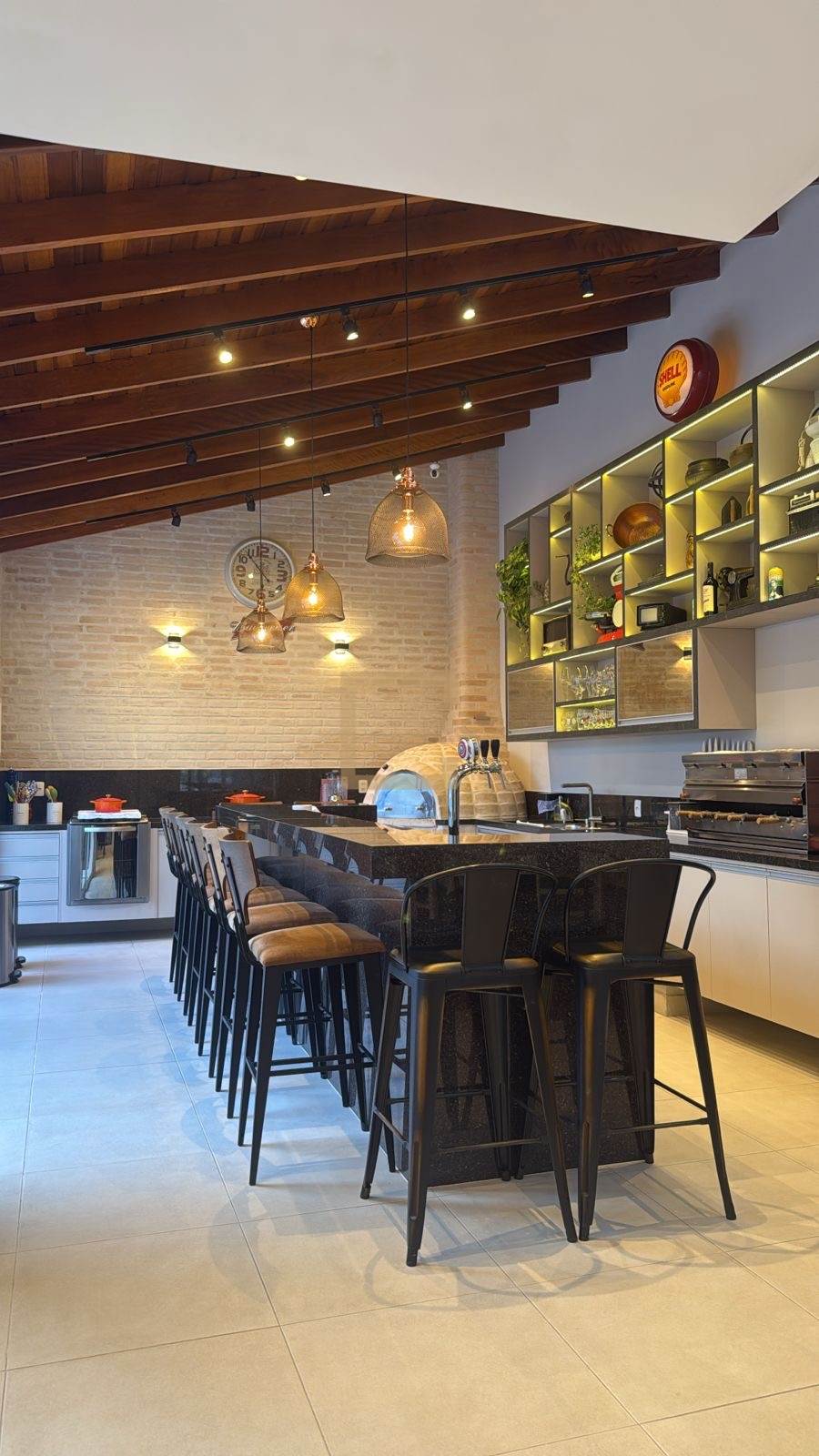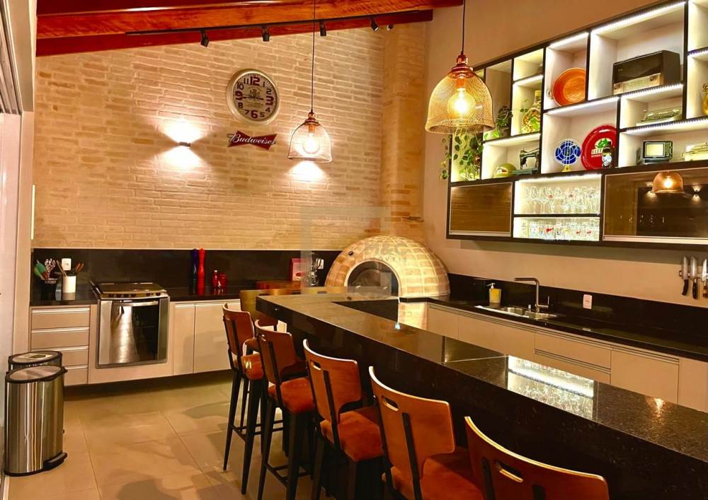 Area gourmet integrada à piscina, equipada com churrasqueira e forno de pizza.