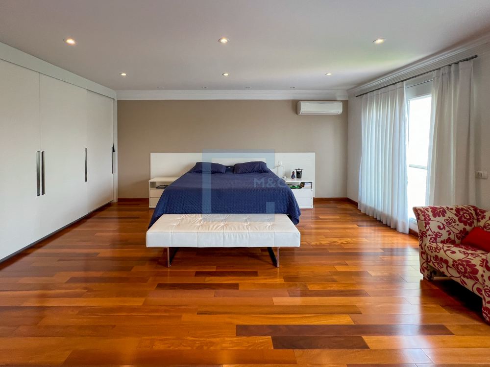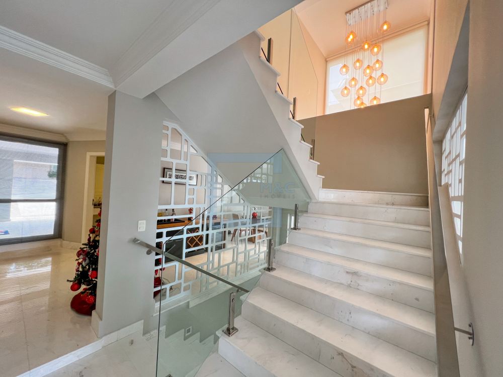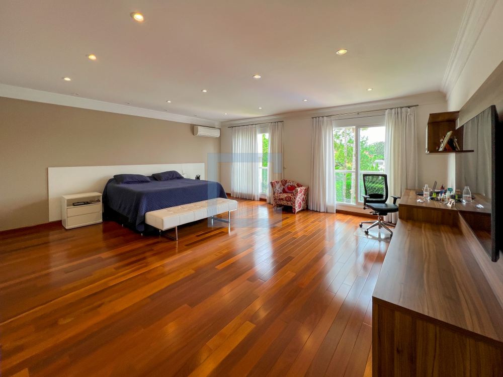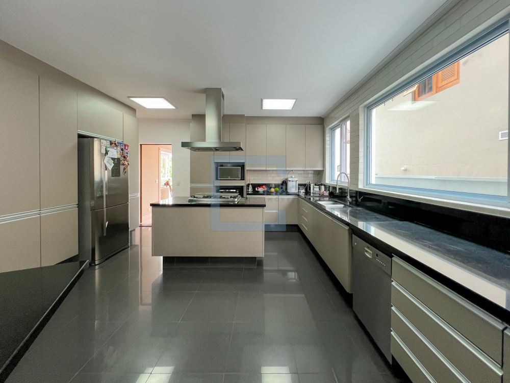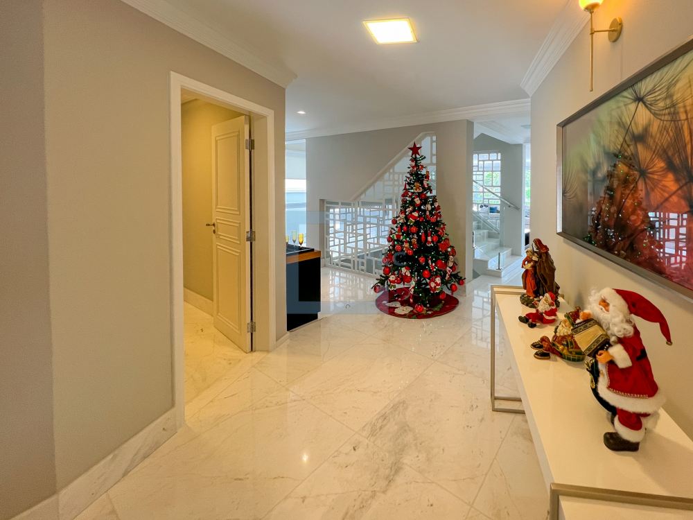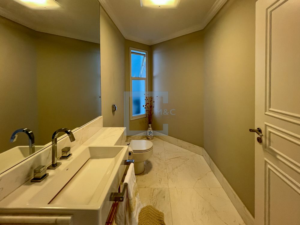 Essa belíssima residência, em um estilo moderno, é ampla, clara e arejada, proporcionando uma vista maravilhosa. A sala possui três ambientes e é revestida em mármore piguês. Há também um escritório e as quatro suítes, sendo a suíte principal com 40m², todas com pisos em indusparquet e ar-condicionado. As janelas são de alumínio branco e apresentam venezianas automatizadas.