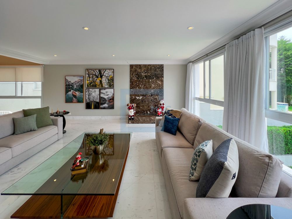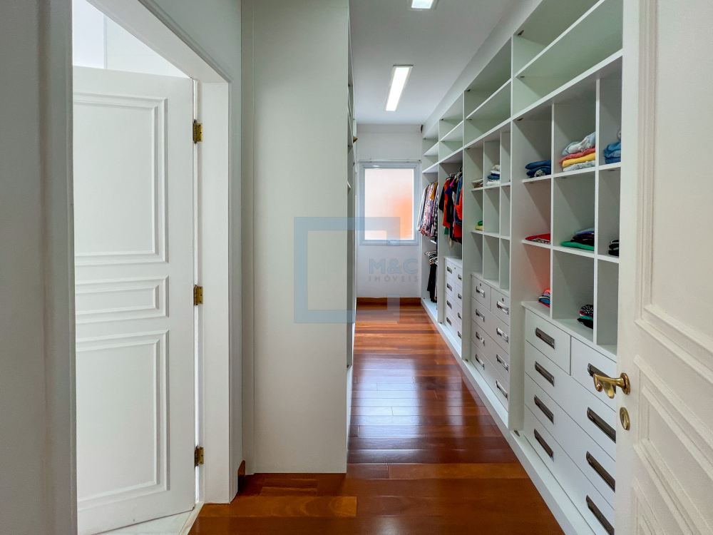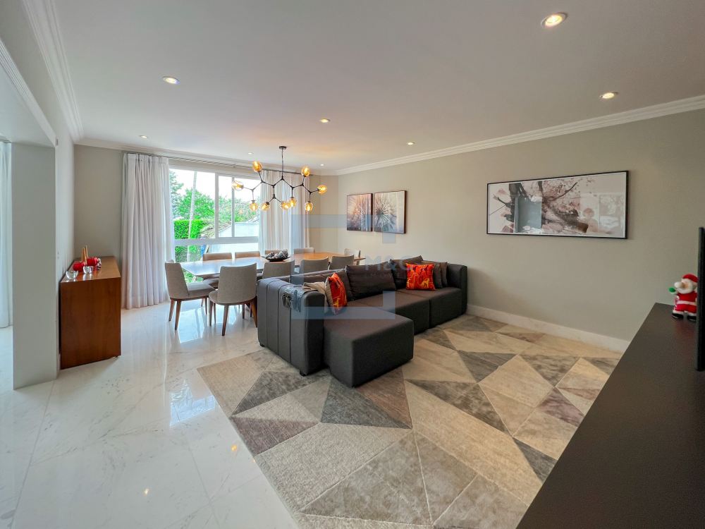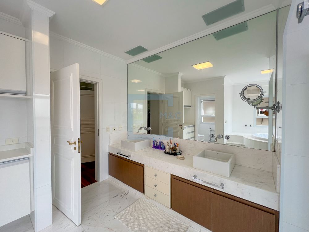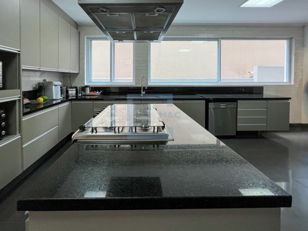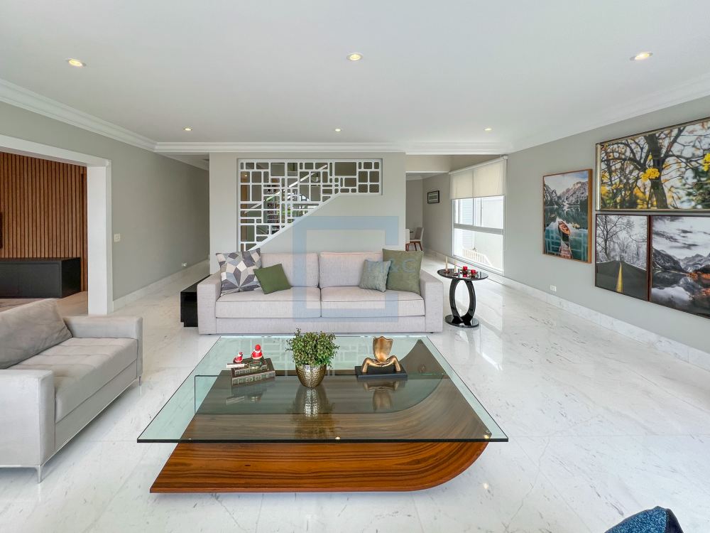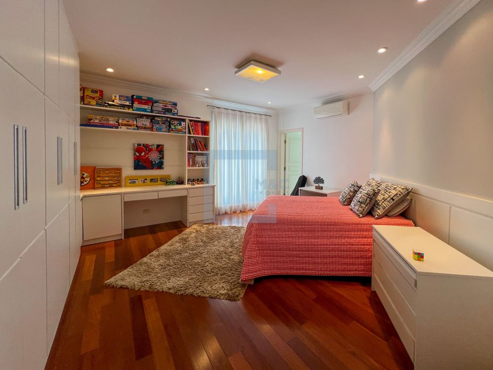 Essa belíssima residência, em um estilo moderno, é ampla, clara e arejada, proporcionando uma vista maravilhosa. A sala possui três ambientes e é revestida em mármore piguês. Há também um escritório e as quatro suítes, sendo a suíte principal com 40m², todas com pisos em indusparquet e ar-condicionado. As janelas são de alumínio branco e apresentam venezianas automatizadas.
