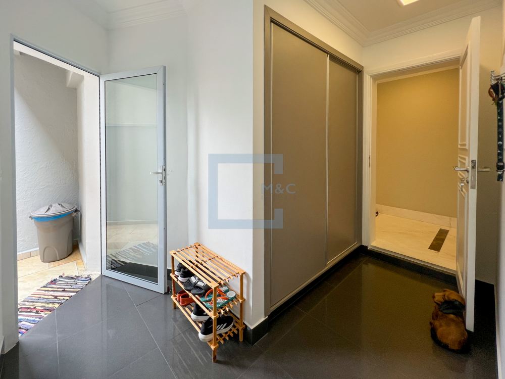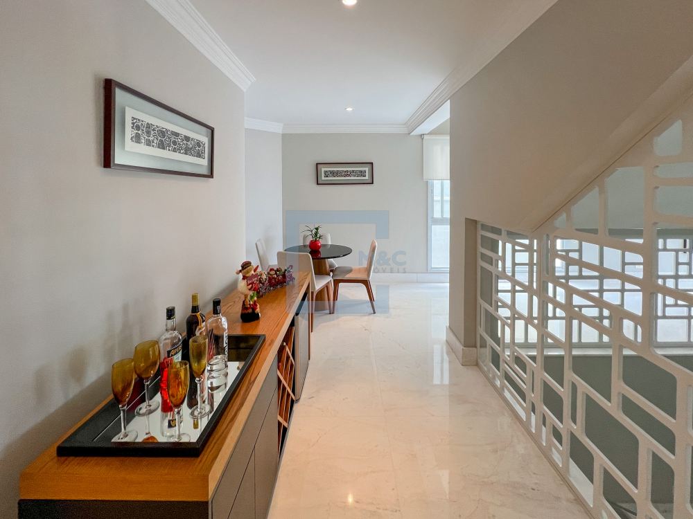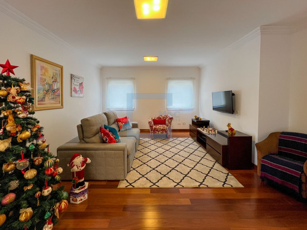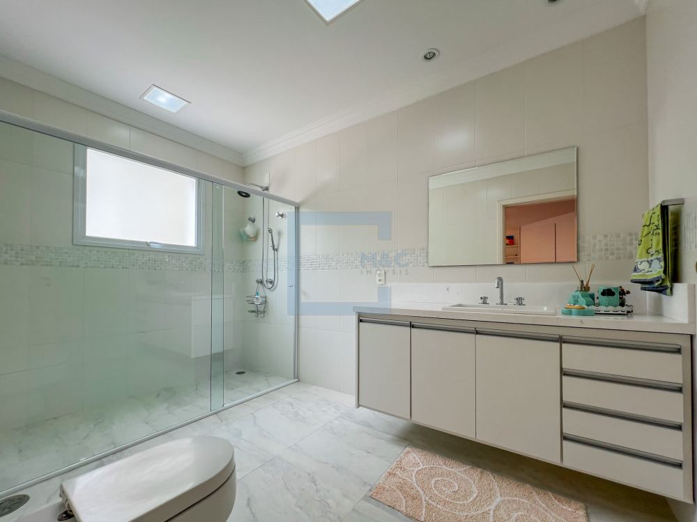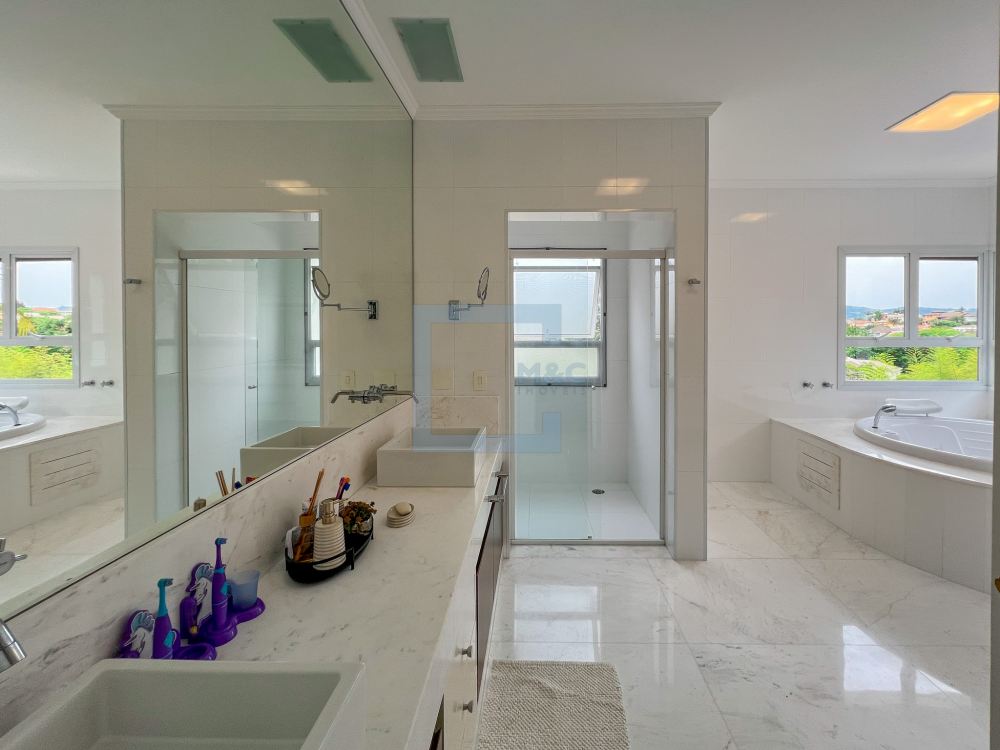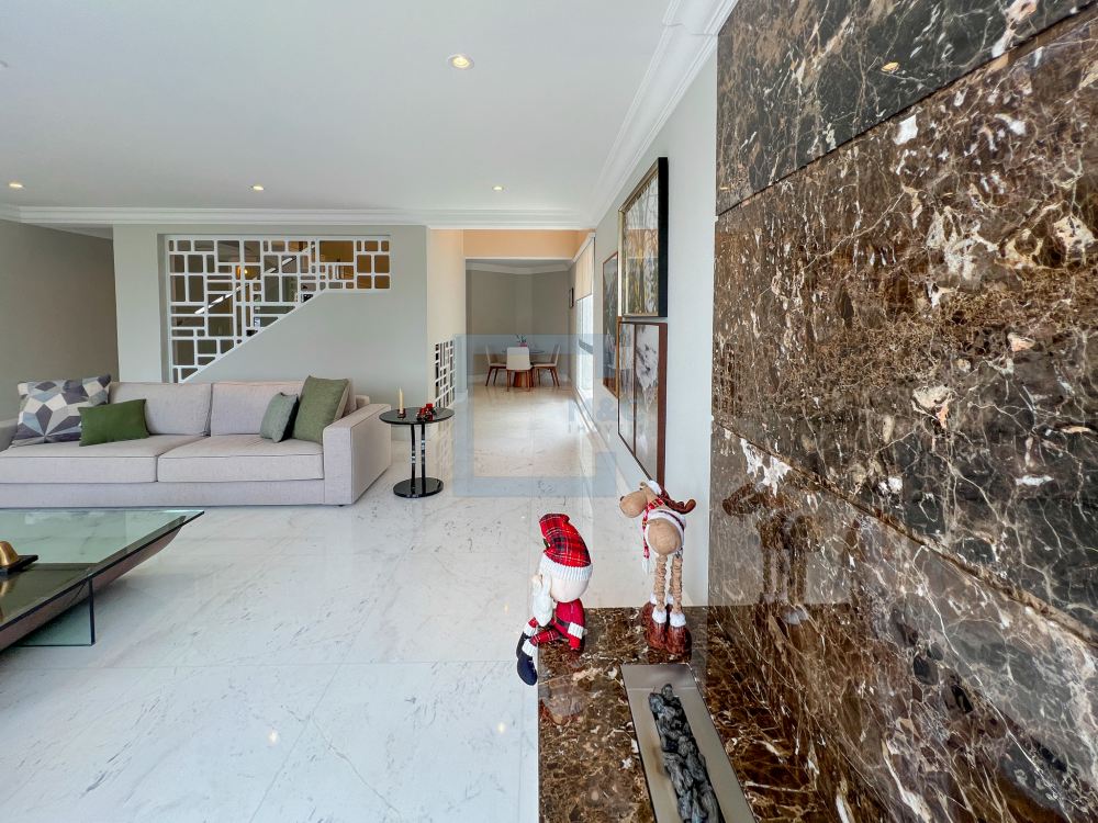 Essa belíssima residência, em um estilo moderno, é ampla, clara e arejada, proporcionando uma vista maravilhosa. A sala possui três ambientes e é revestida em mármore piguês. Há também um escritório e as quatro suítes, sendo a suíte principal com 40m², todas com pisos em indusparquet e ar-condicionado. As janelas são de alumínio branco e apresentam venezianas automatizadas.