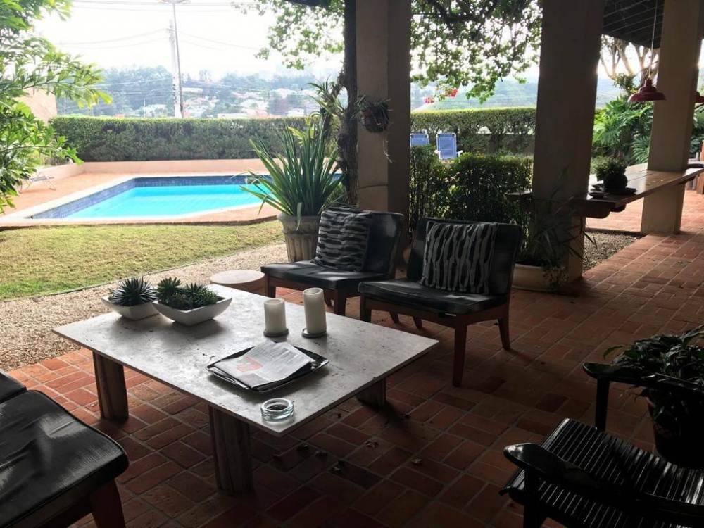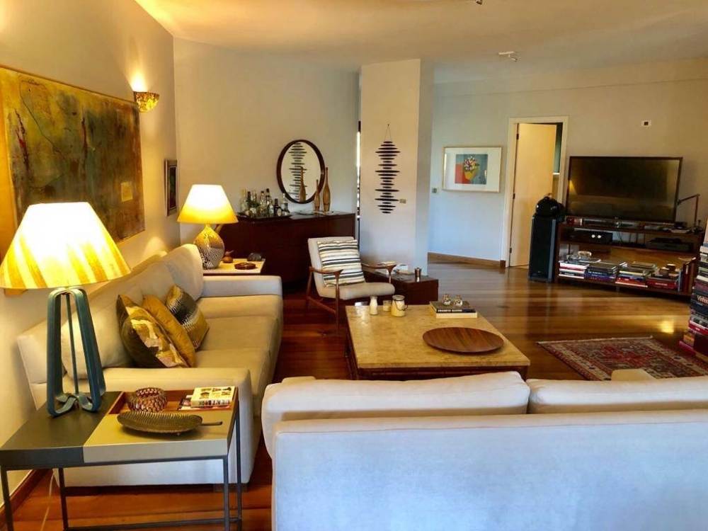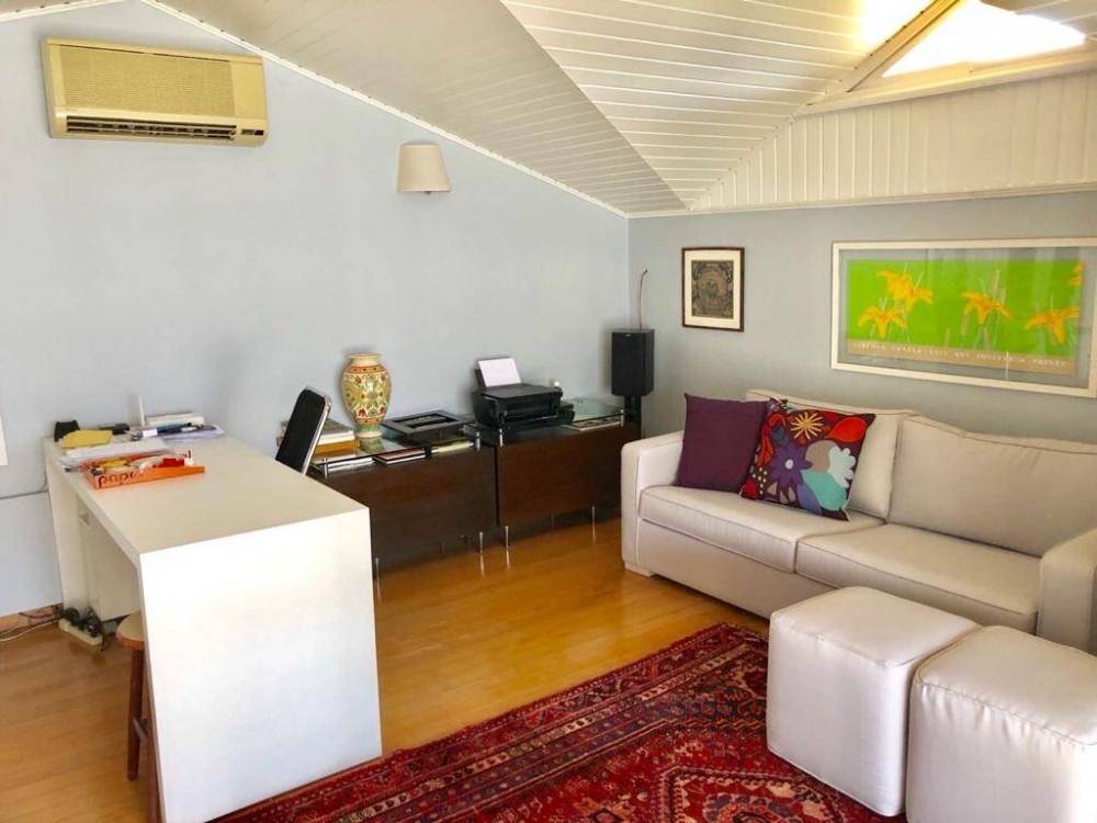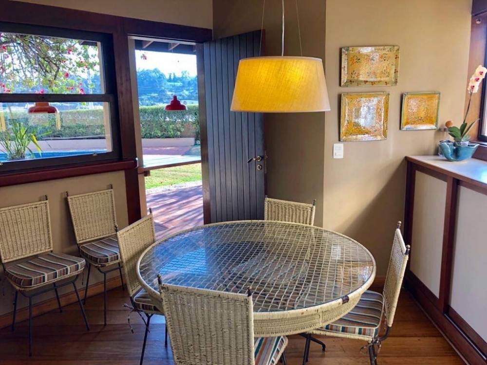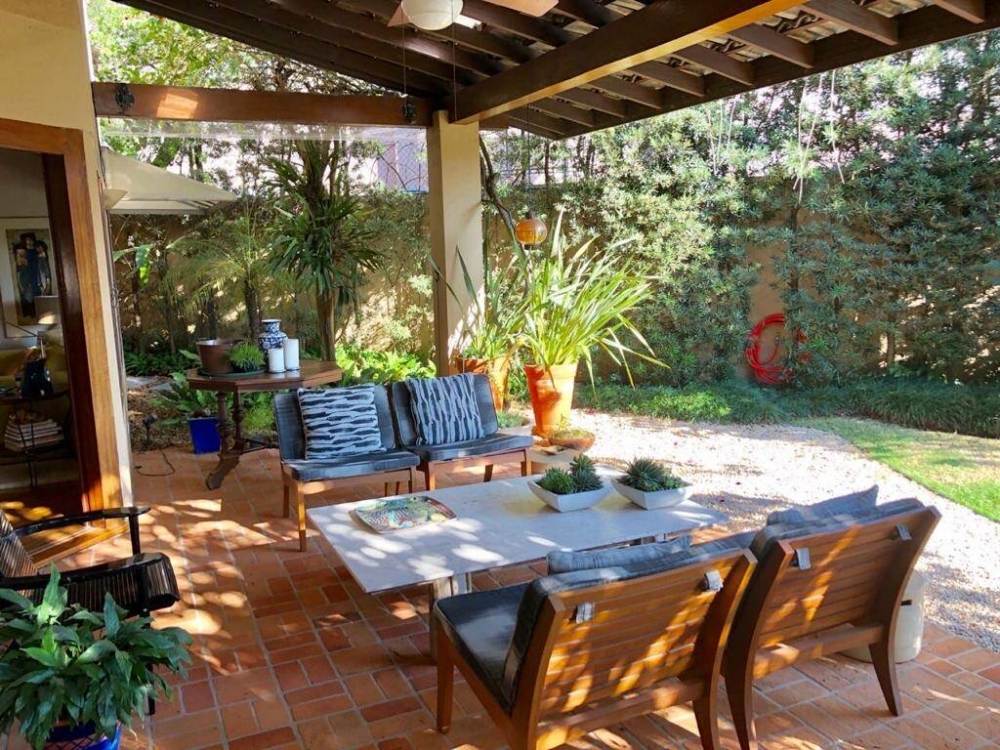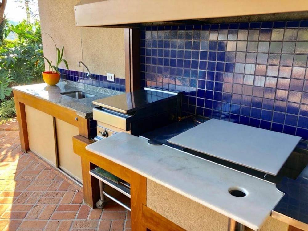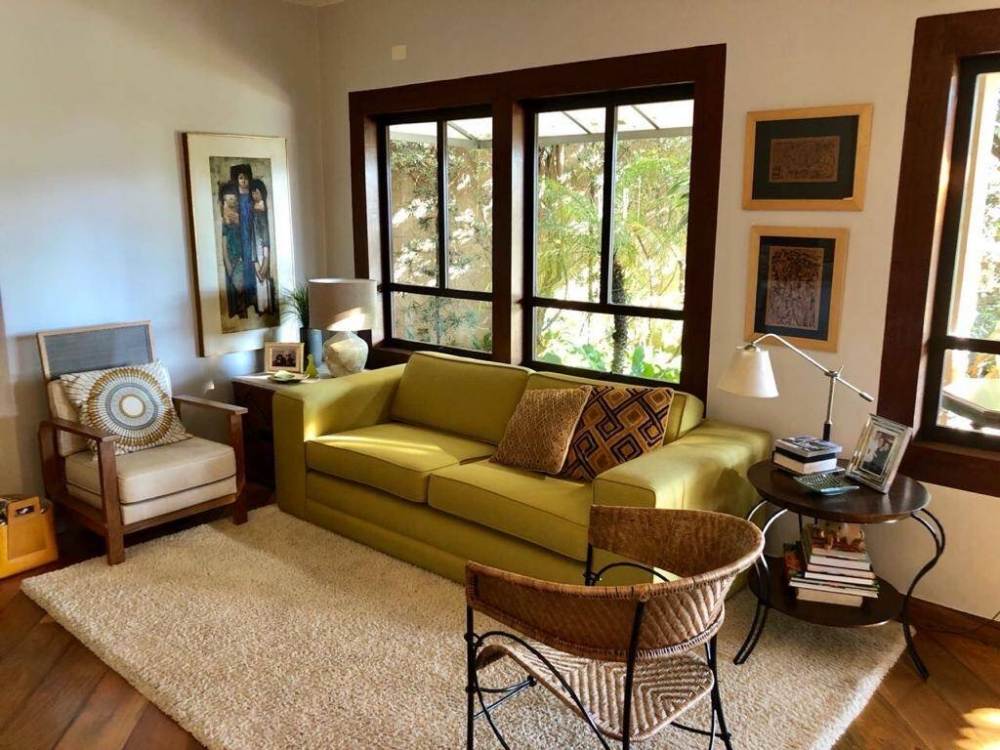 Living em 3 ambientes, com lareira e varanda para o jardim. Copa e cozinha ao lado do espaço gourmet, que fica na varanda.