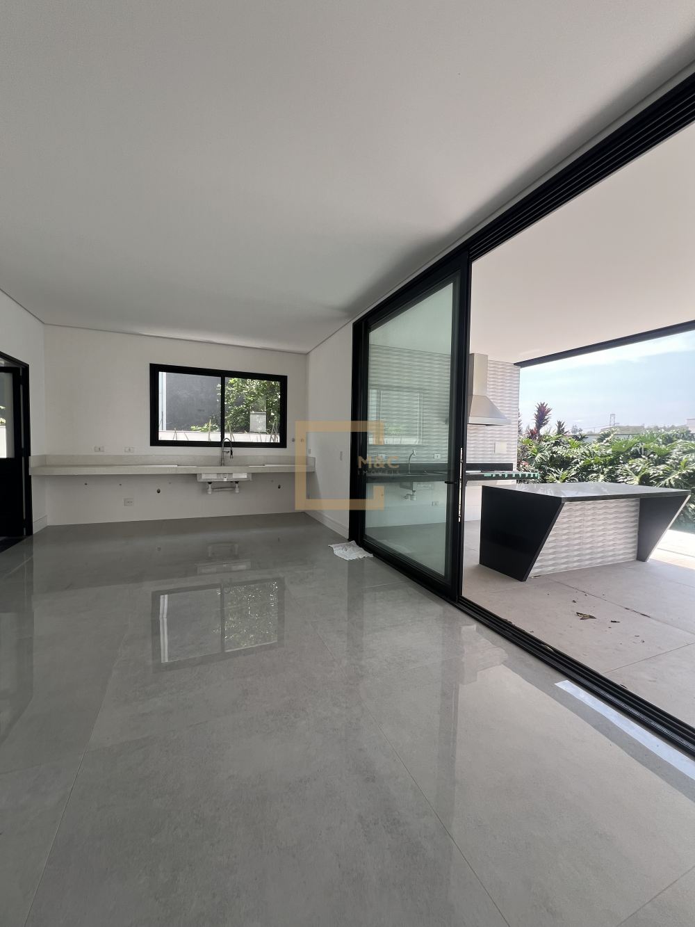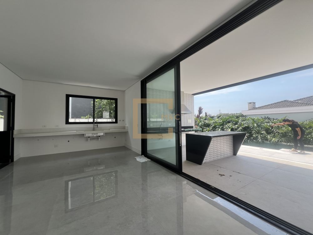 O living é espaçoso, dividido em salas de TV, estar e jantar, e se integra a uma ampla cozinha, bela área gourmet com churrasqueira a carvão e prainha com bordas em mármore.