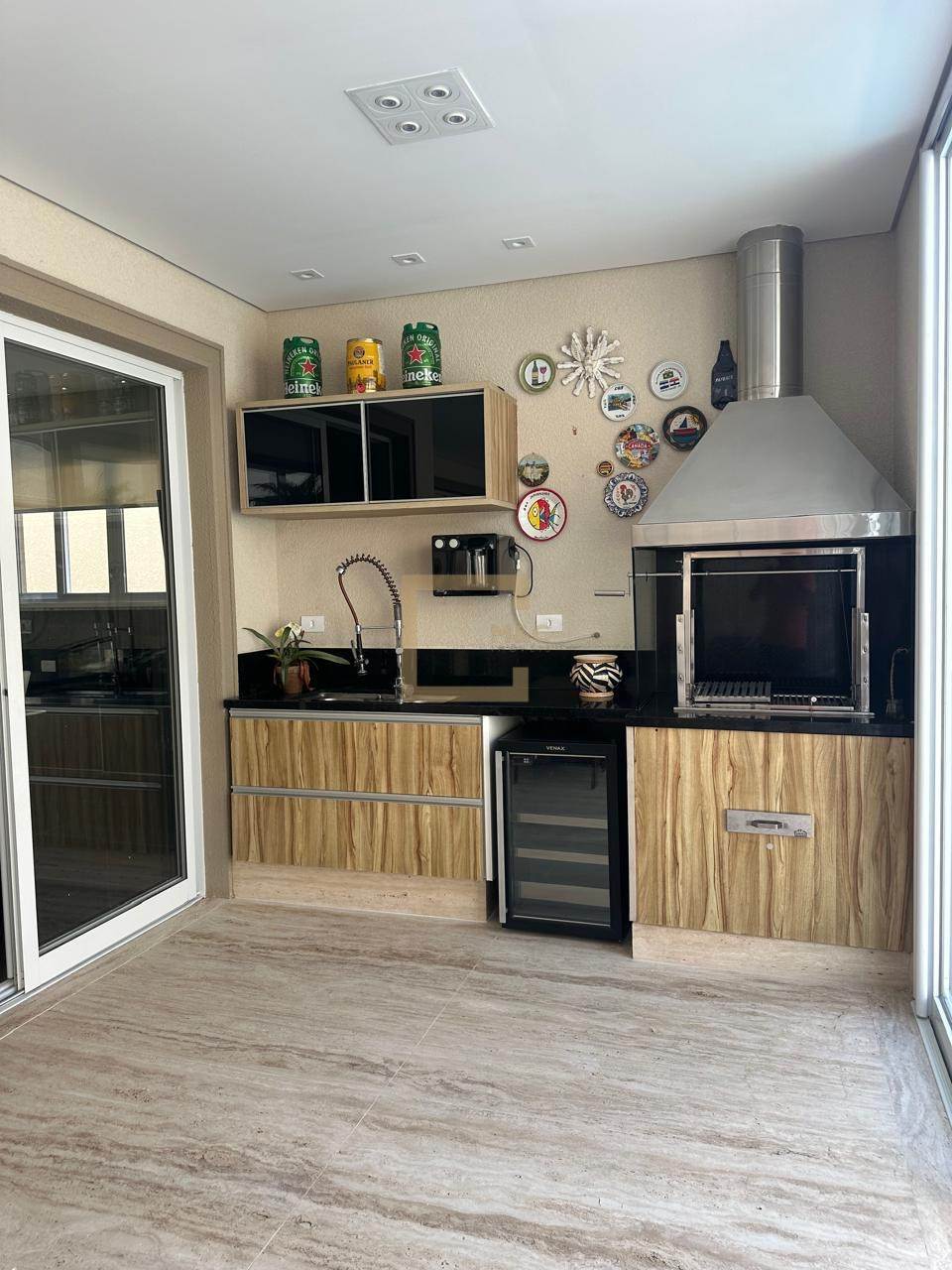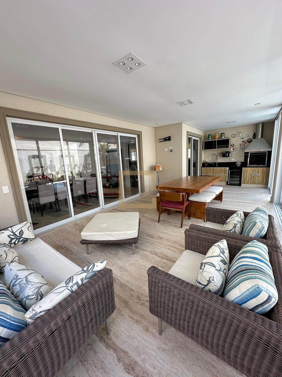 Área gourmet climatizada, com churrasqueira embutida e integração com a sala de jantar e a piscina