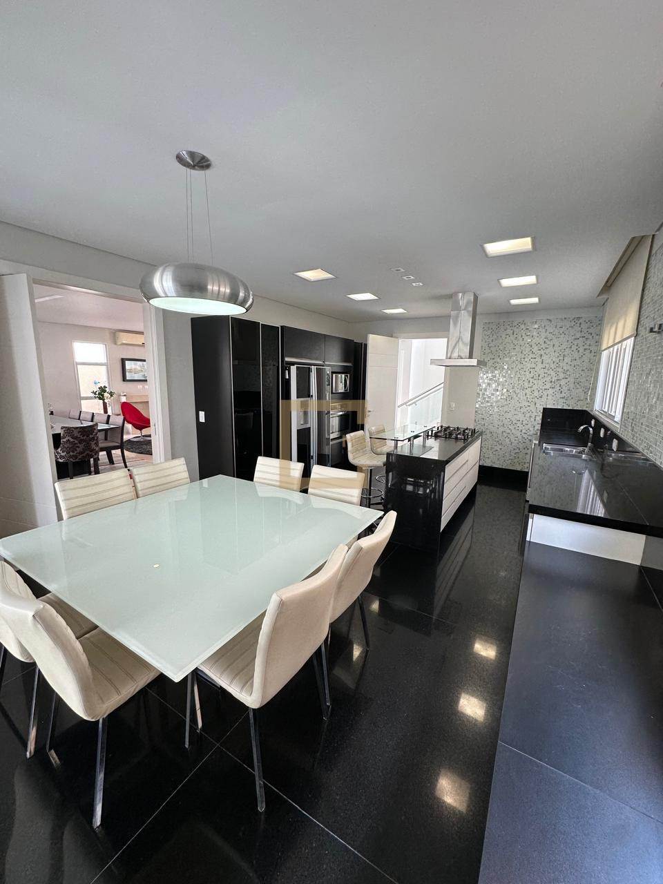 Cozinha gourmet de alto padrão, com ilha central, cooktop, forno, geladeira, lava-louças, armários sob medida, cuba dupla e mesa de apoio para 8 lugares