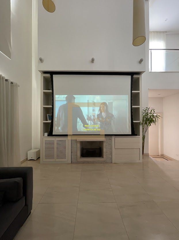 Living com telão home theater e lareira,