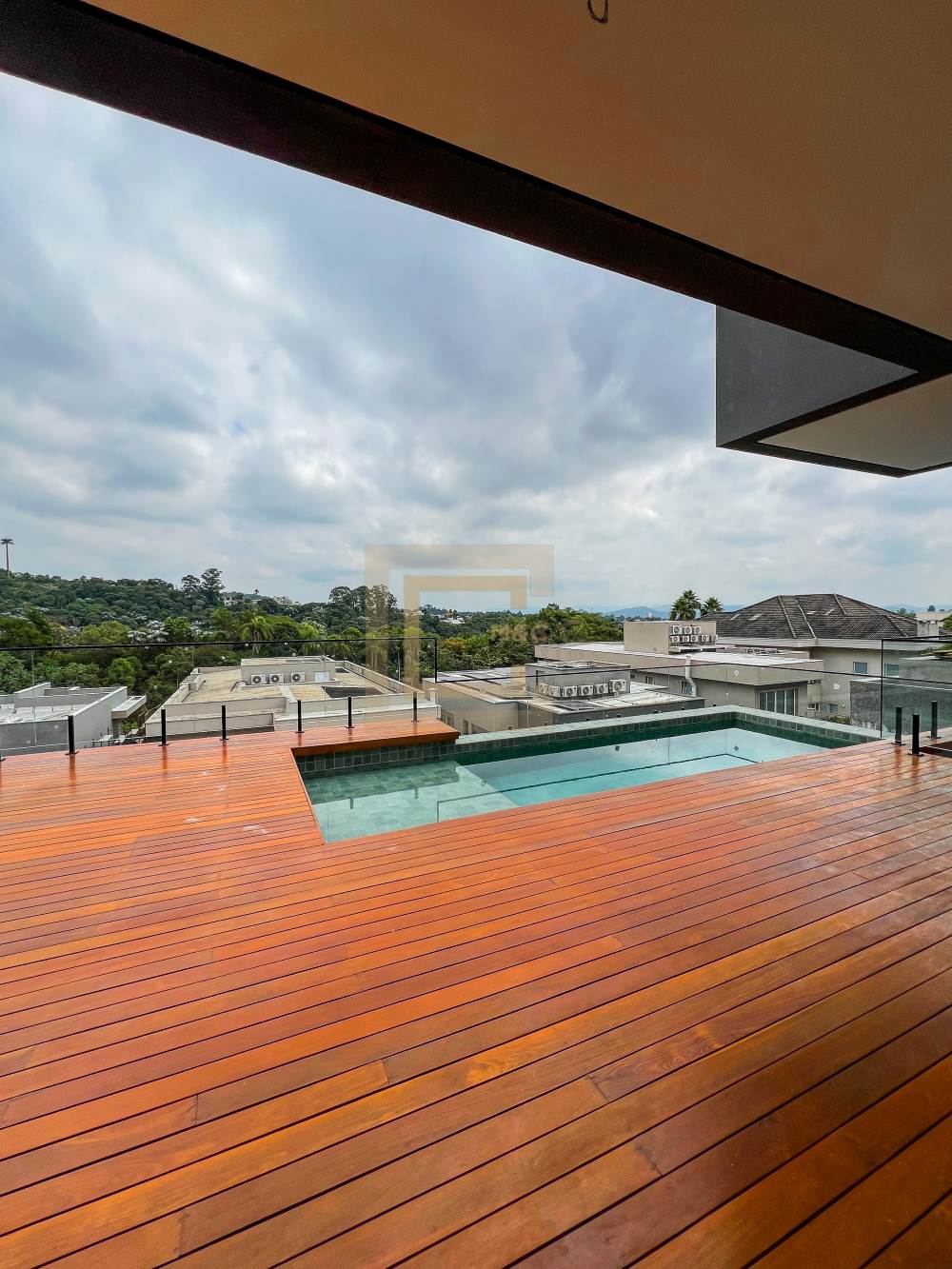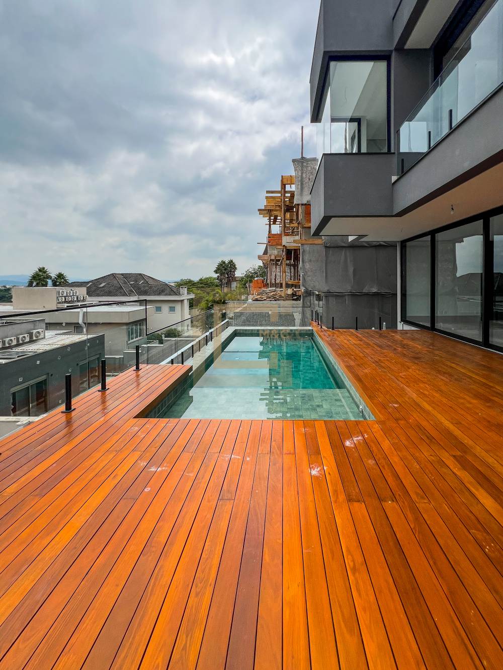 Área gourmet, piscina com borda infinita com vista para área preservada