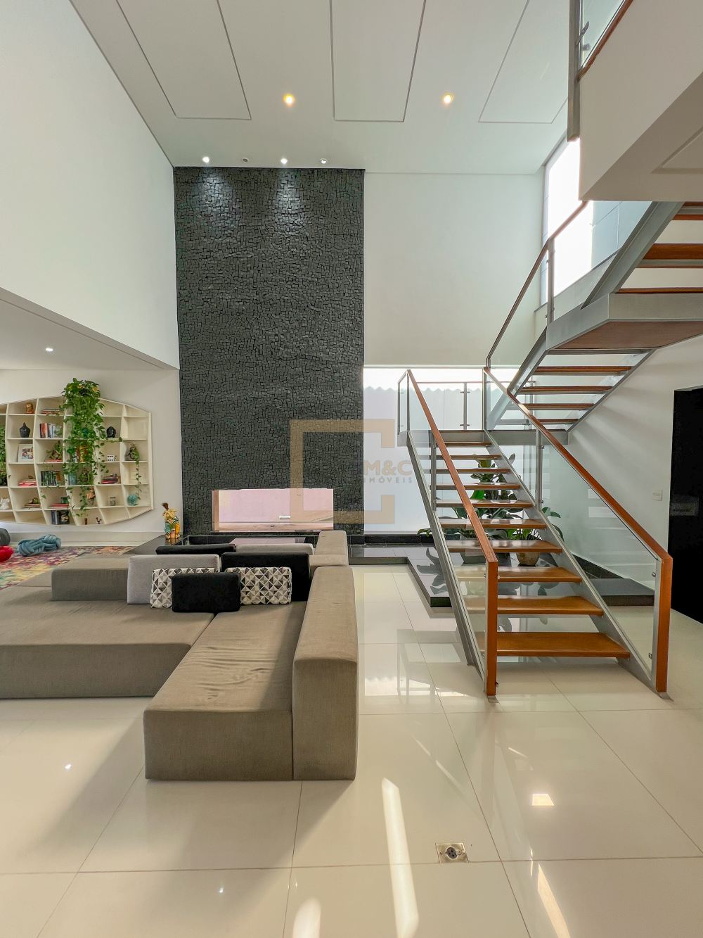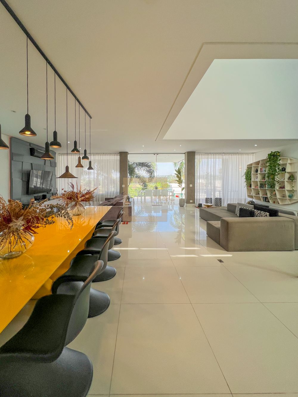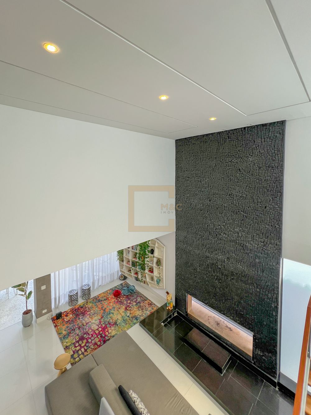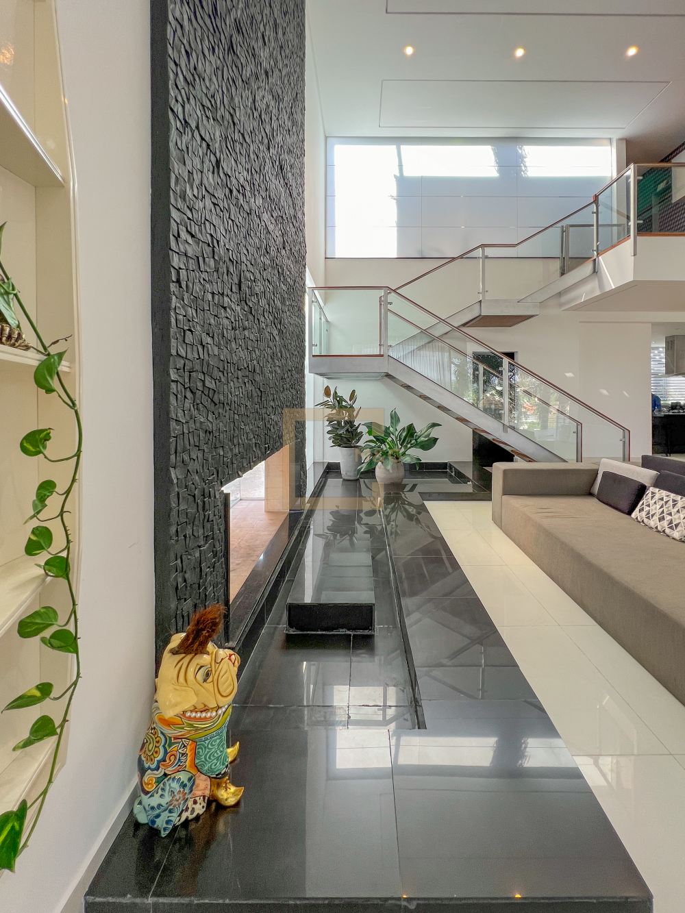 Amplo living com pe direito duplo , charmoso espelho d'água e lareira
