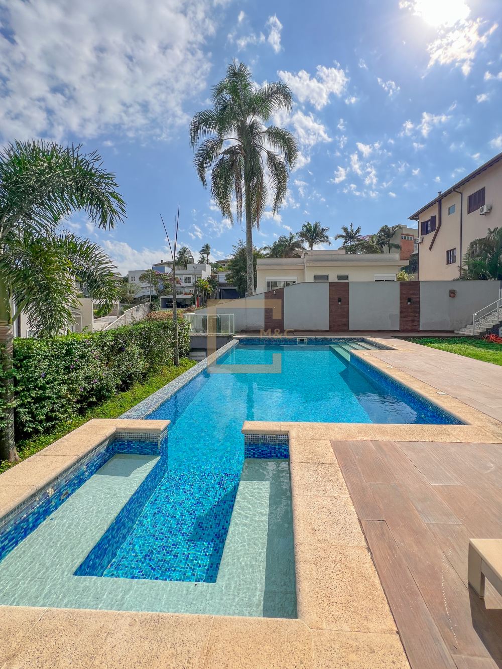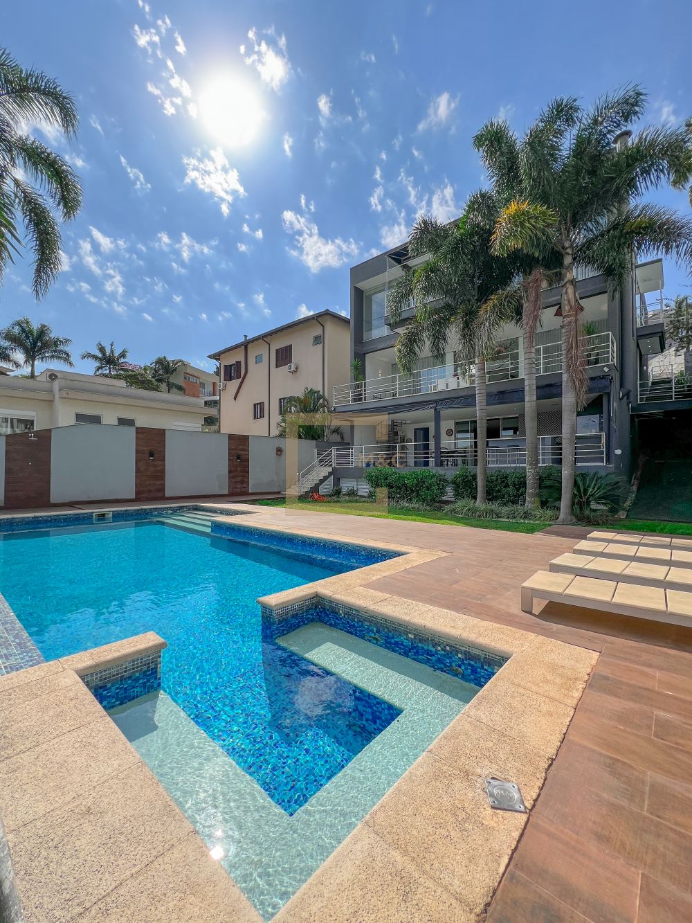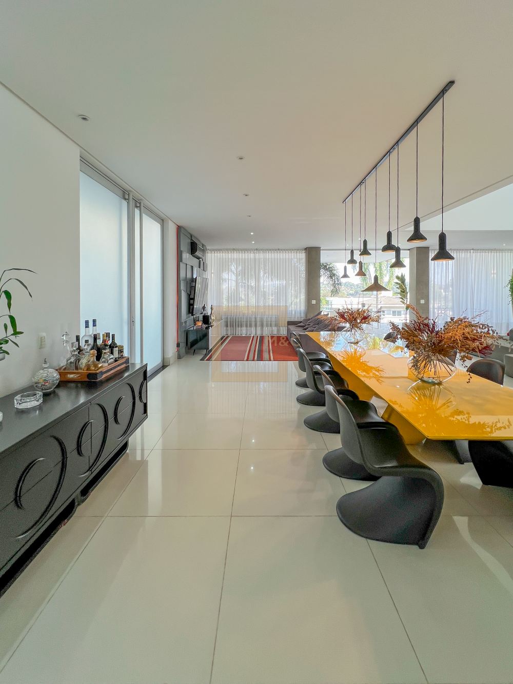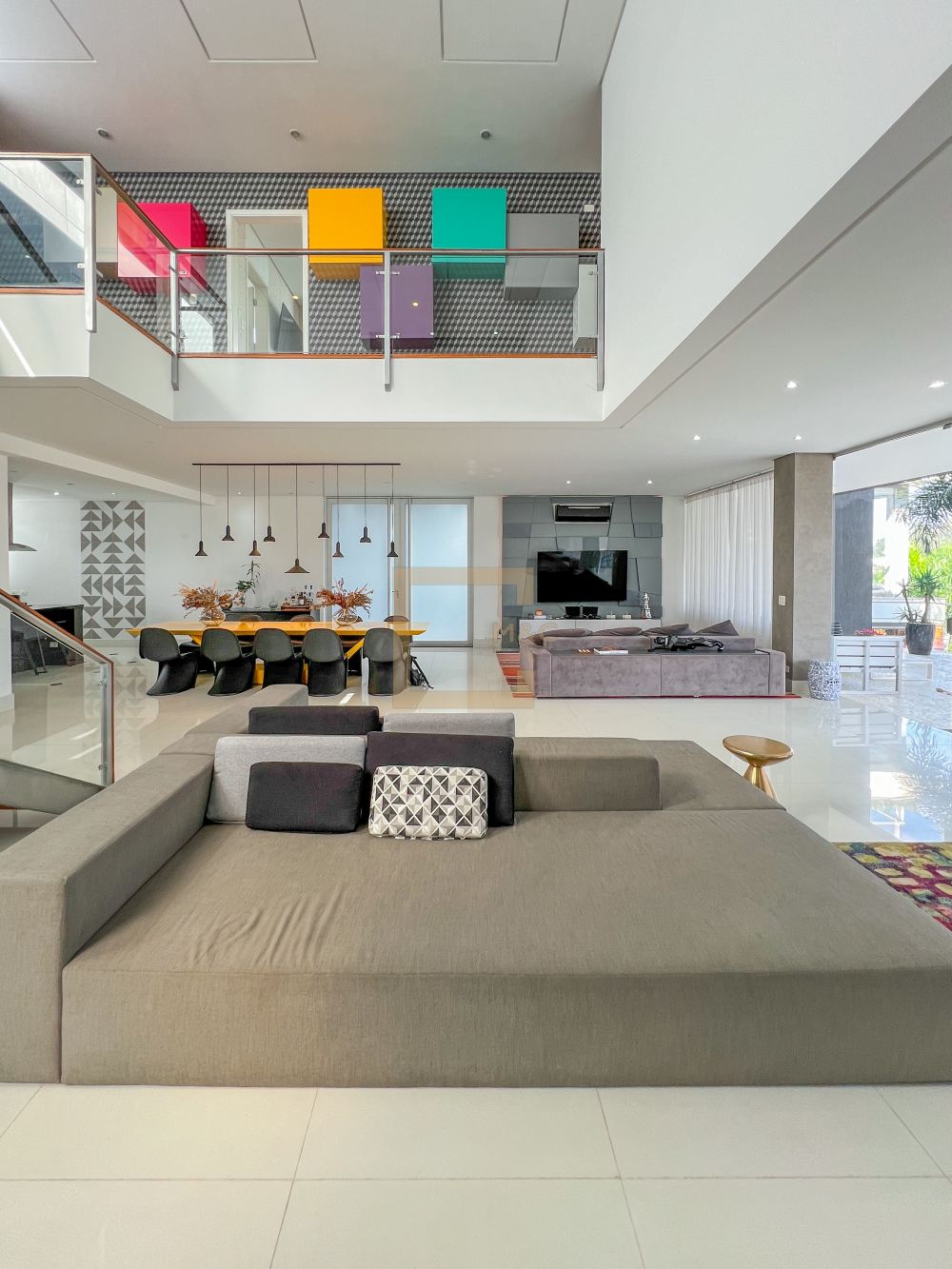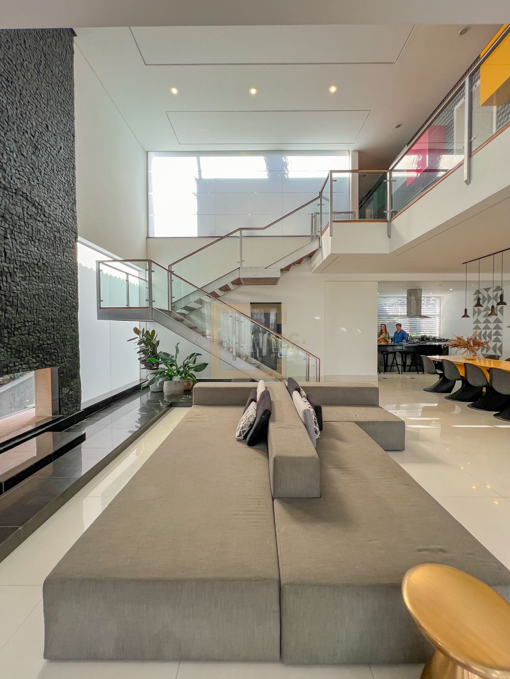 Amplo living com pe direito duplo , charmoso espelho d'água e lareira
