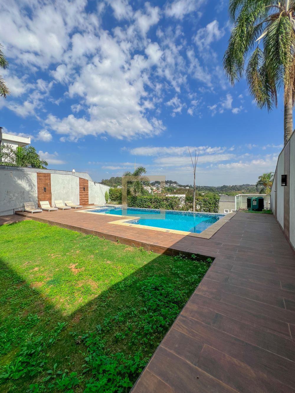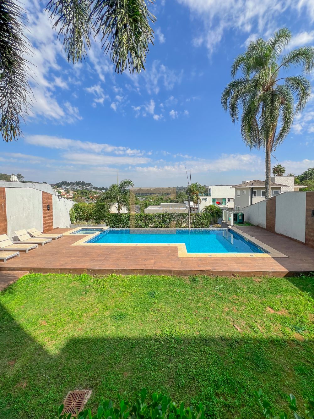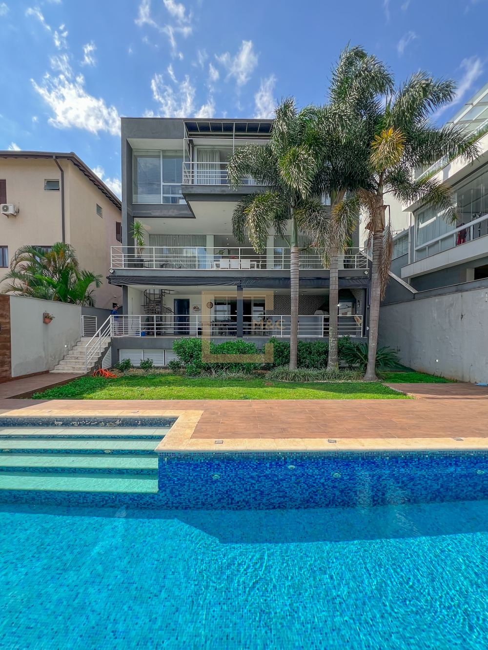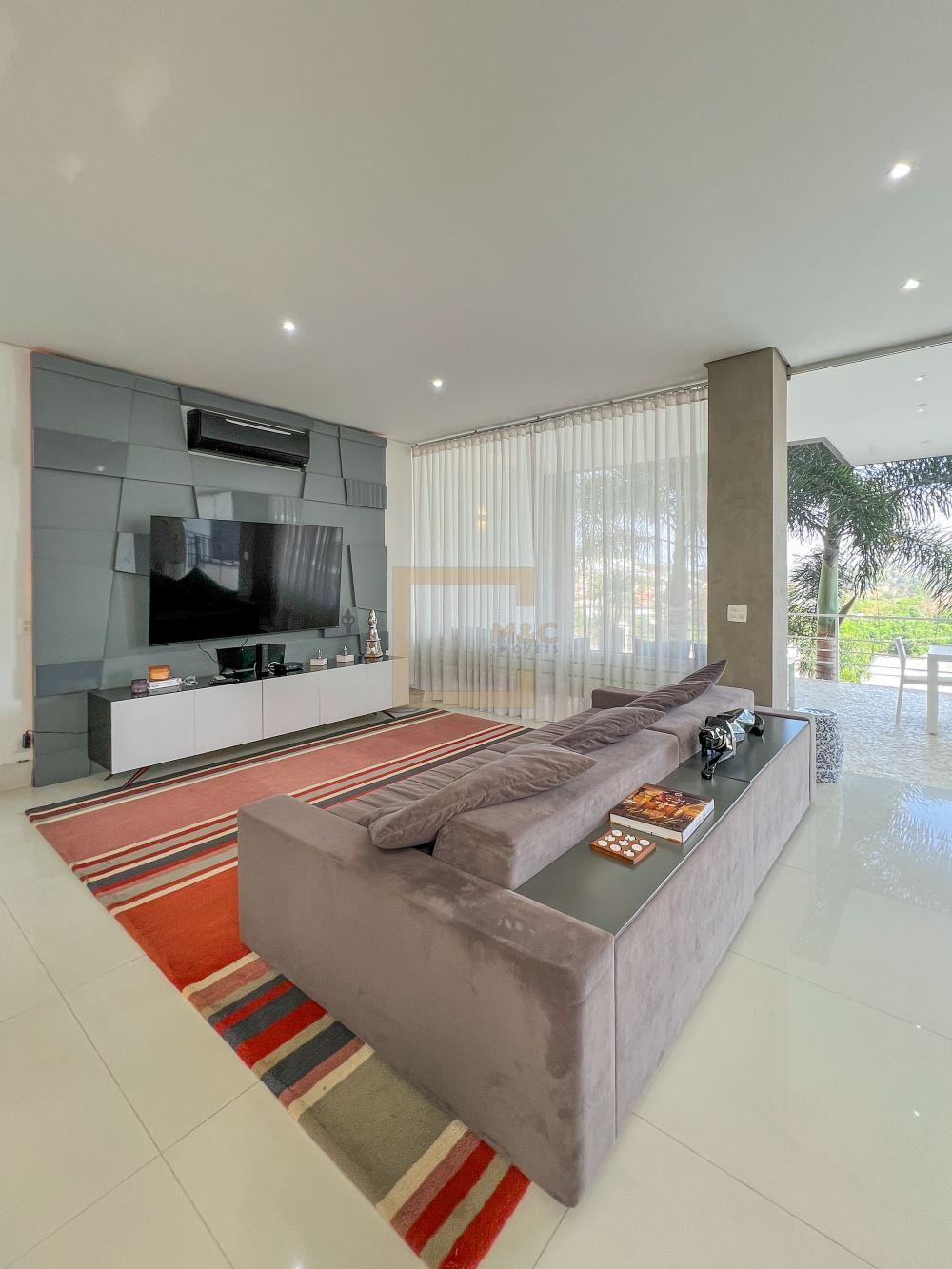 Amplo living com pe direito duplo , charmoso espelho d'água e lareira