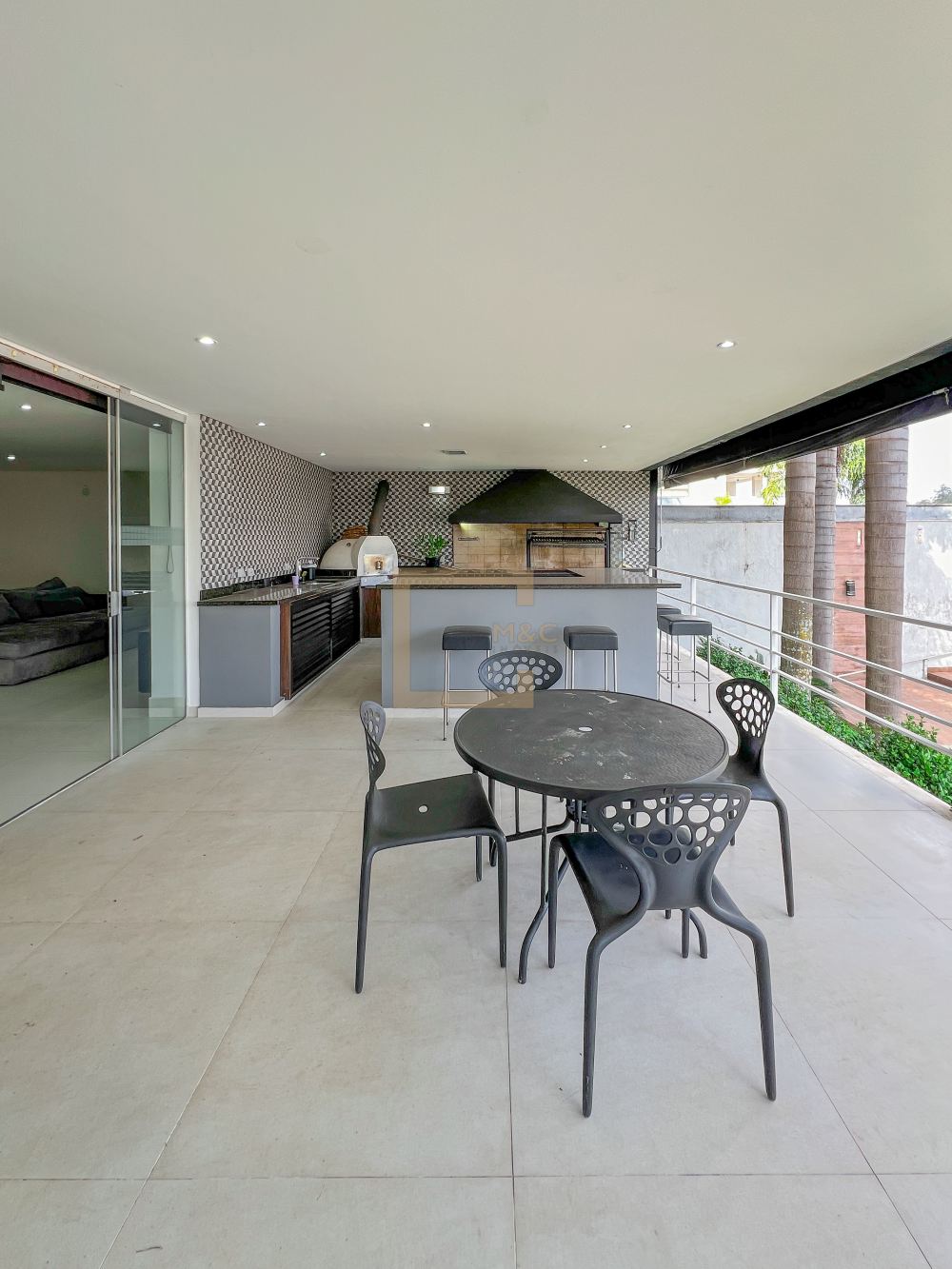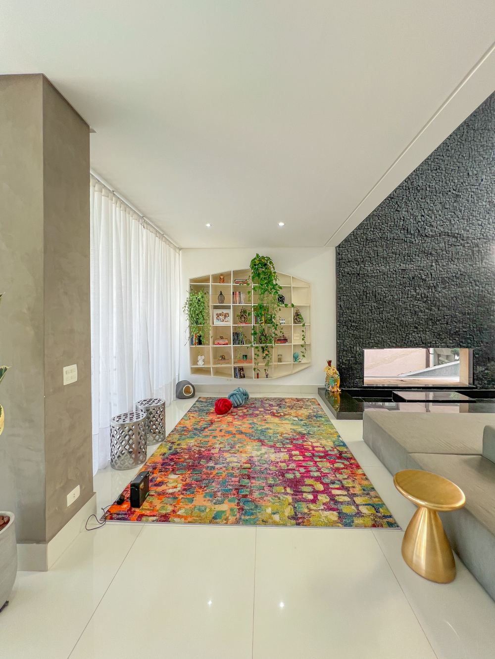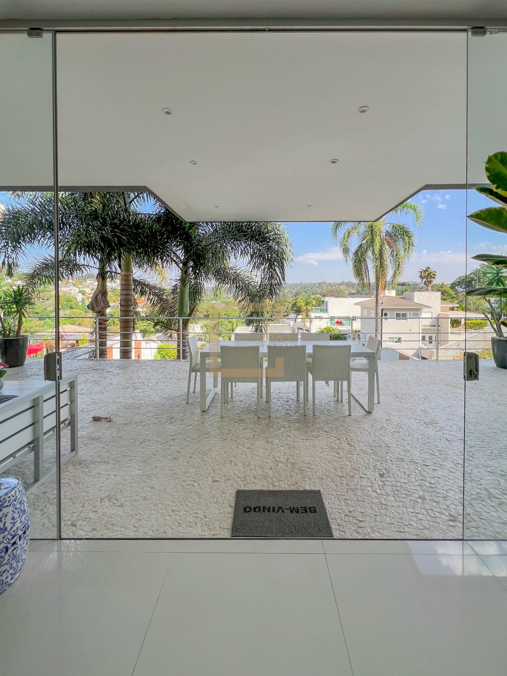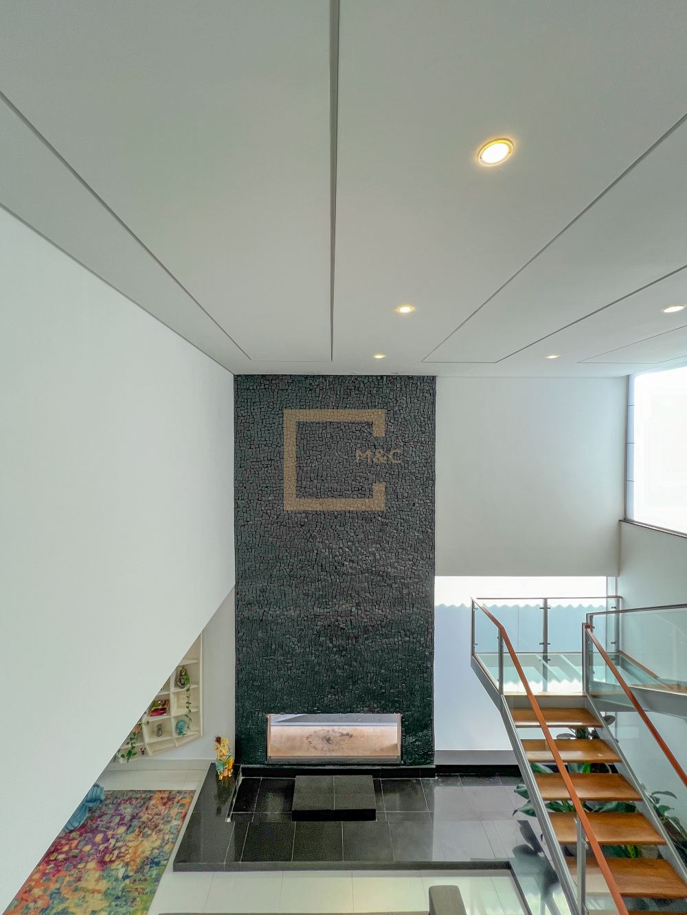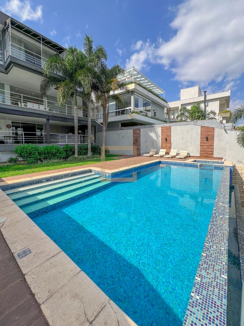 Amplo living com pe direito duplo , charmoso espelho d'água e lareira