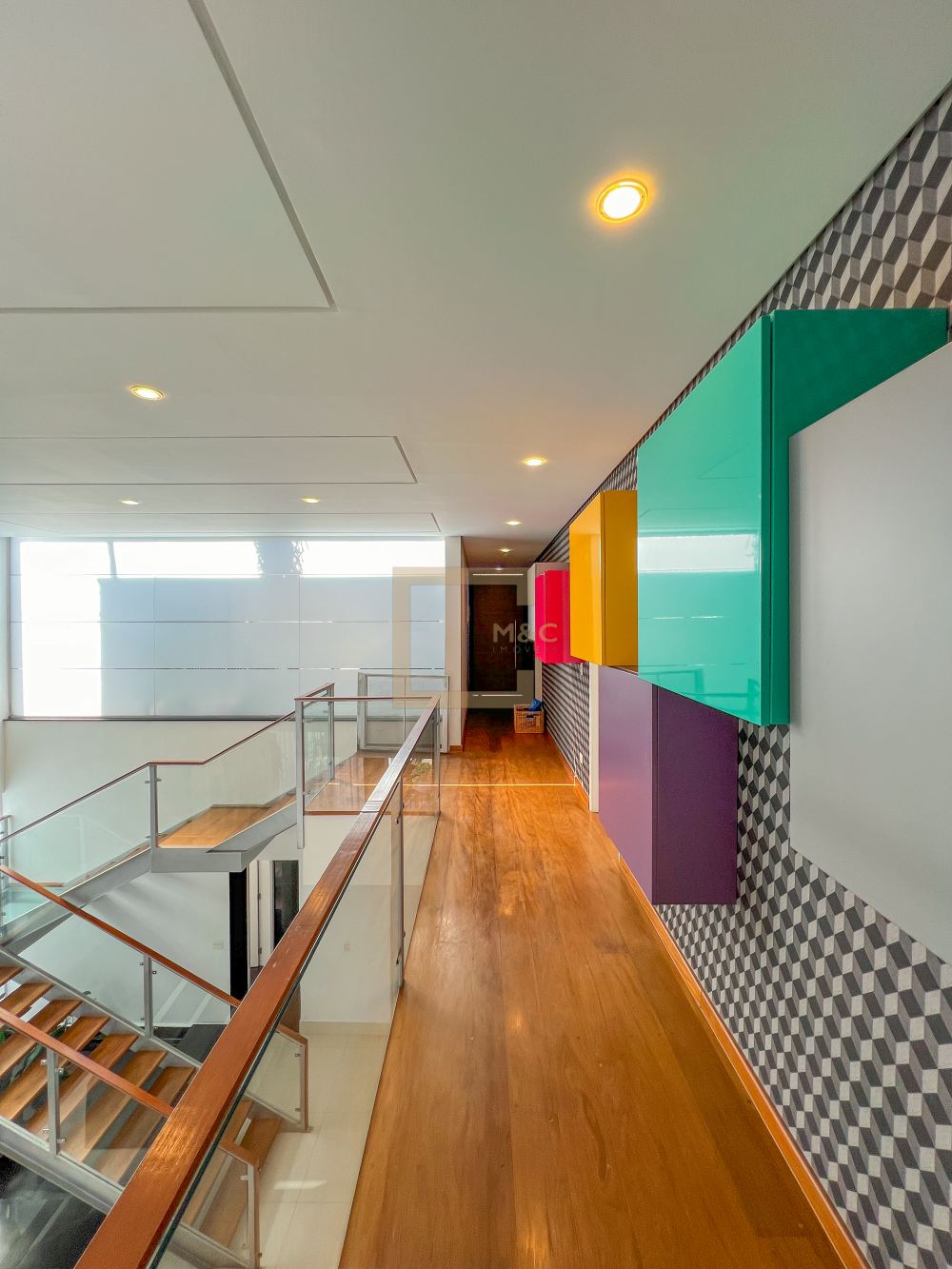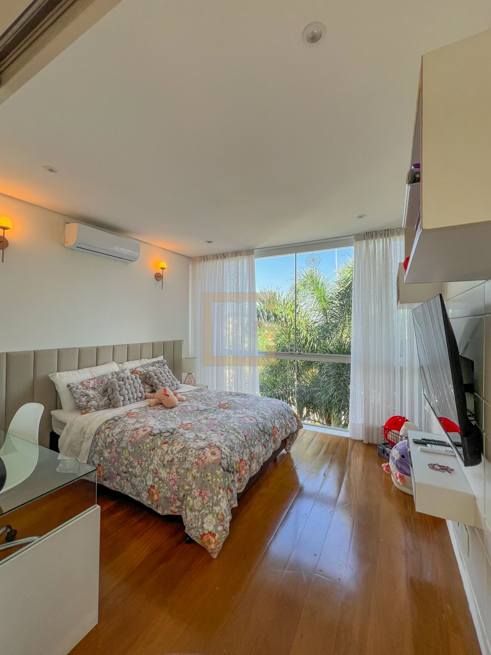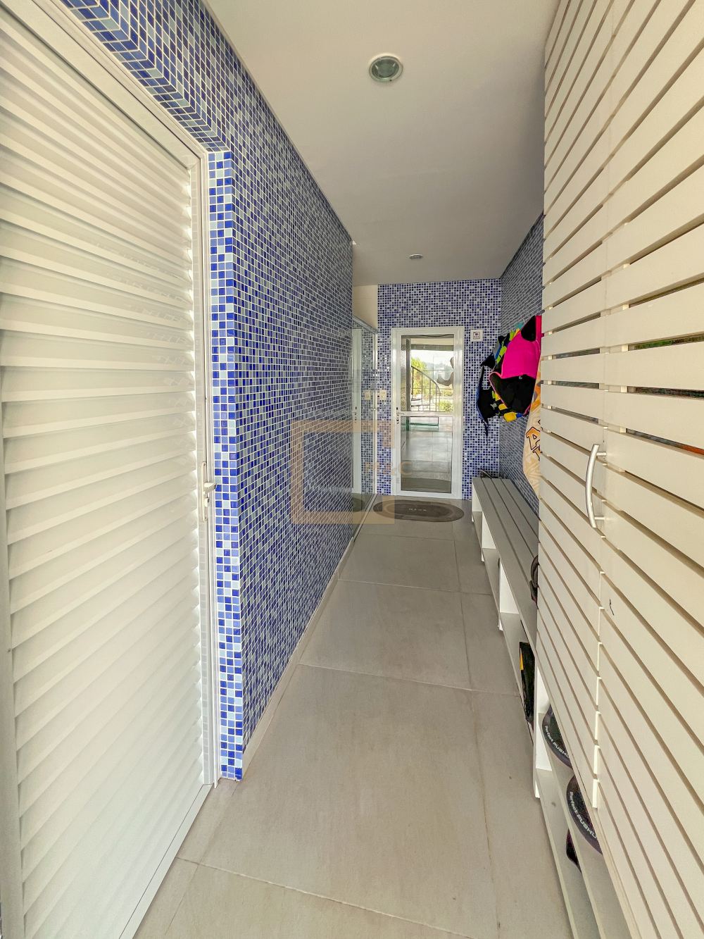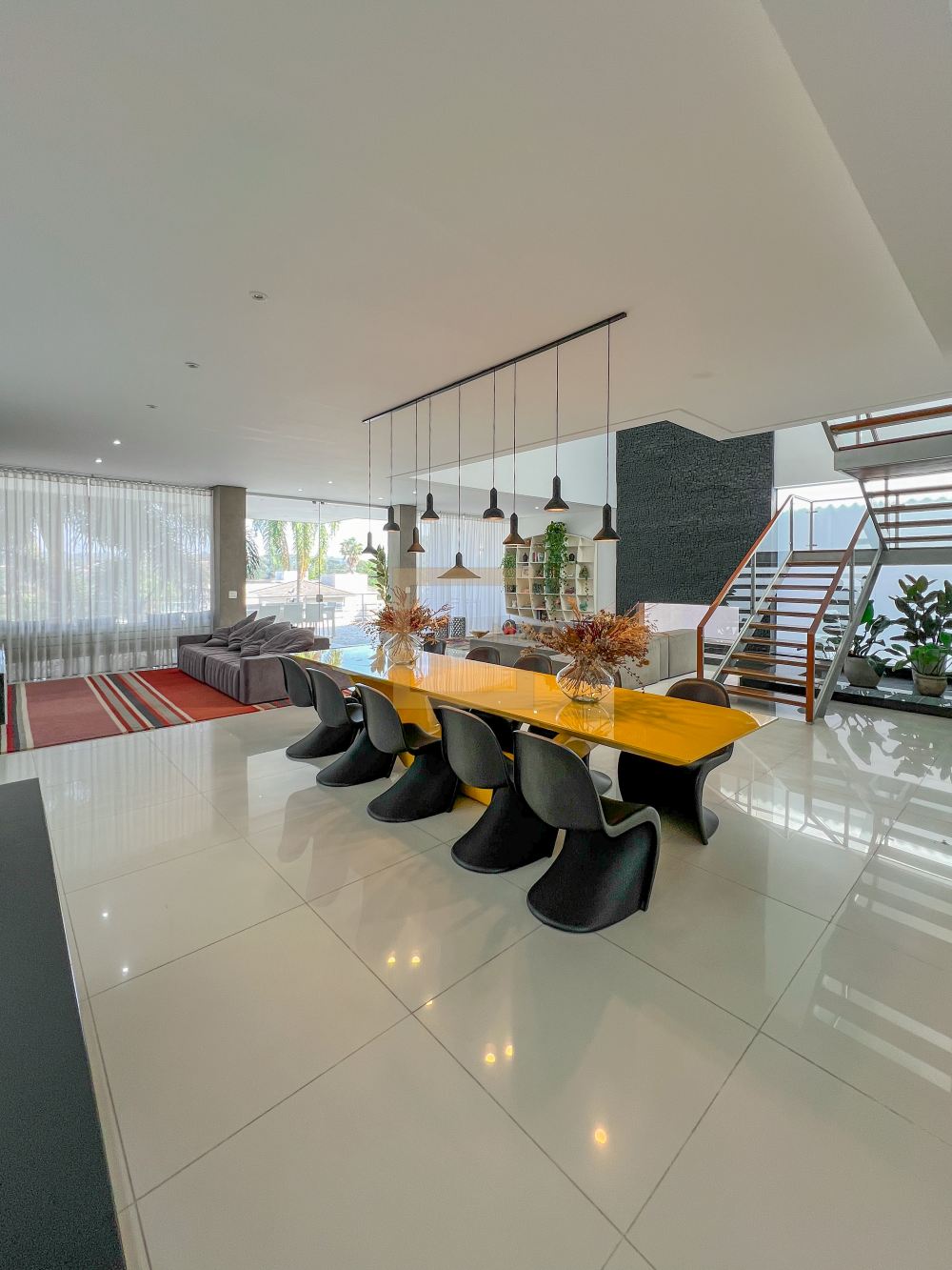 Amplo living com pe direito duplo , charmoso espelho d'água e lareira