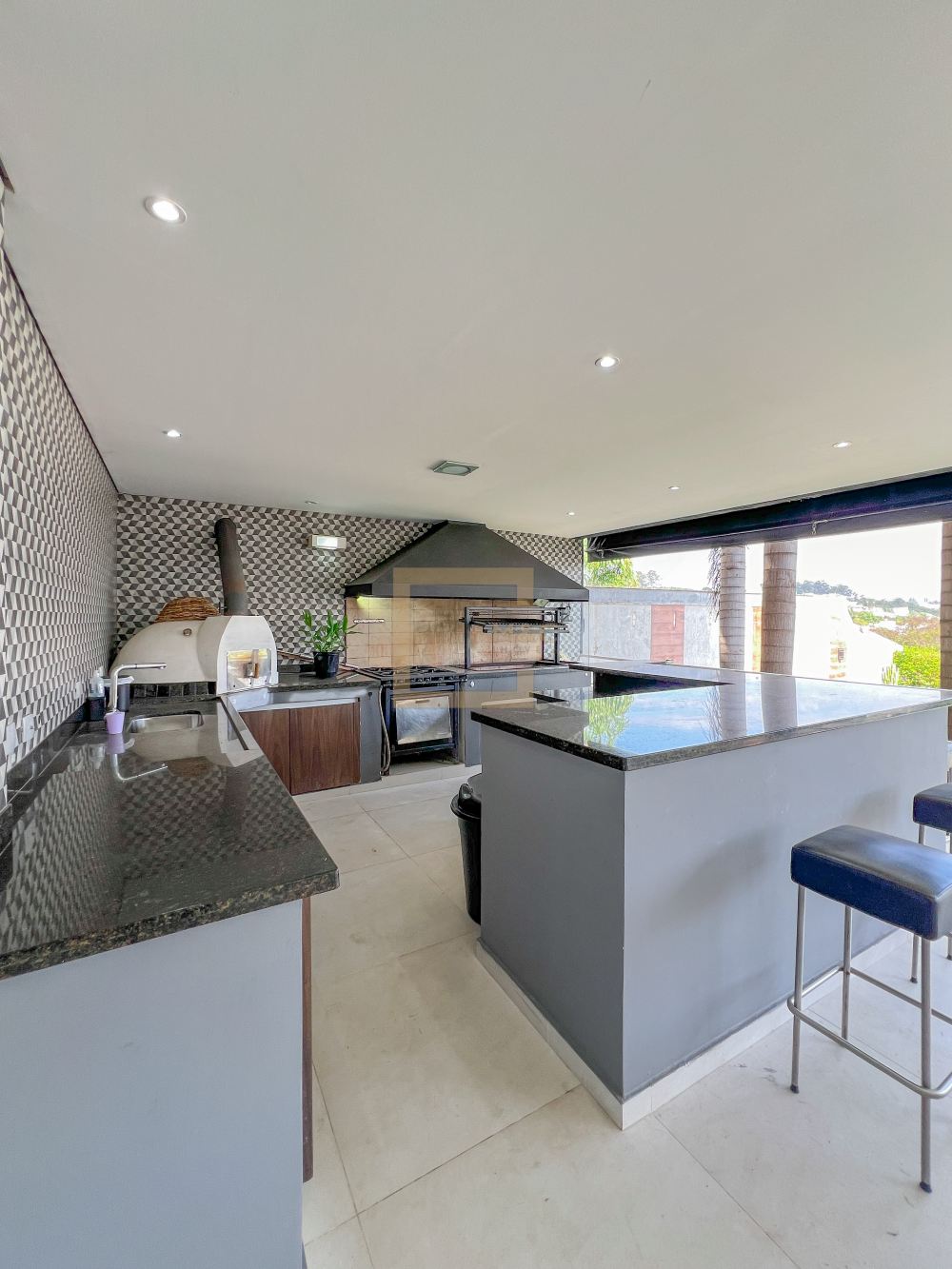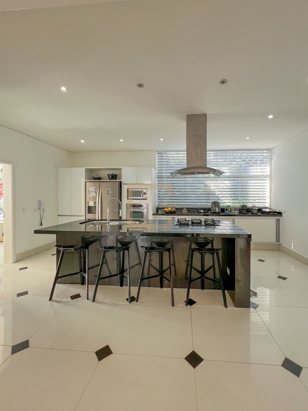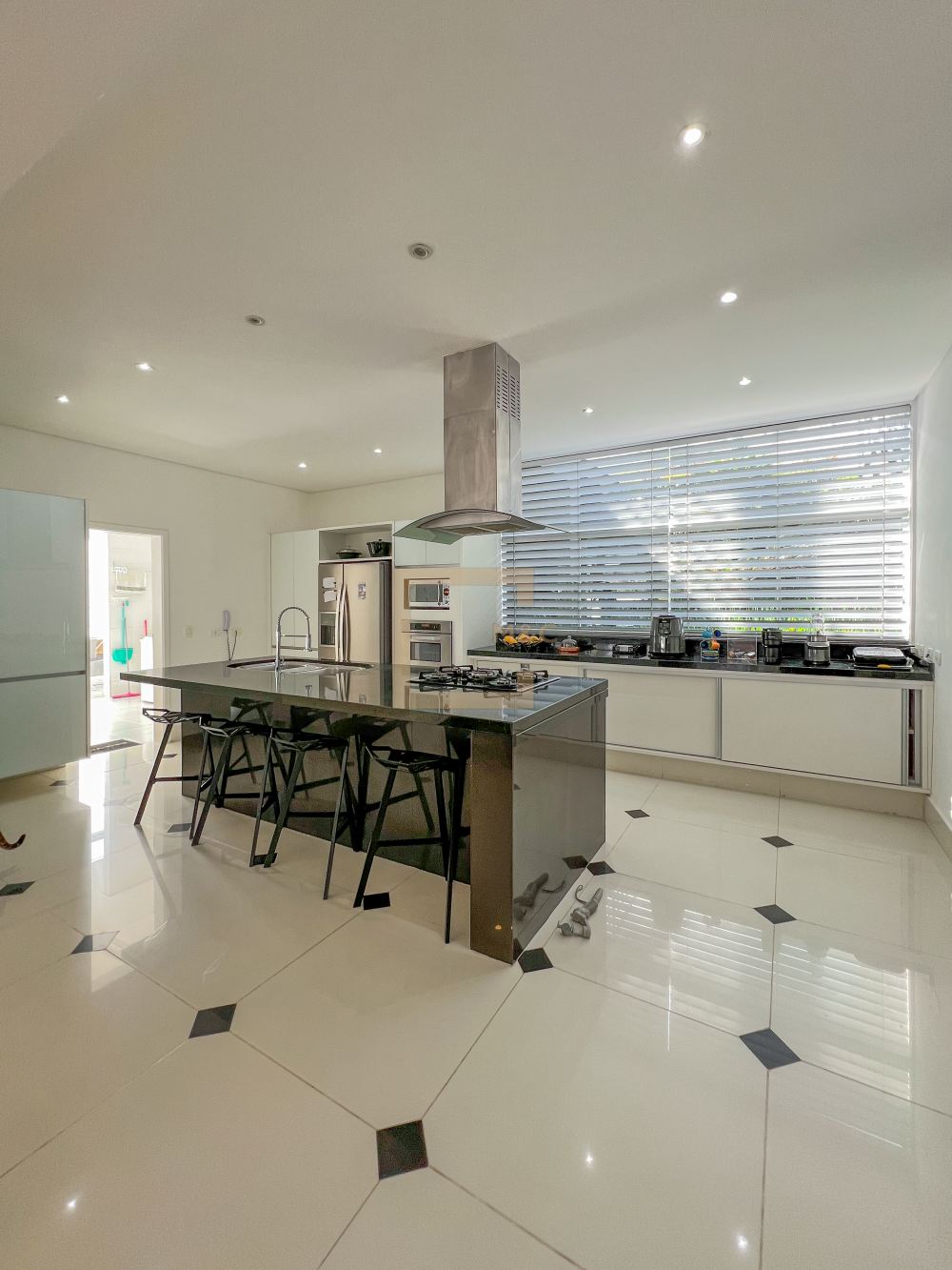 Cozinha moderna e integrada ao living com ilha central e completa de armários.