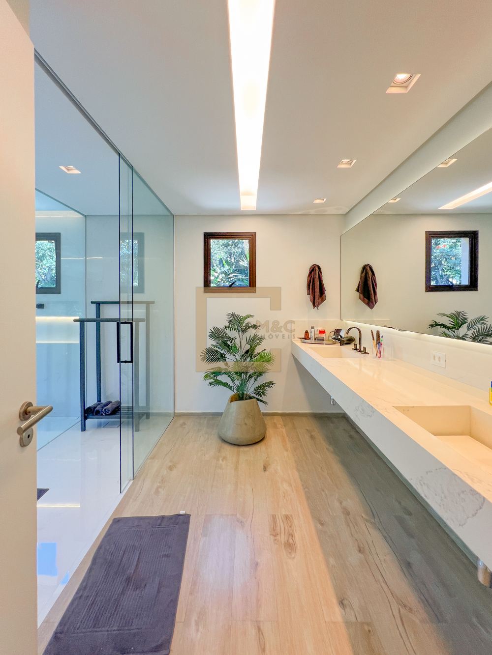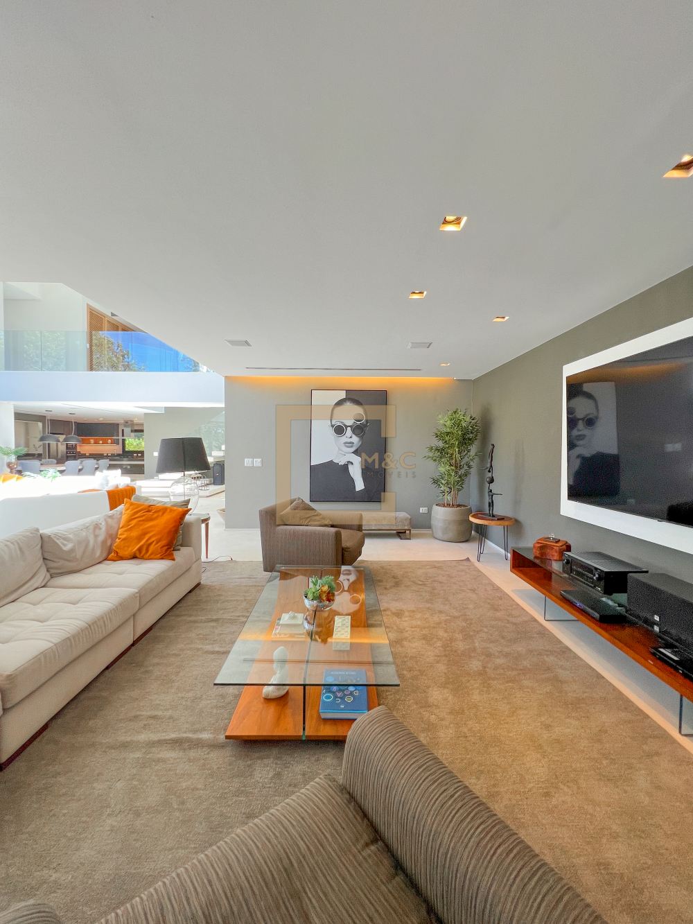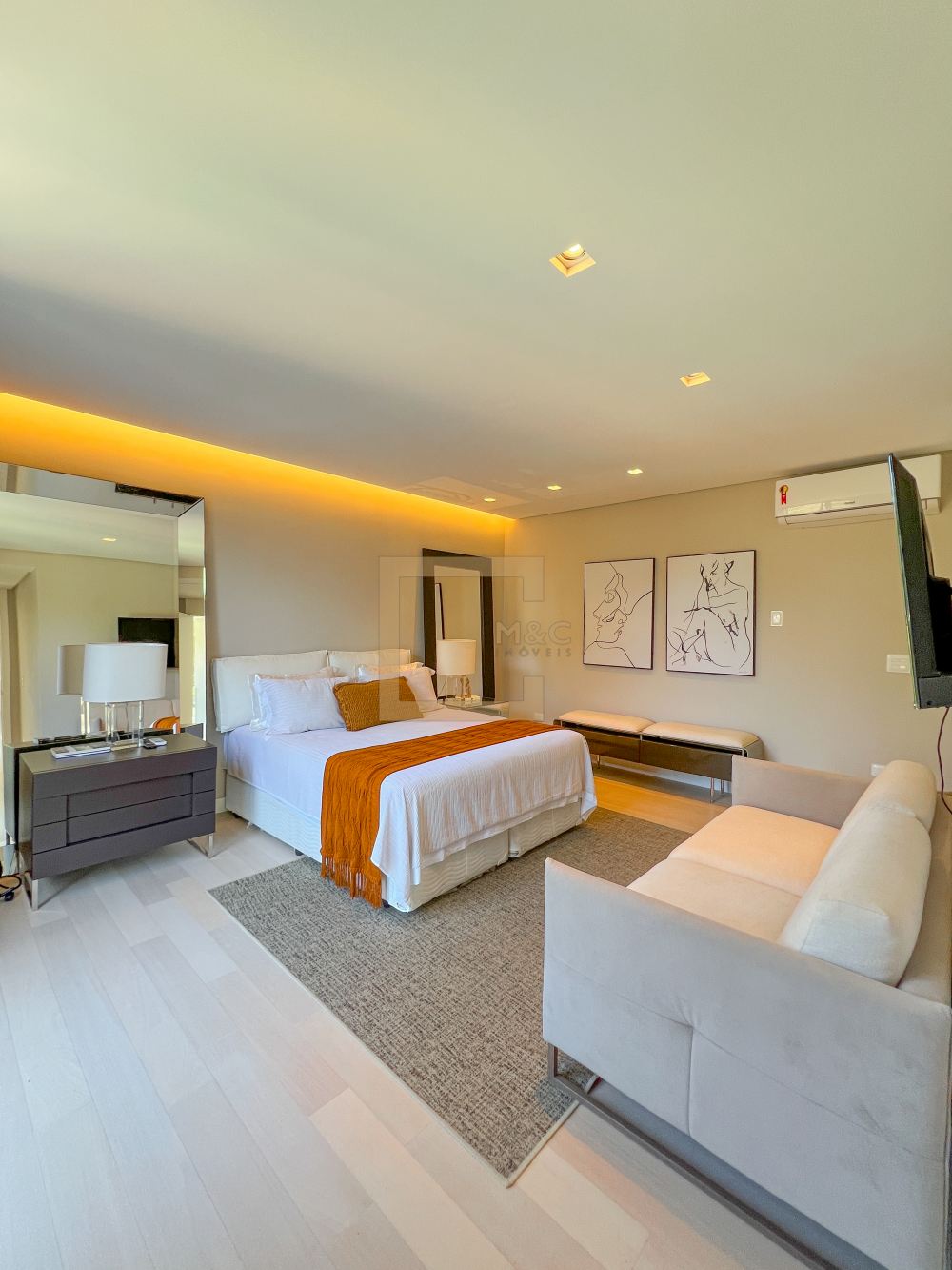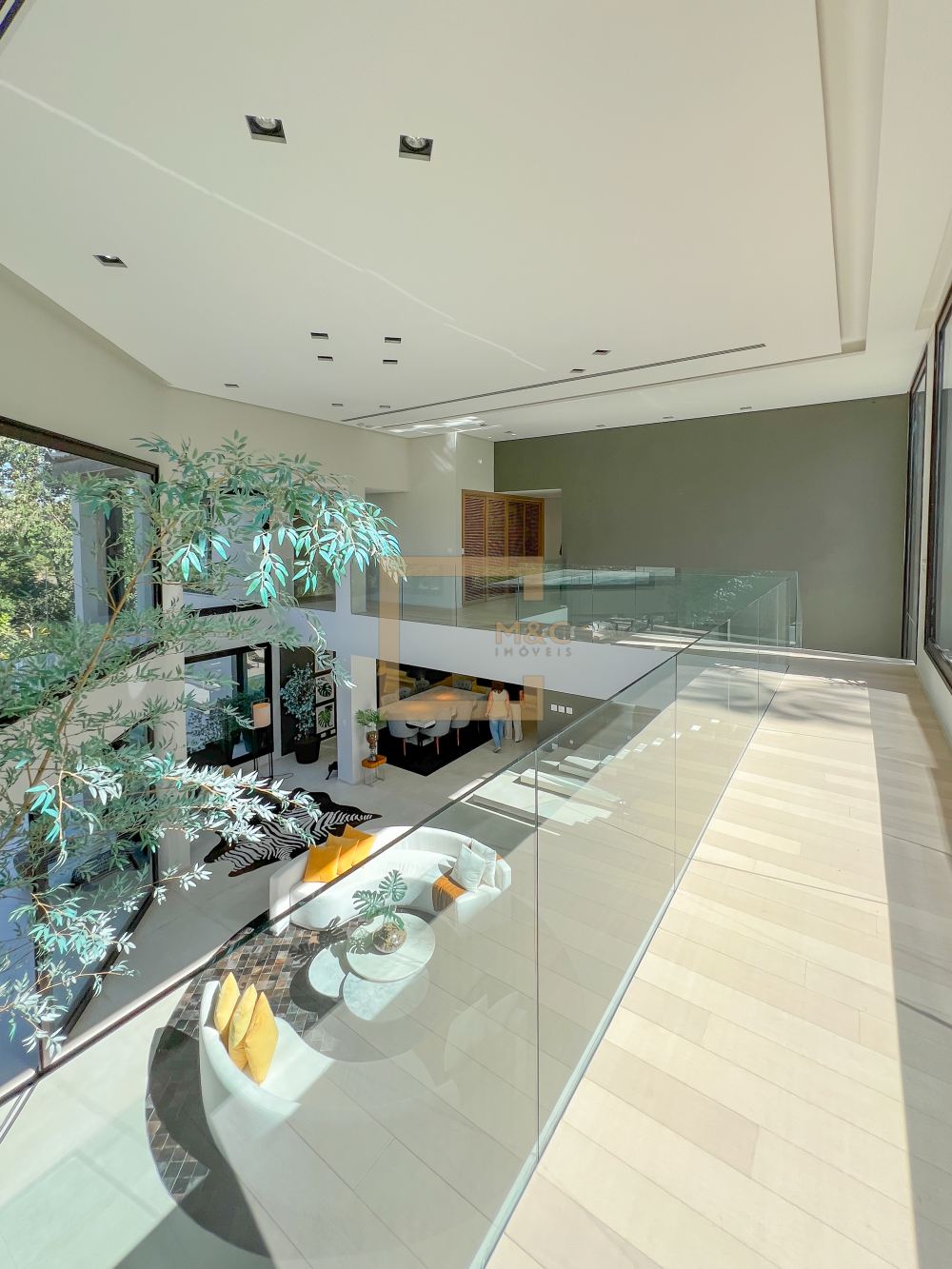 Acesso às suítes por passarelas suspensas com vista para o living e área social, sendo 4 suítes, todas equipadas com ar condicionado, marcenaria, boxes do chão ao teto, sendo a principal com walk-in closet, banheiro com cuba dupla, dois chuveiros e banheira de hidromassagem casal, com linda vista para área verde.