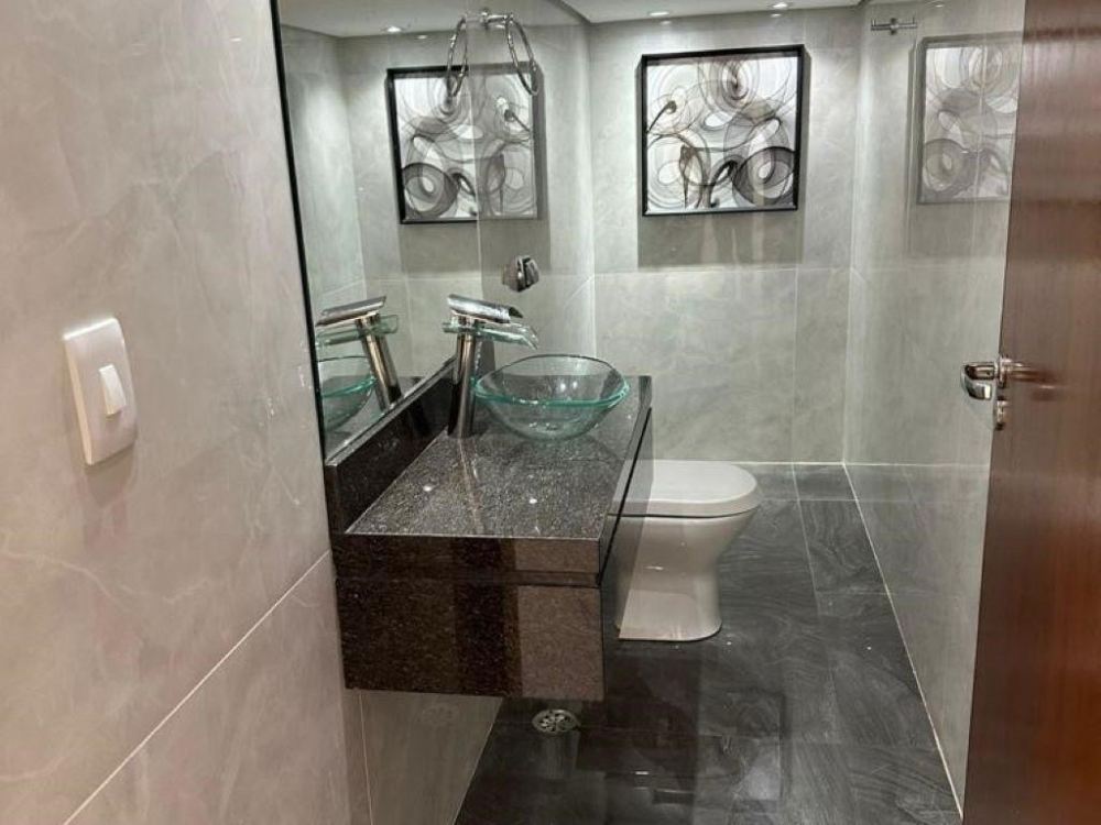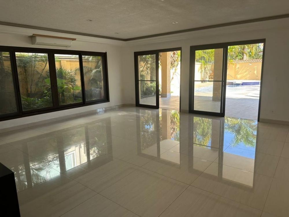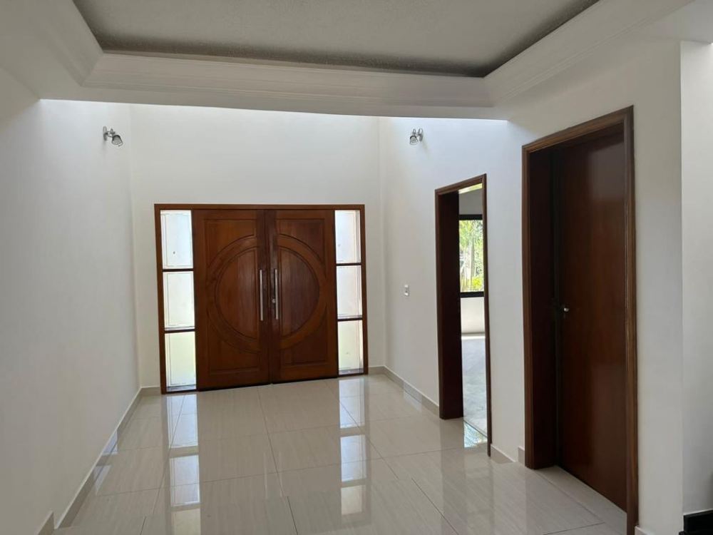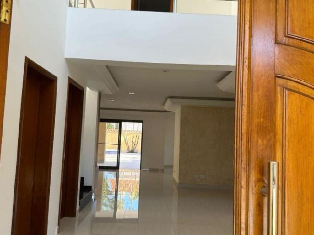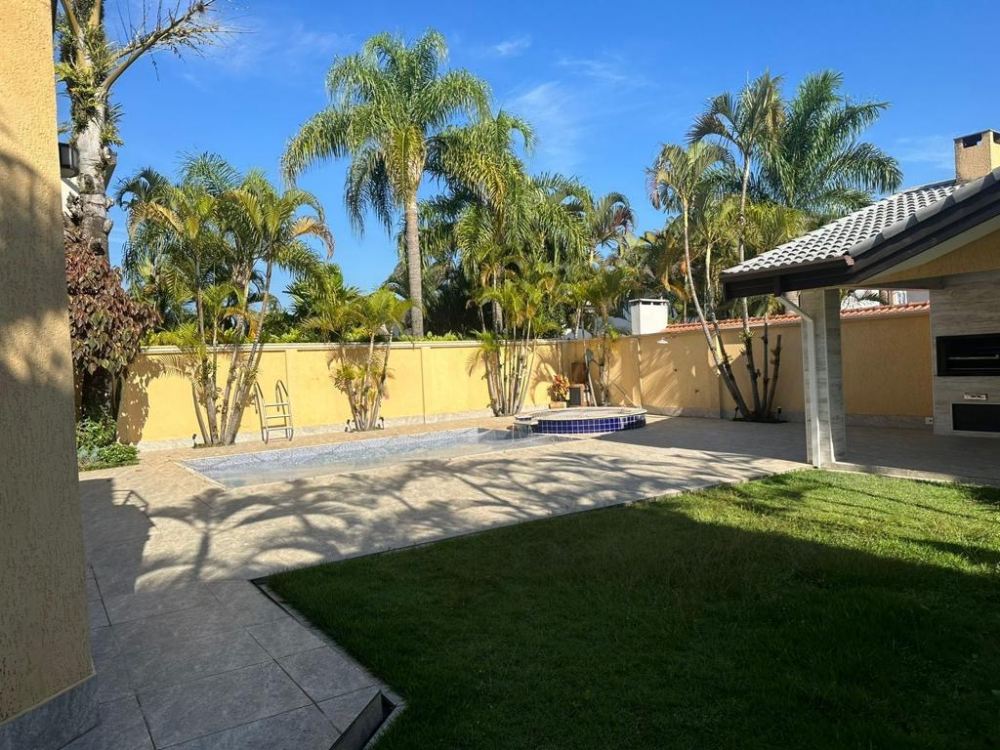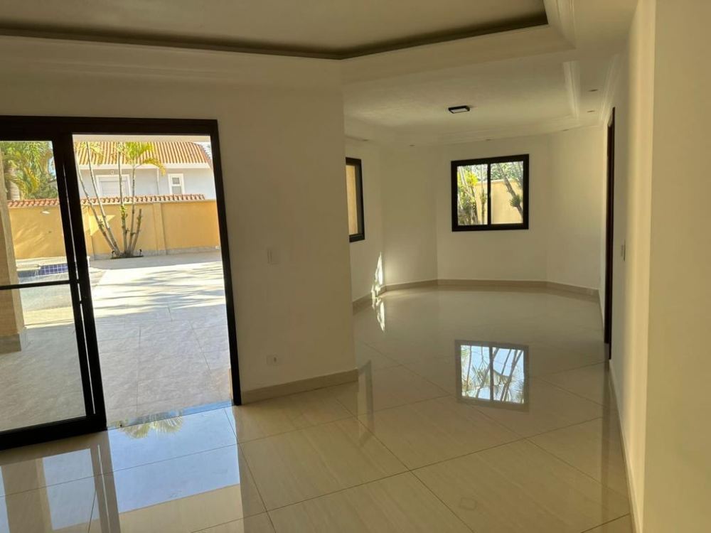 O interior da casa inclui um living amplo com salas integradas, espaço para TV e uma sala de jantar para 10 pessoas. A cozinha é equipada e possui armários, além de uma área de serviço isolada e despensa. Há 4 suítes, sendo 3 com varanda, e um lavabo, proporcionando conforto e privacidade.