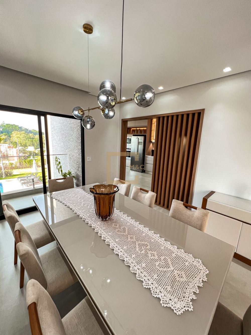 Living com estar, lareira e jantar com varanda