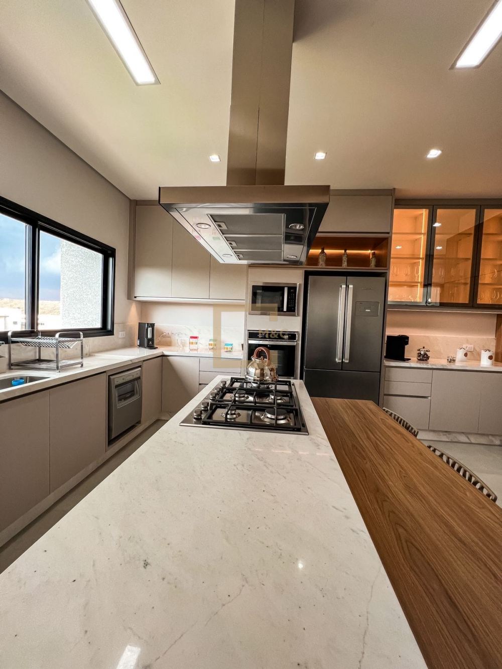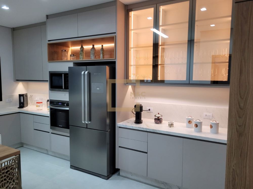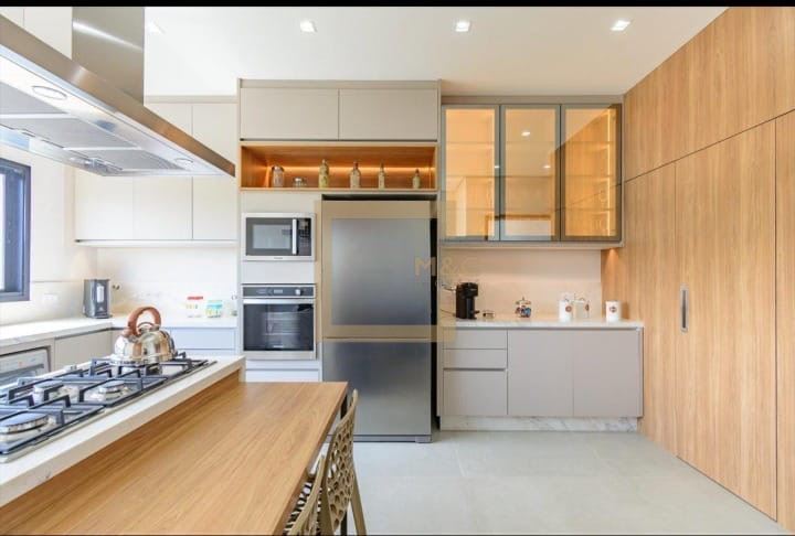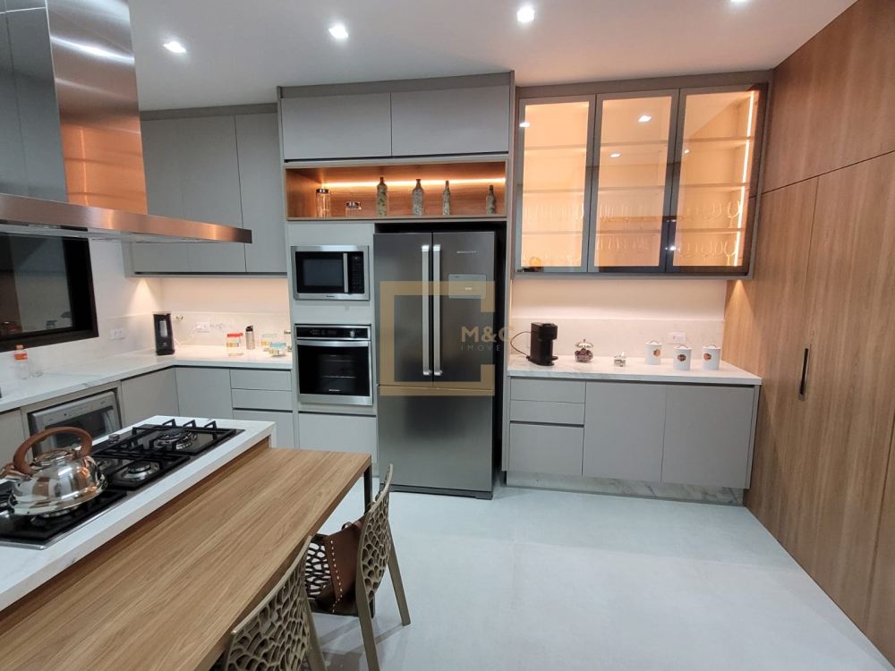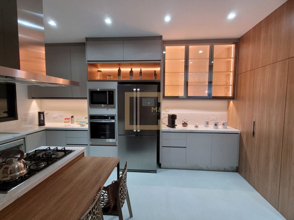 Cozinha repleta de armários planejados, cooktop de 5 bocas da linha Gourmand, coifa, forno elétrico e micro ondas embutidos .