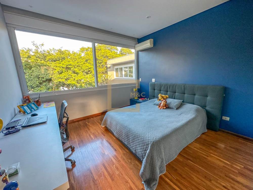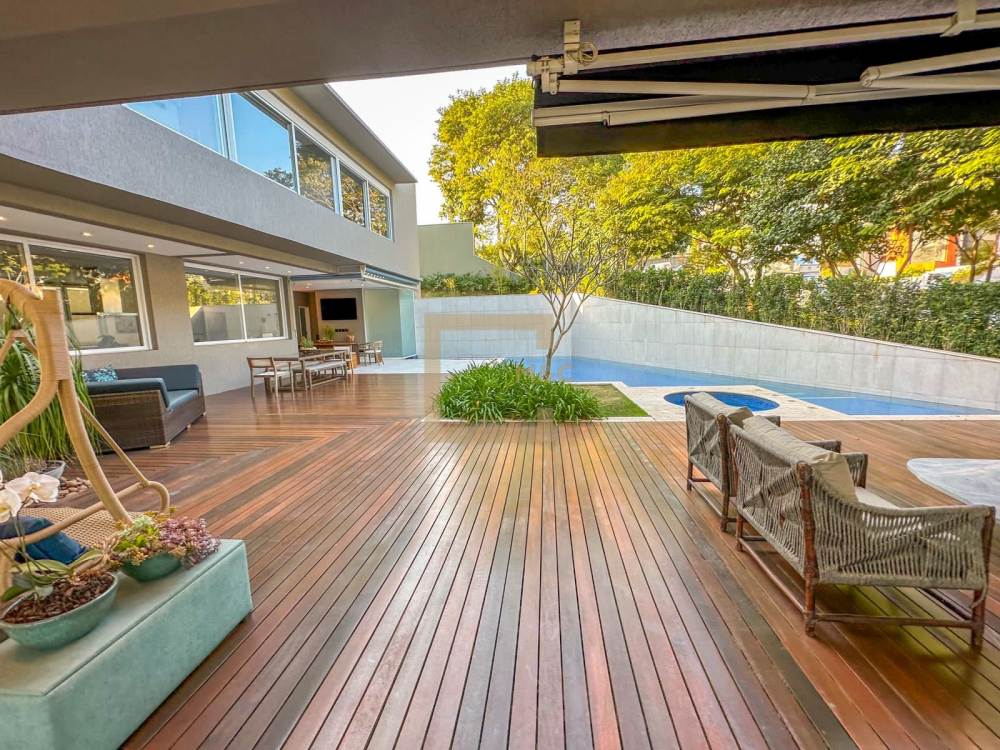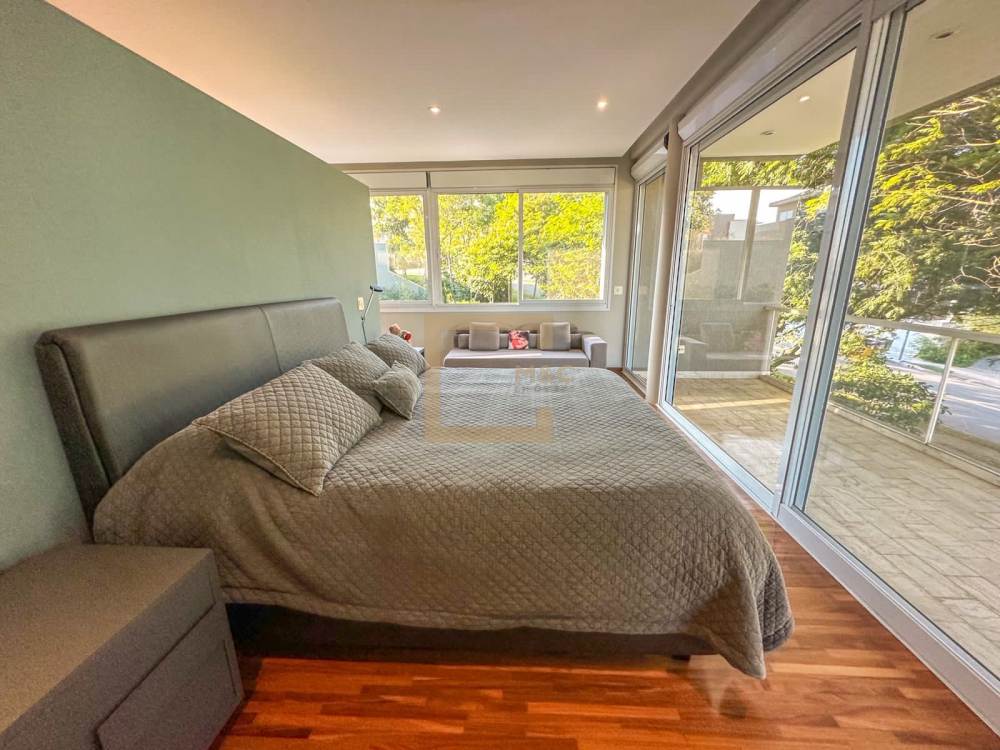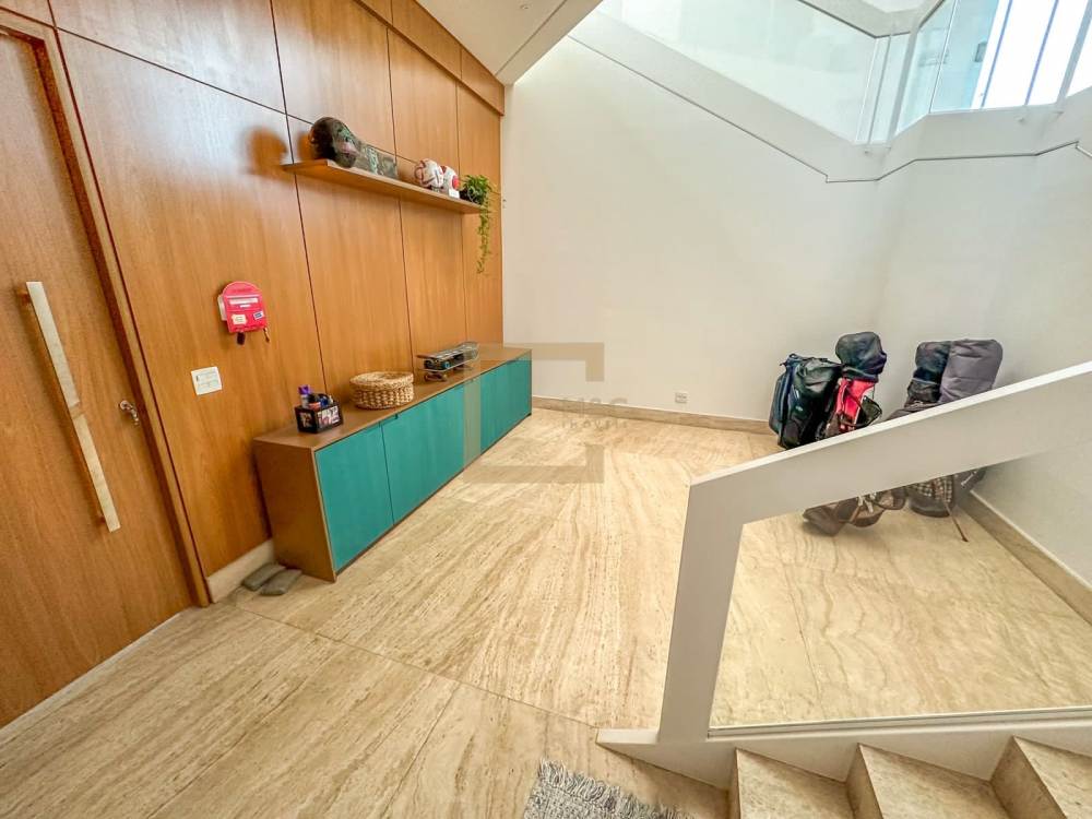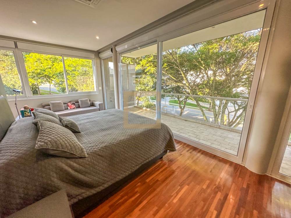 4 suítes, sendo a máster com varanda, closet Ornare, e banheiro com hidromassagem dupla. Todas as suítes têm ar condicionado e persianas elétricas, e banheiros com ventilação e iluminação natural.
