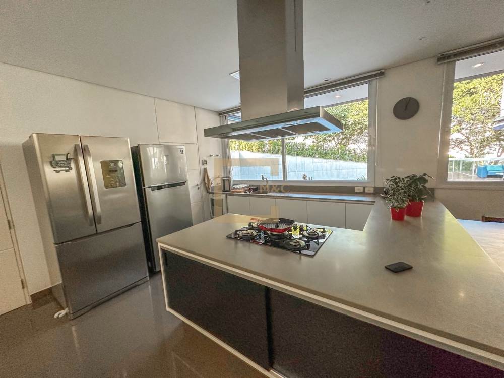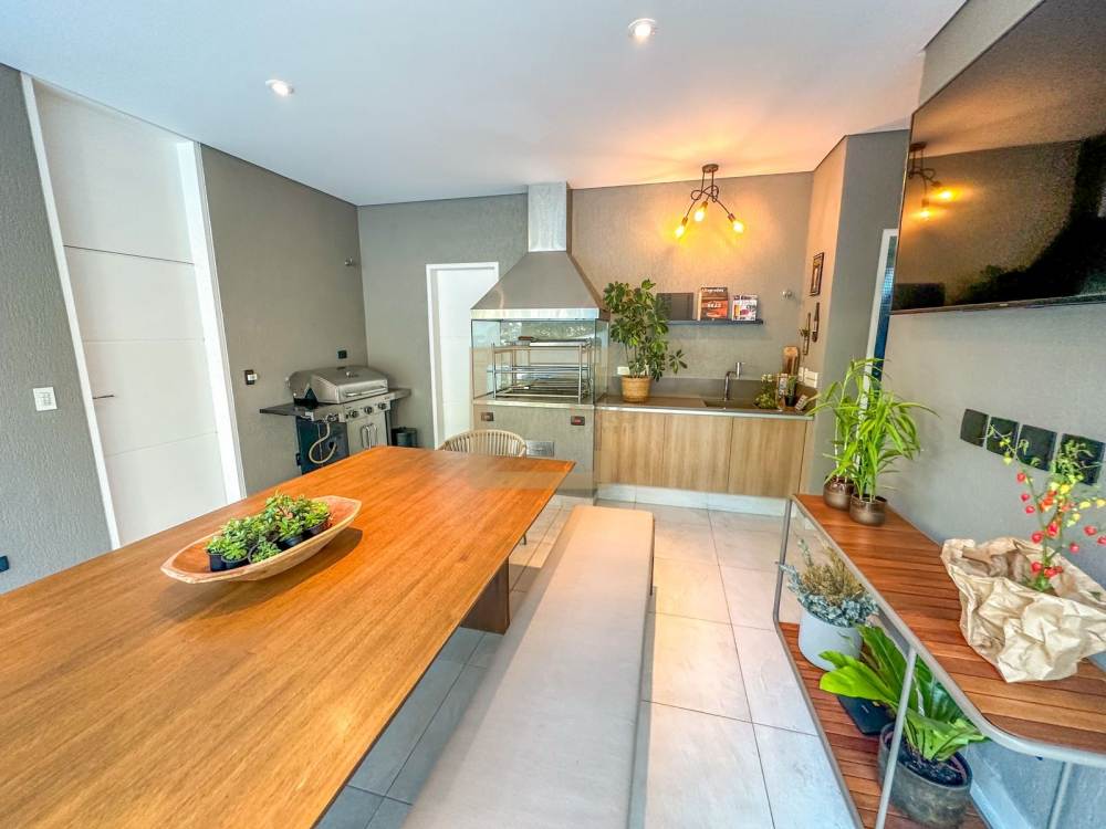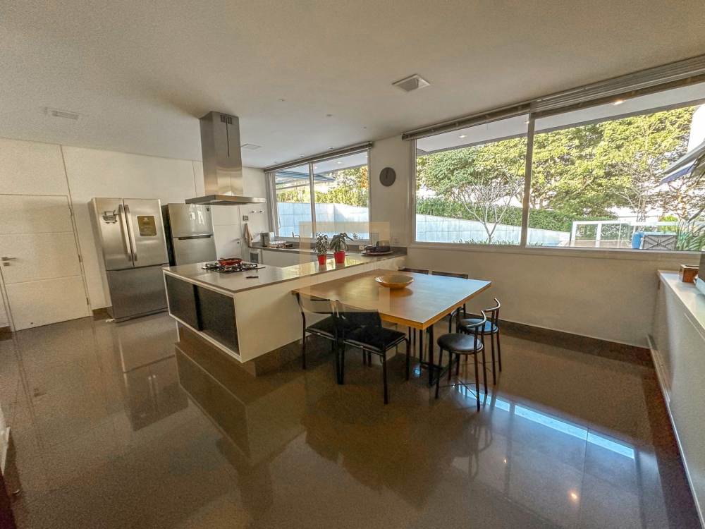 A cozinha, repleta de janelas e muito iluminada, com área gourmet e sala de almoço integradas.