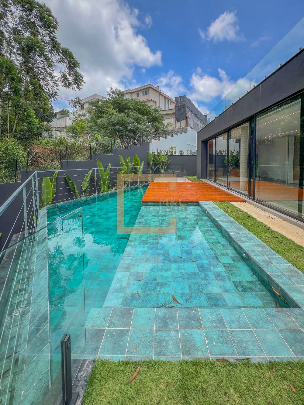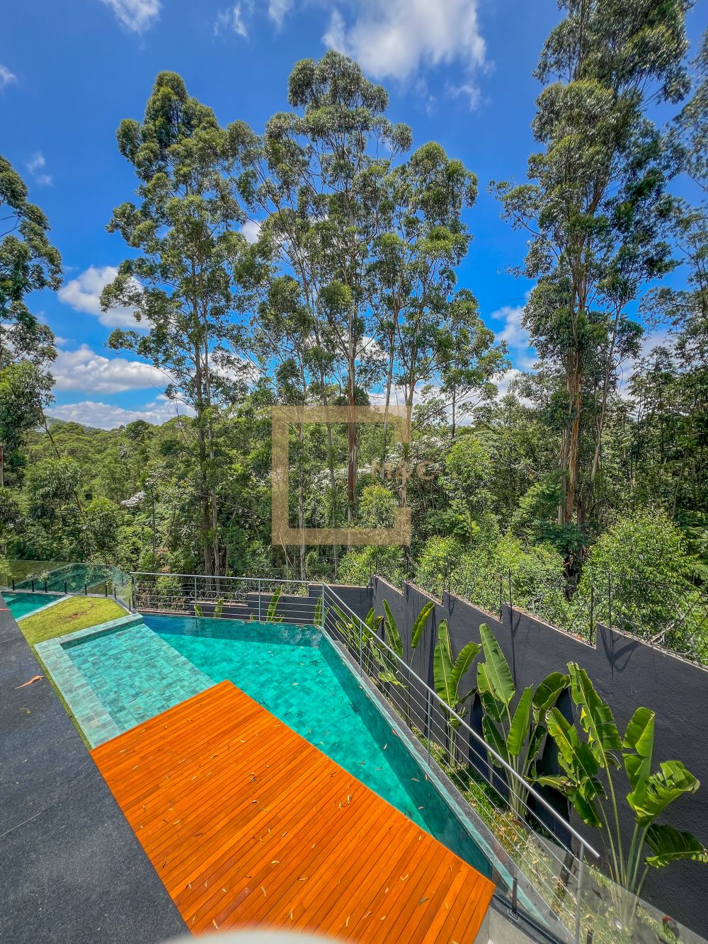 Piscina de borda infinita, prainha, envolvida em deck de madeira cumaru, Spa e Fire play
