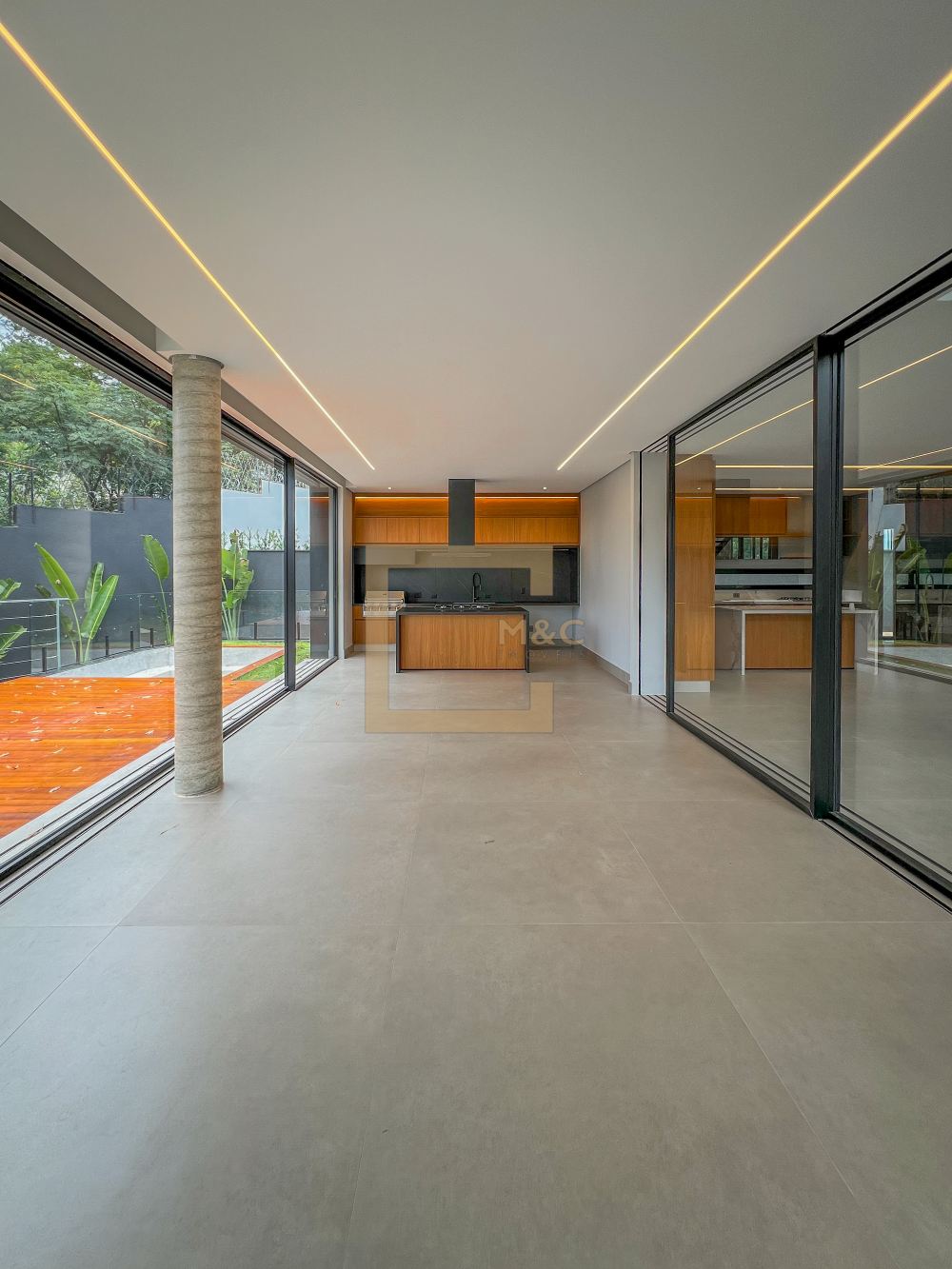 Living com lareira, Painéis de vidro , proporcionando muita claridade aos ambientes , integrado a cozinha e ao gourmet