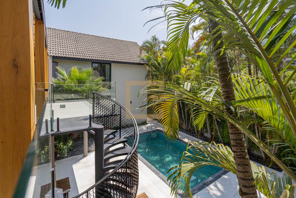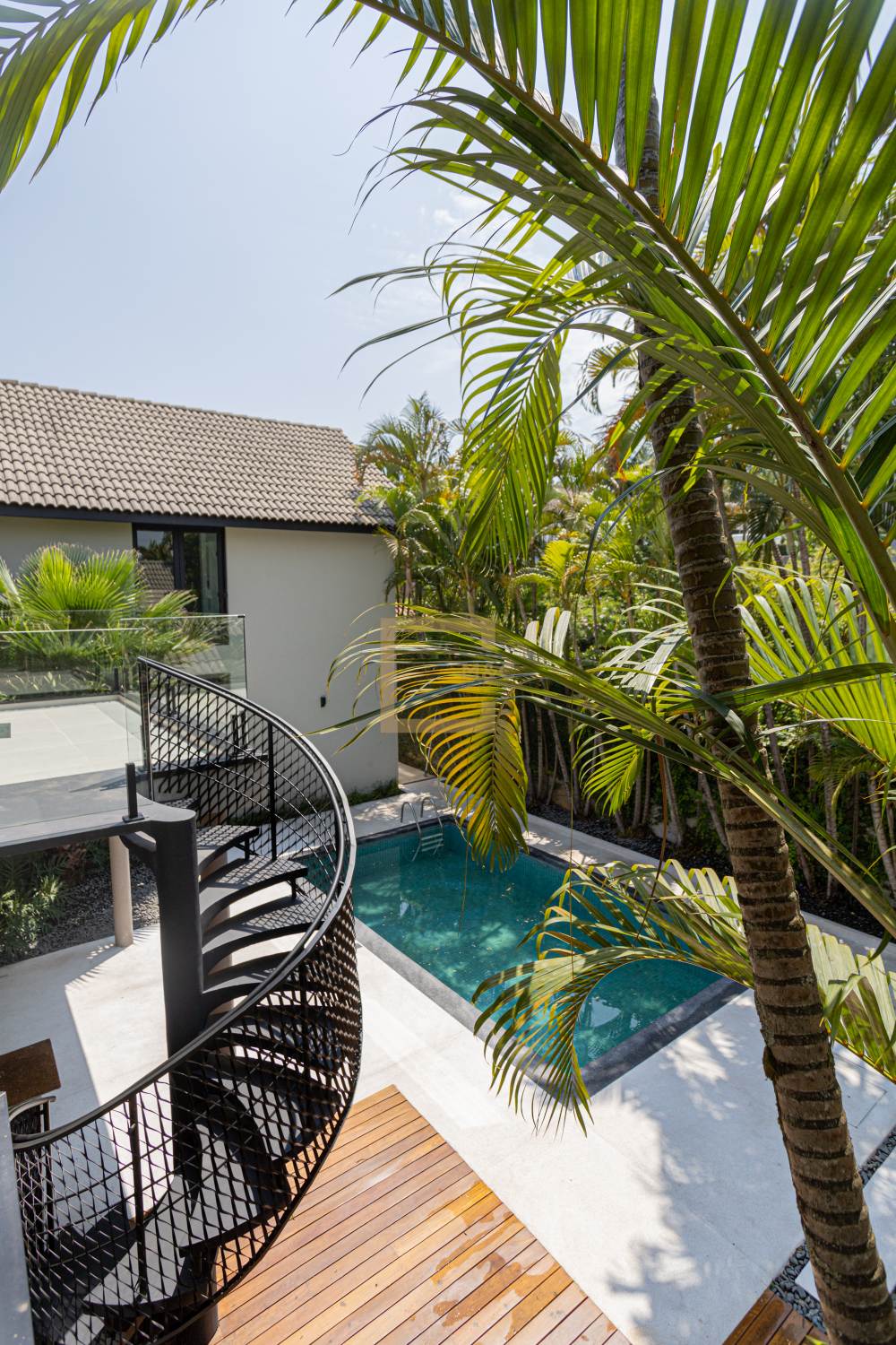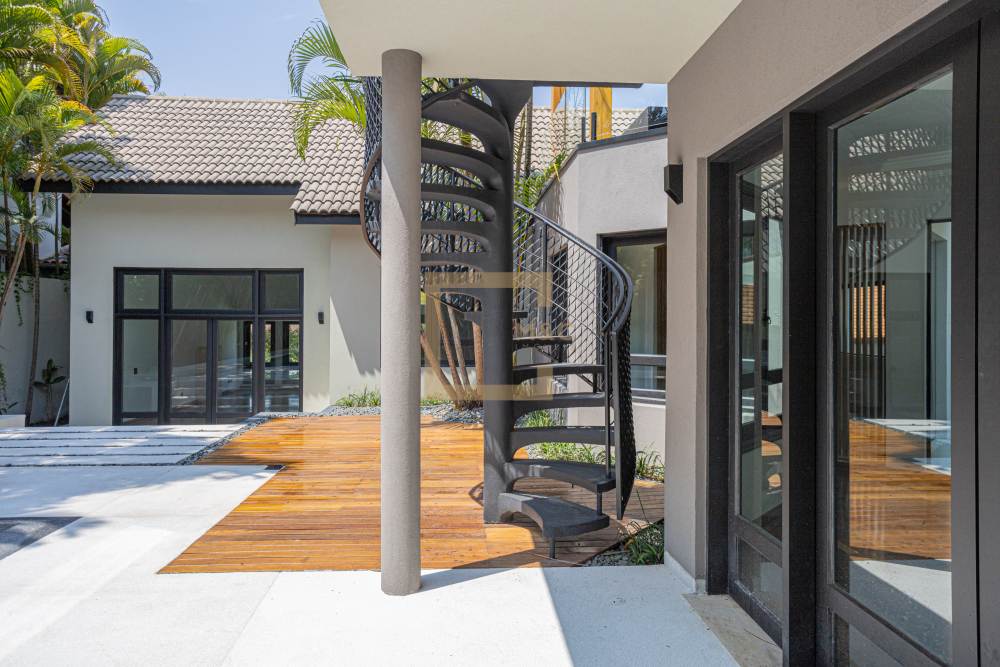 Cozinha planejada com piso em porcelanato, coifa, cooktop em bancada de granito preto.