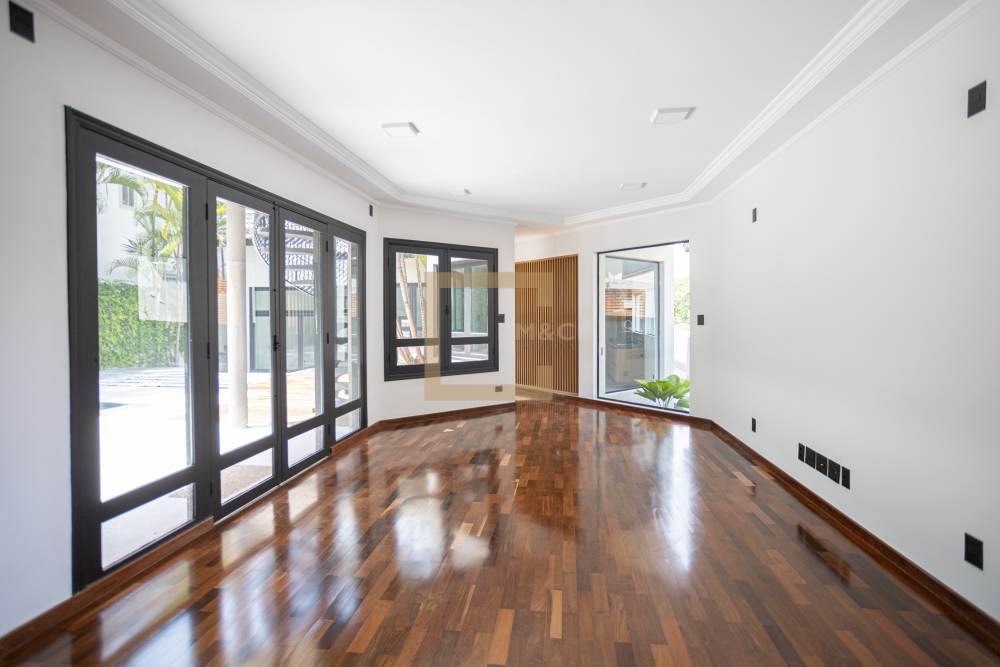 Sala de estar e jantar com piso em madeira e janelões com iluminação direta natural .