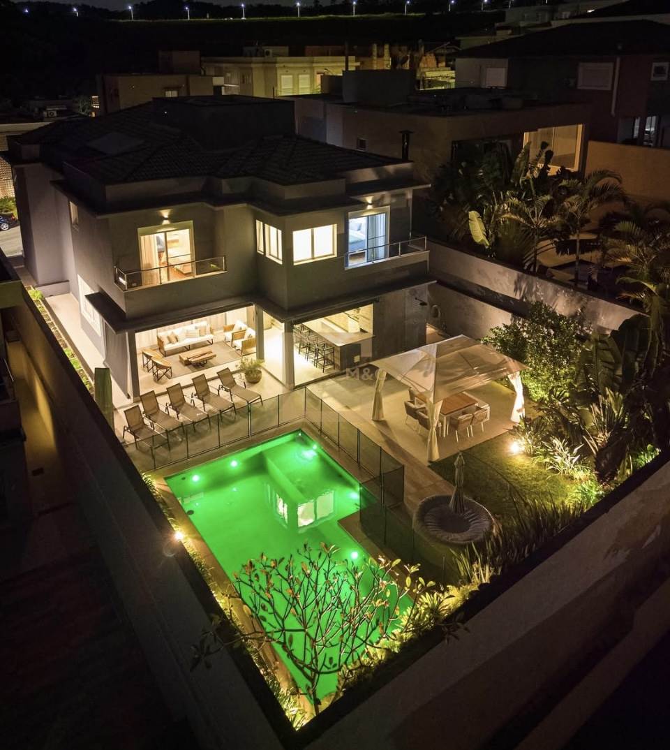 Piscina com prainha, envolvida em deck, e um belo gazebo