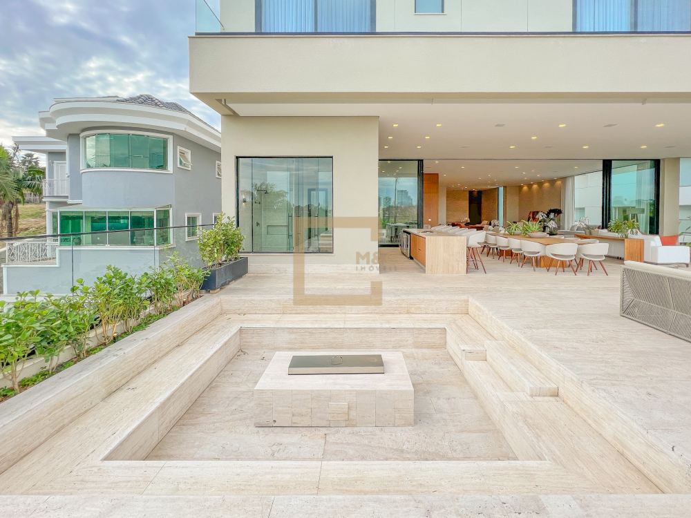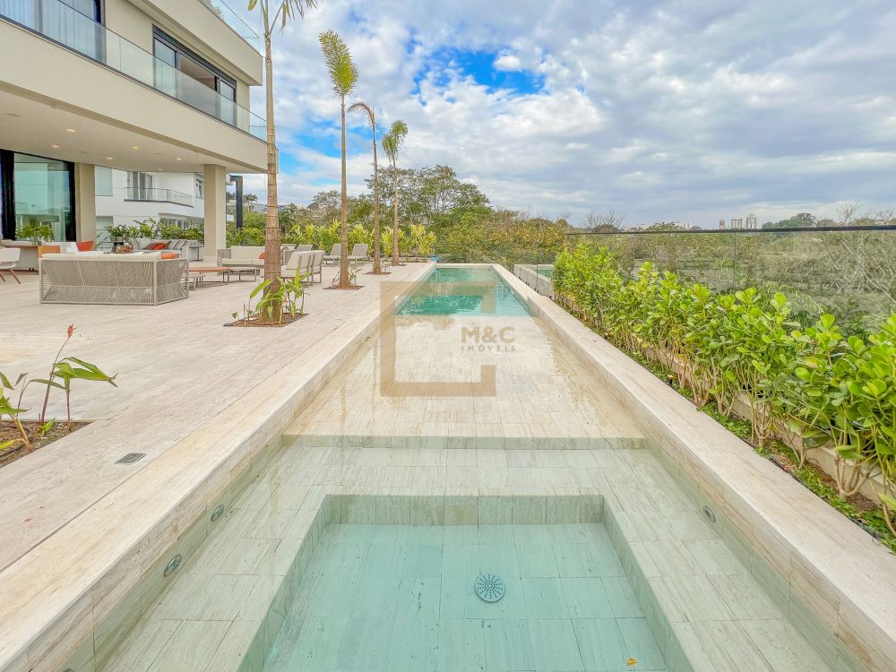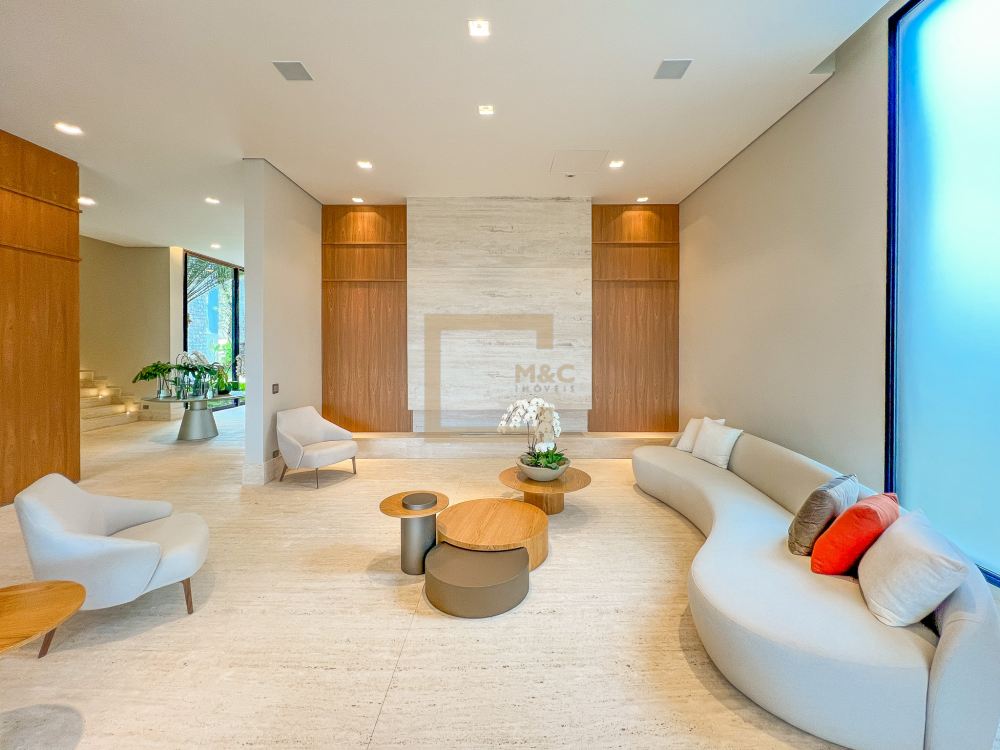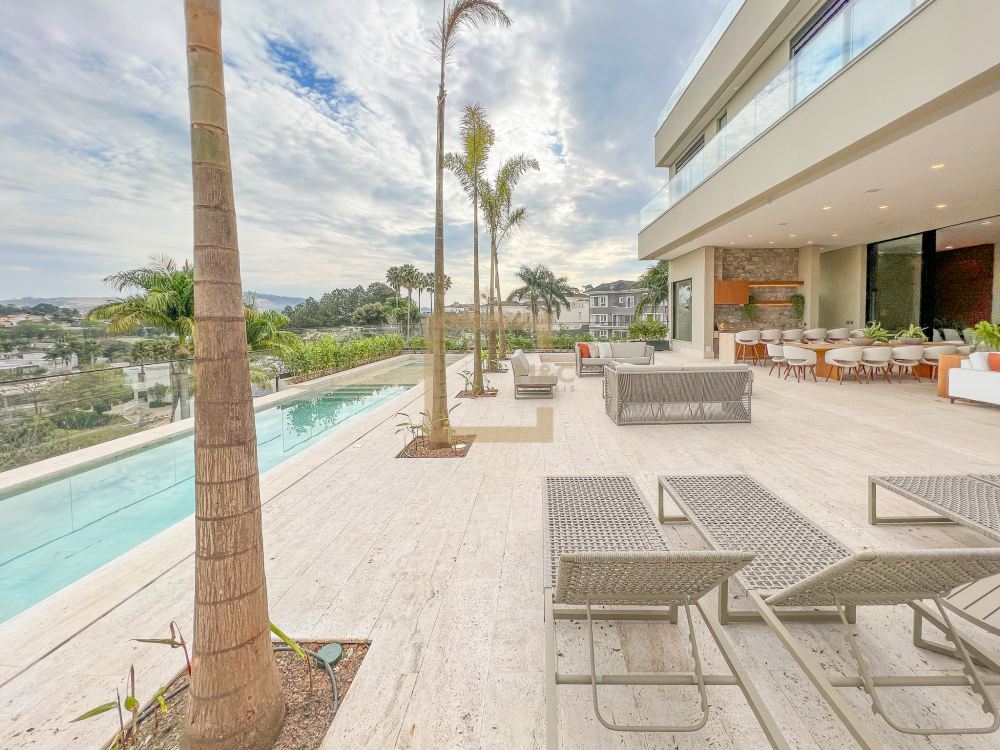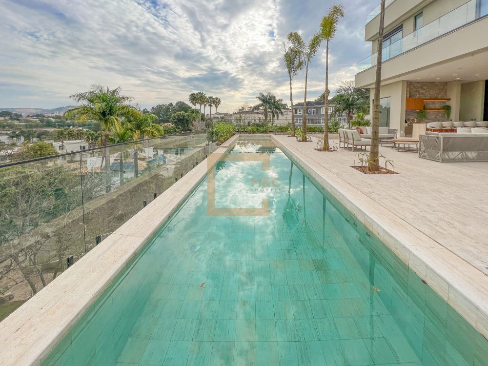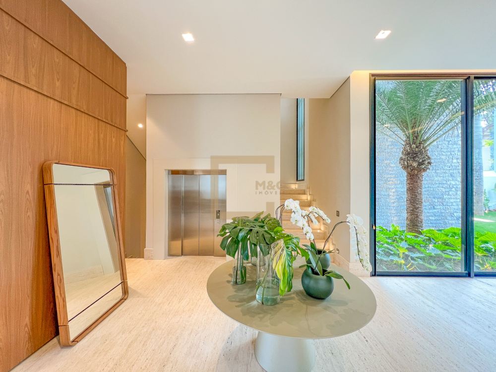 Pé direito do pavimento térreo é de 3,95m de altura; Pé direito do primeiro pavimento é de 3,20m de altura; Revestimento da área social do térreo é Mármore Travertino Romano. Adega climatizada; Sala de lareira Piscina aquecida, borda infinita, prainha; Spa com hidromassagem integrado com a piscina; Fireplace; Varanda na fachada e no fundo com vista para o parque; Acesso da cobertura ao Rooftop, composto por um living a céu aberto, possuindo lareira, jardim, iluminação e sistema de som, além do privilégio de contemplar a vista do parque do condomínio e o pôr do sol; A casa ainda conta com cinema, academia pátio coberto e descoberto, elevador Otis para 10 pessoas; Vista para o campo de futebol quadra de futevôlei;Única casa que possui entrada por duas ruas, tanto pela Al. Hang Kong, quanto pela Al. Seoul.