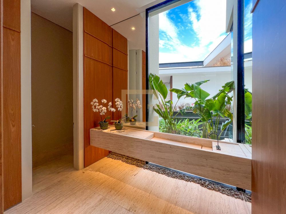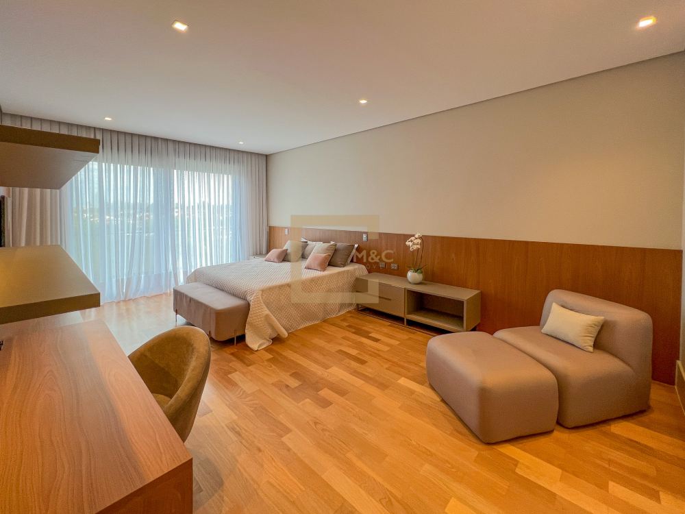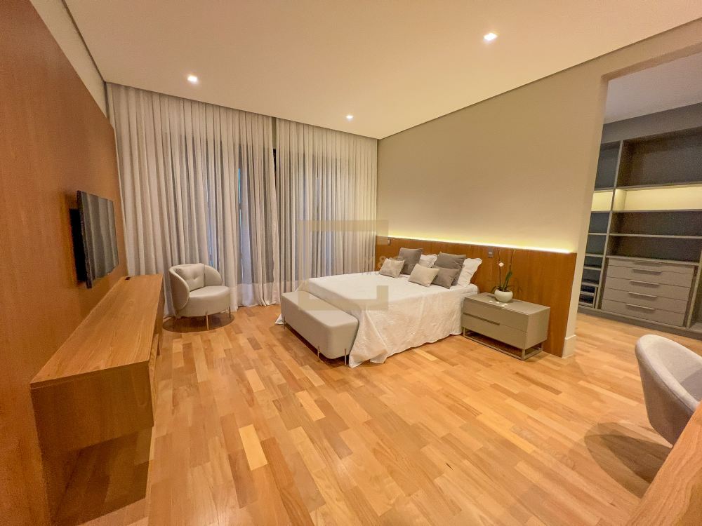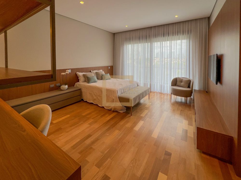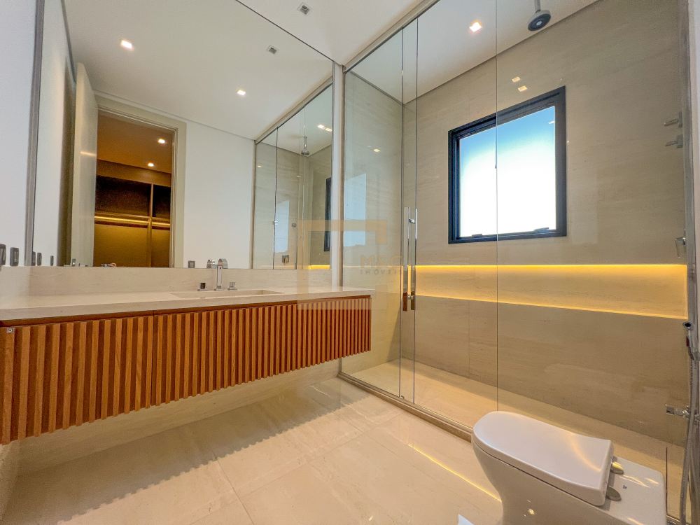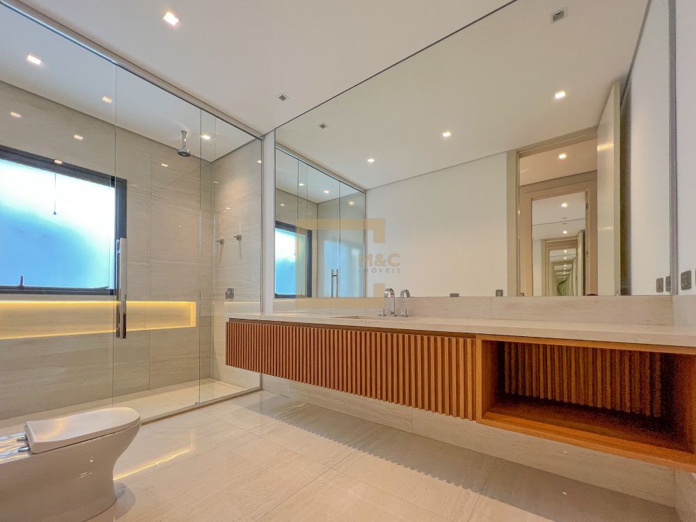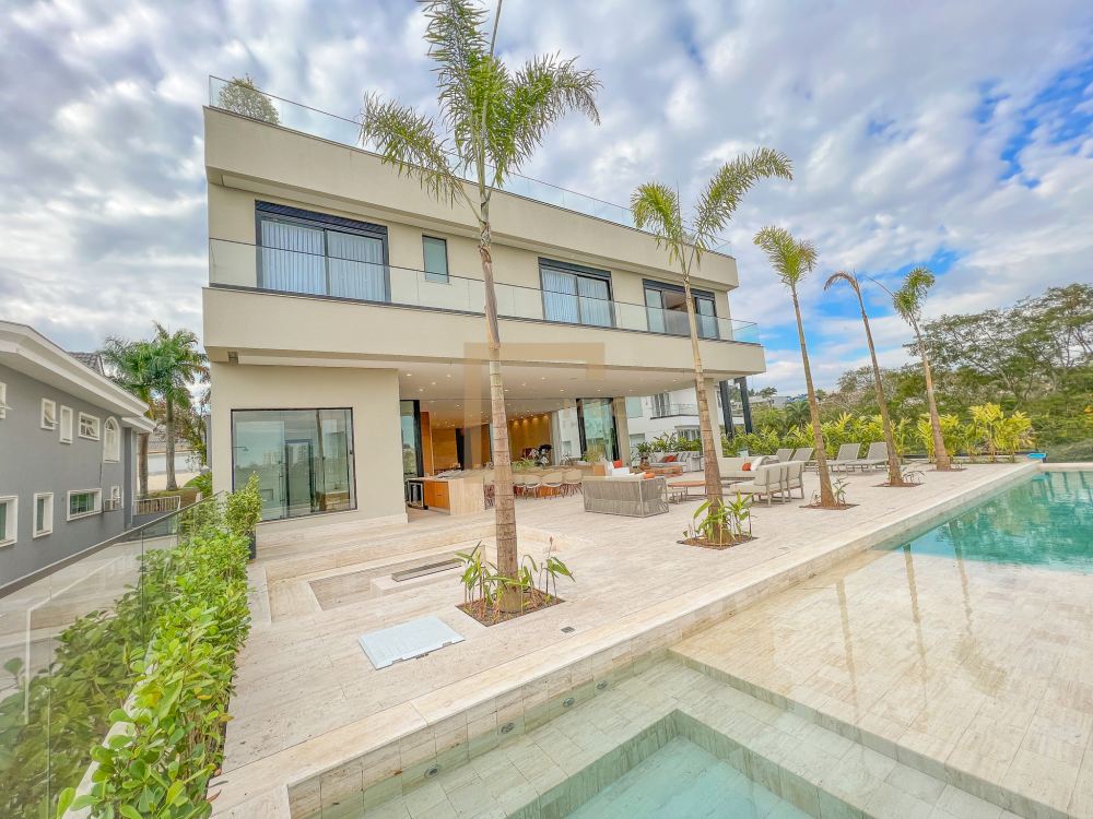 Pé direito do pavimento térreo é de 3,95m de altura; Pé direito do primeiro pavimento é de 3,20m de altura; Revestimento da área social do térreo é Mármore Travertino Romano. Adega climatizada; Sala de lareira Piscina aquecida, borda infinita, prainha; Spa com hidromassagem integrado com a piscina; Fireplace; Varanda na fachada e no fundo com vista para o parque; Acesso da cobertura ao Rooftop, composto por um living a céu aberto, possuindo lareira, jardim, iluminação e sistema de som, além do privilégio de contemplar a vista do parque do condomínio e o pôr do sol; A casa ainda conta com cinema, academia pátio coberto e descoberto, elevador Otis para 10 pessoas; Vista para o campo de futebol quadra de futevôlei;Única casa que possui entrada por duas ruas, tanto pela Al. Hang Kong, quanto pela Al. Seoul.