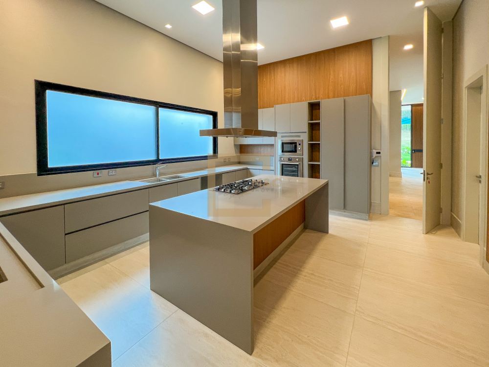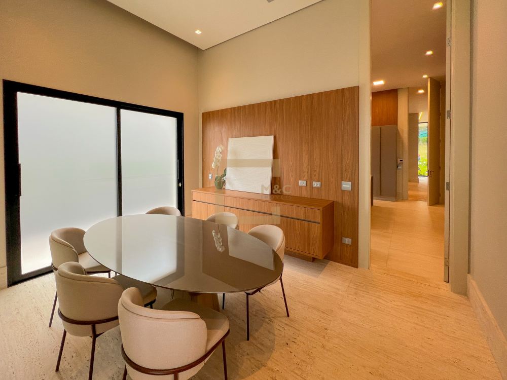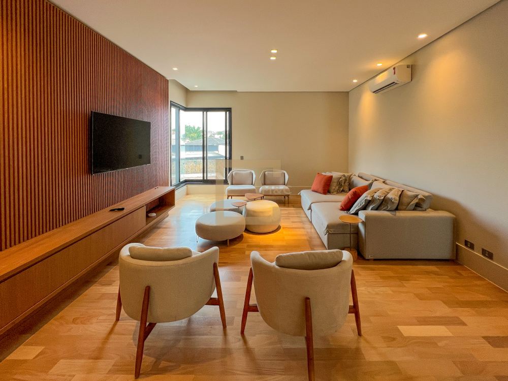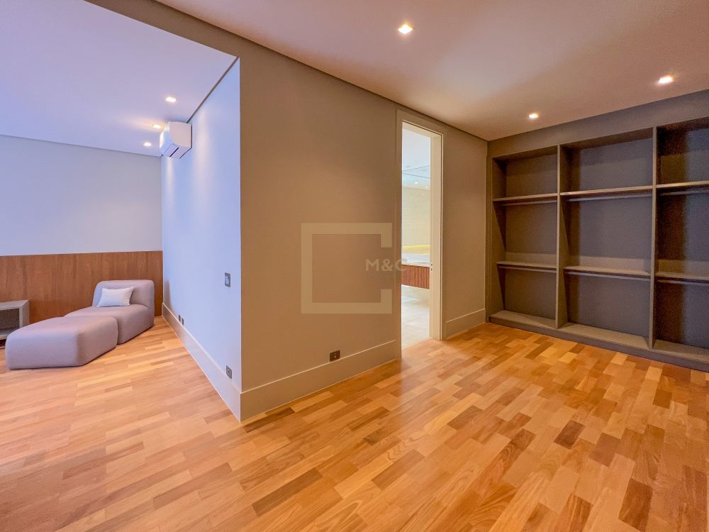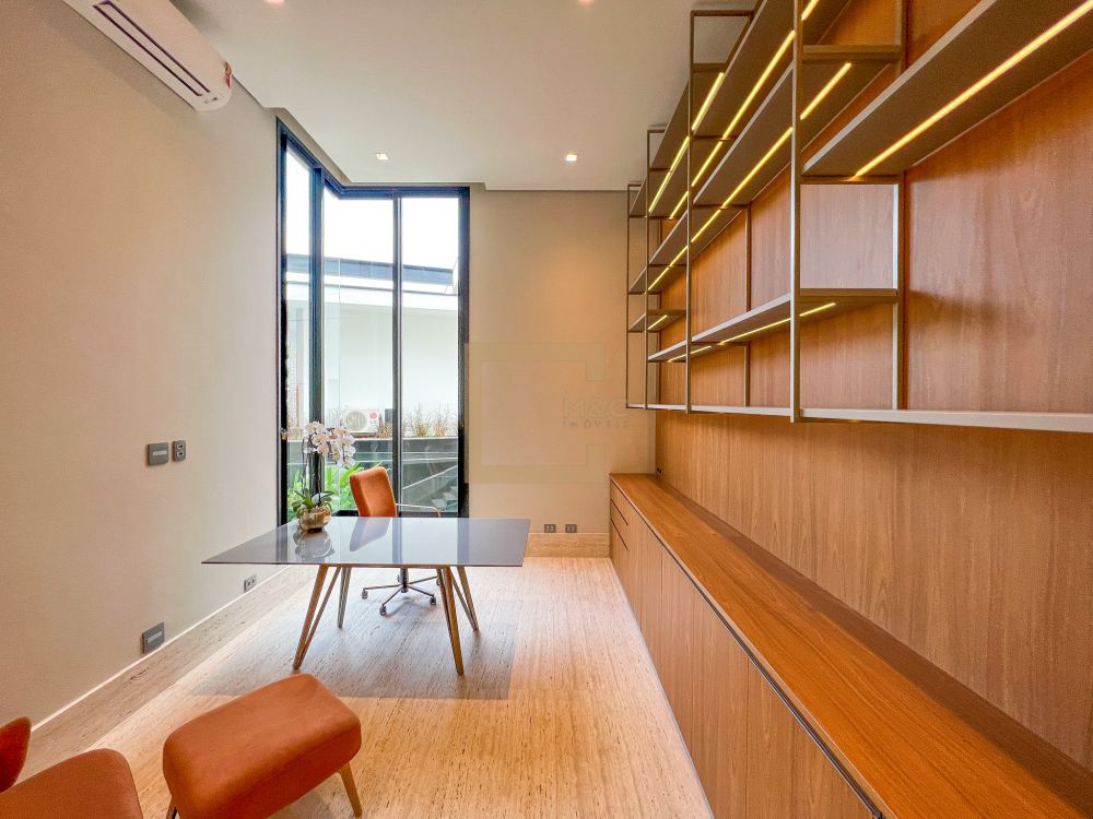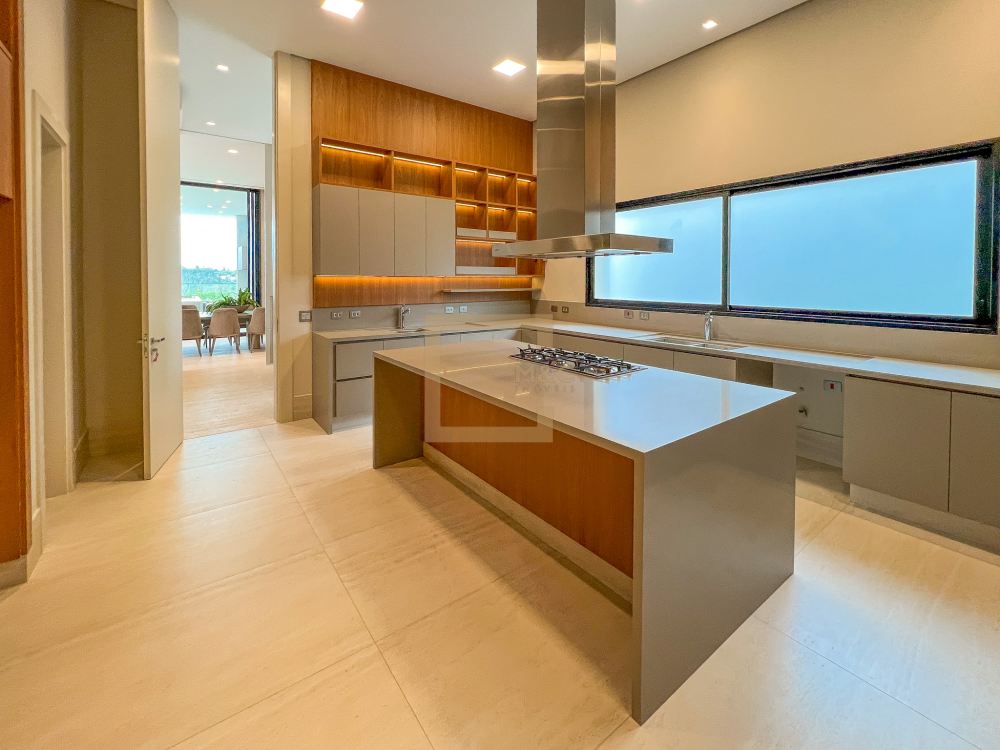Pé direito do pavimento térreo é de 3,95m de altura; Pé direito do primeiro pavimento é de 3,20m de altura; Revestimento da área social do térreo é Mármore Travertino Romano. Adega climatizada; Sala de lareira Piscina aquecida, borda infinita, prainha; Spa com hidromassagem integrado com a piscina; Fireplace; Varanda na fachada e no fundo com vista para o parque; Acesso da cobertura ao Rooftop, composto por um living a céu aberto, possuindo lareira, jardim, iluminação e sistema de som, além do privilégio de contemplar a vista do parque do condomínio e o pôr do sol; A casa ainda conta com cinema, academia pátio coberto e descoberto, elevador Otis para 10 pessoas; Vista para o campo de futebol quadra de futevôlei;Única casa que possui entrada por duas ruas, tanto pela Al. Hang Kong, quanto pela Al. Seoul.