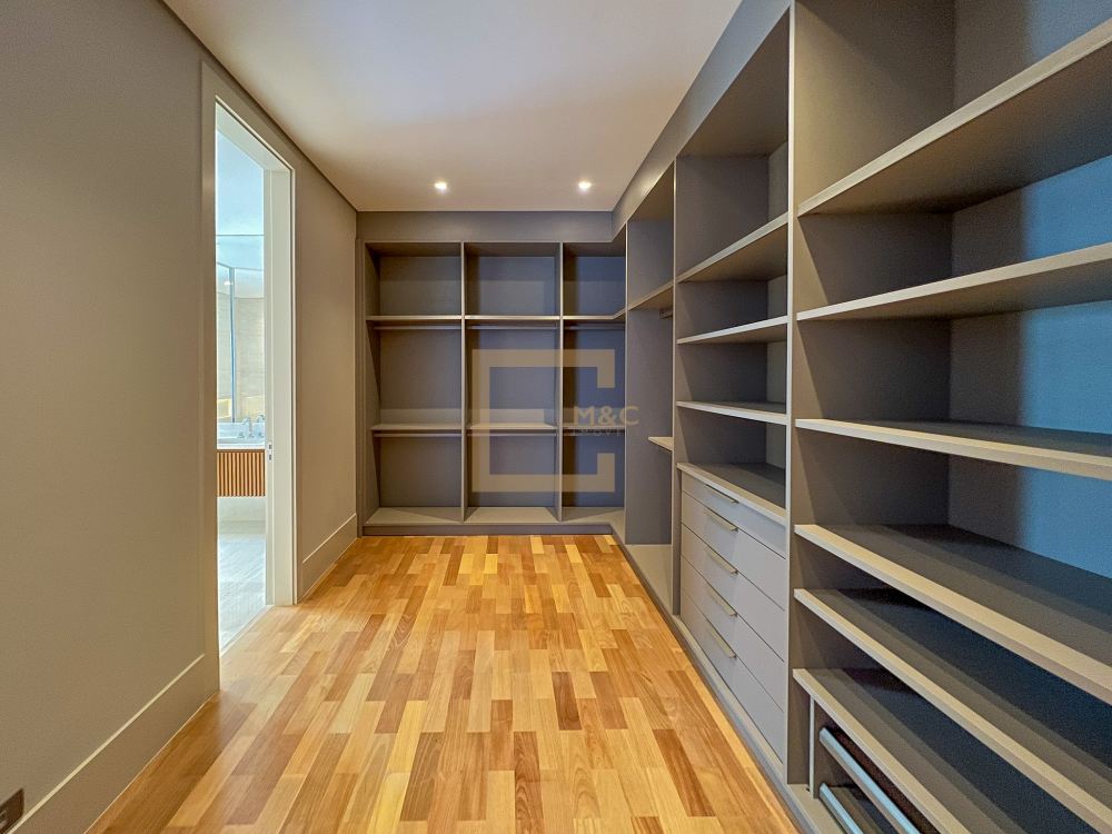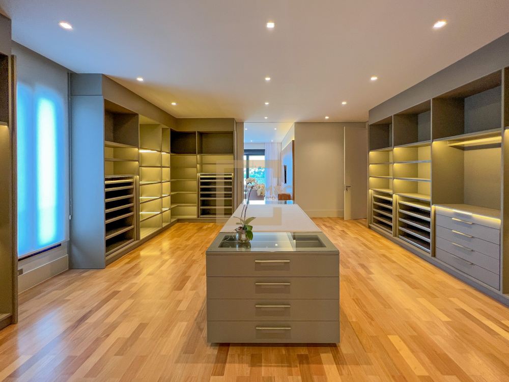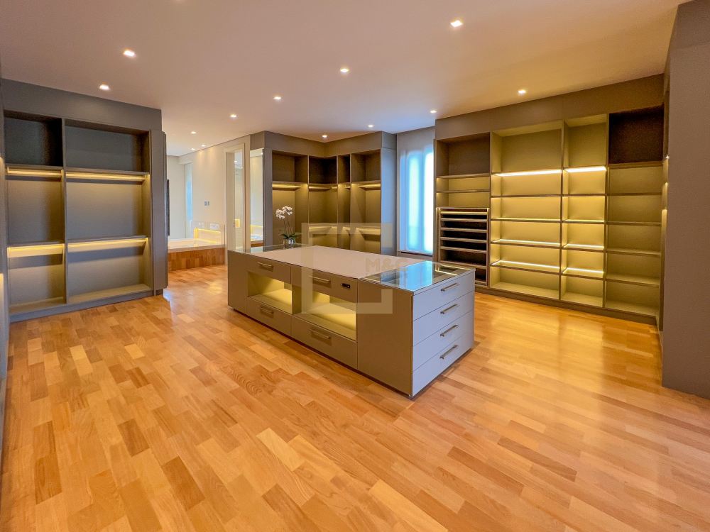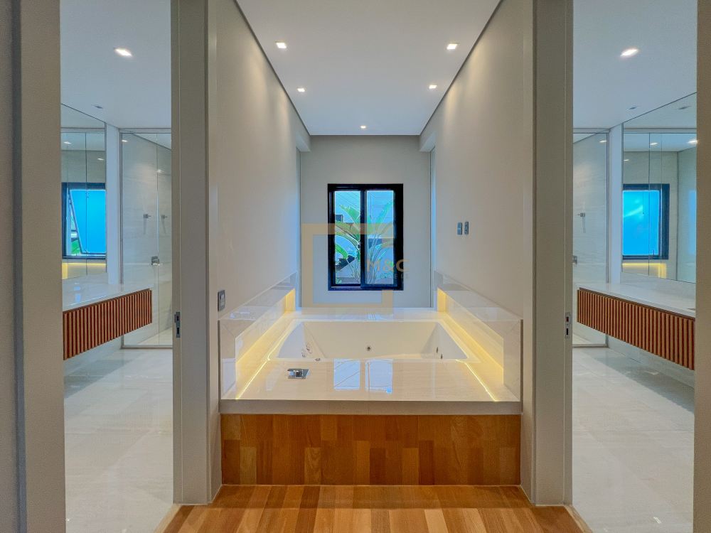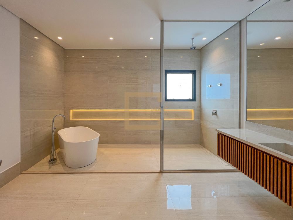 * São 5 suítes com closet, sendo 1 delas master, com banheiro independente para senhor e senhora integrados com banheira jacuzzi e duas outras suítes com banheira de imersão. Revestimentos em todos os pavimentos de Mármore Travertino Romano. Áreas secas com Taco de madeira Tauari ou Cumaru 7x42cm Banheiros revestidos de Porcelanato importado, padrão Travertino Romano.