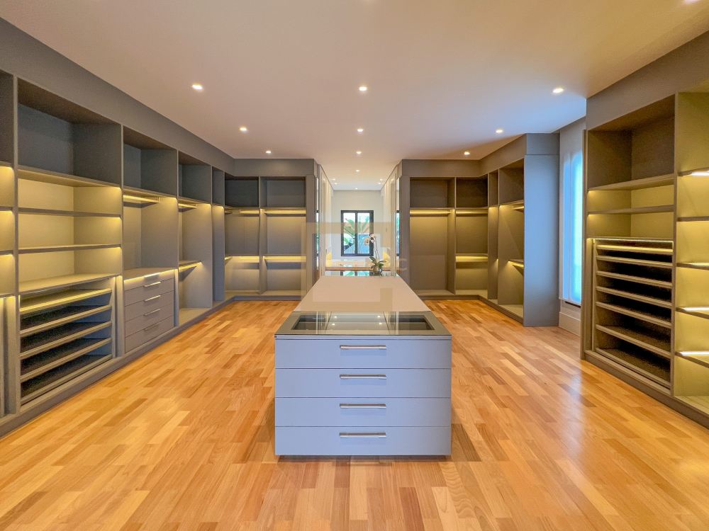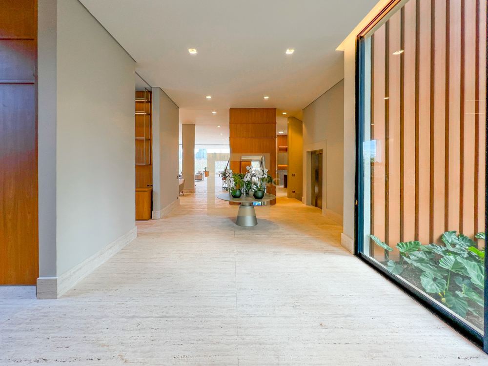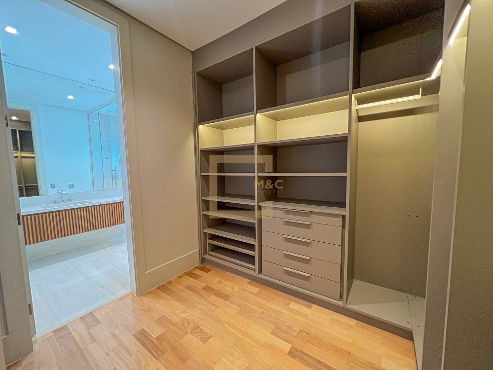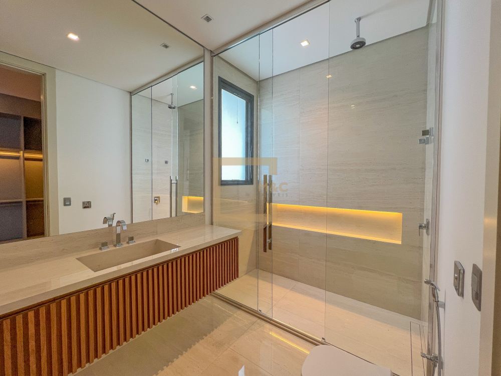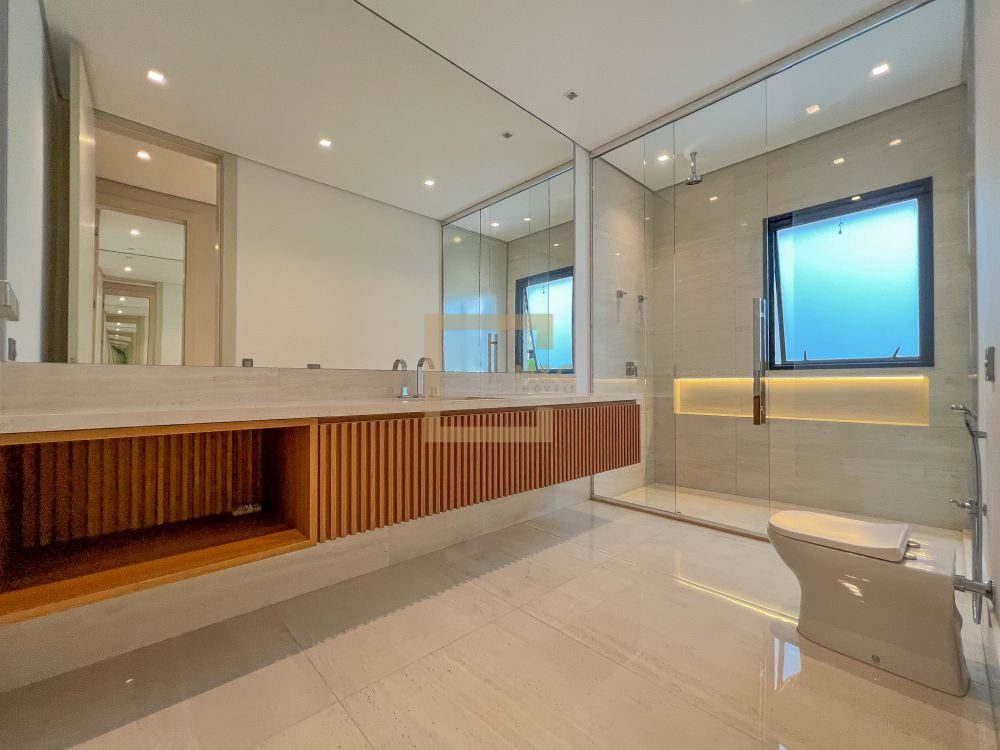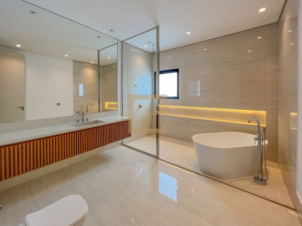 * São 5 suítes com closet, sendo 1 delas master, com banheiro independente para senhor e senhora integrados com banheira jacuzzi e duas outras suítes com banheira de imersão. Revestimentos em todos os pavimentos de Mármore Travertino Romano. Áreas secas com Taco de madeira Tauari ou Cumaru 7x42cm Banheiros revestidos de Porcelanato importado, padrão Travertino Romano.