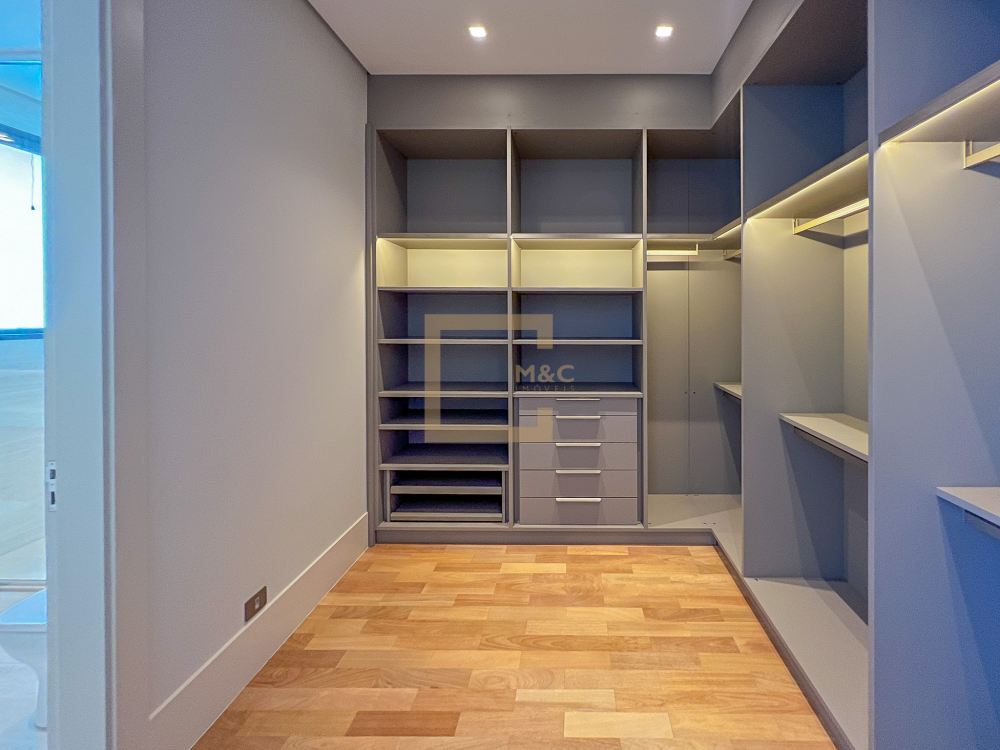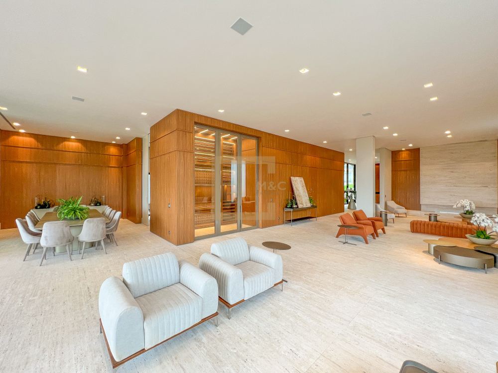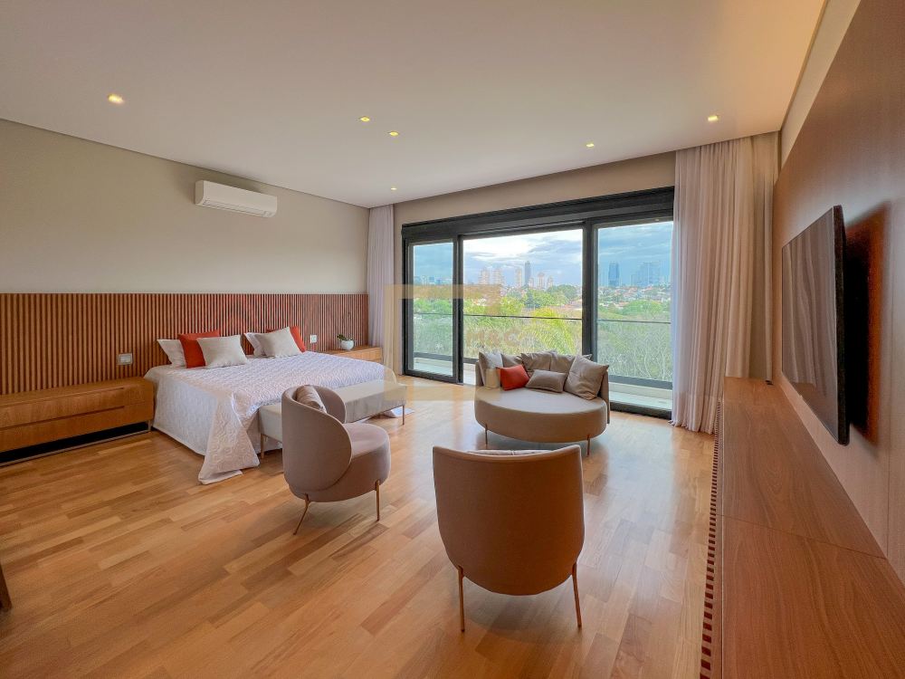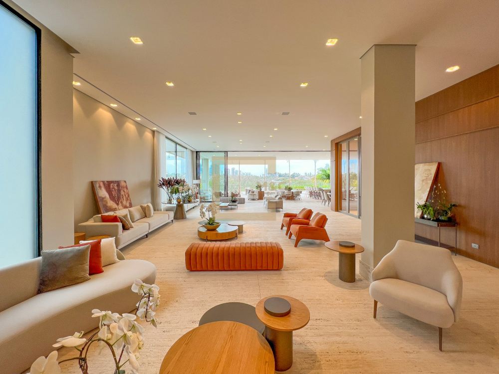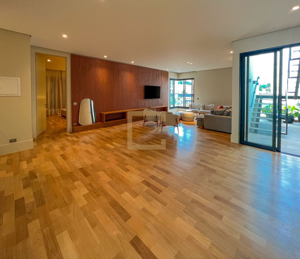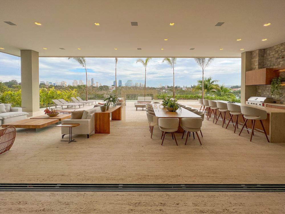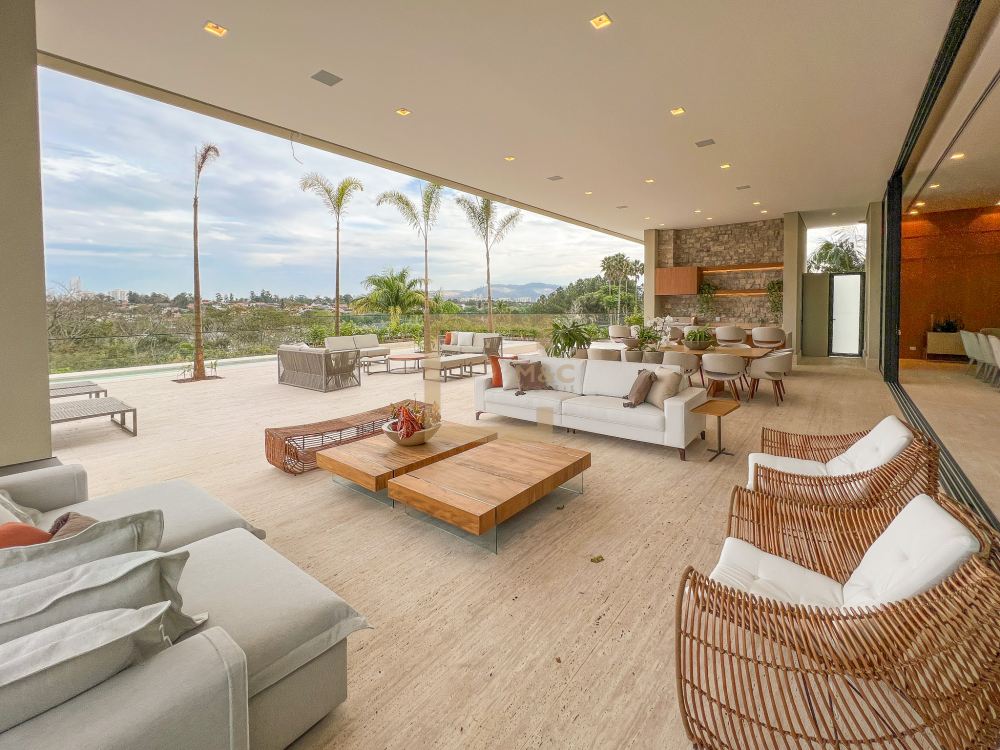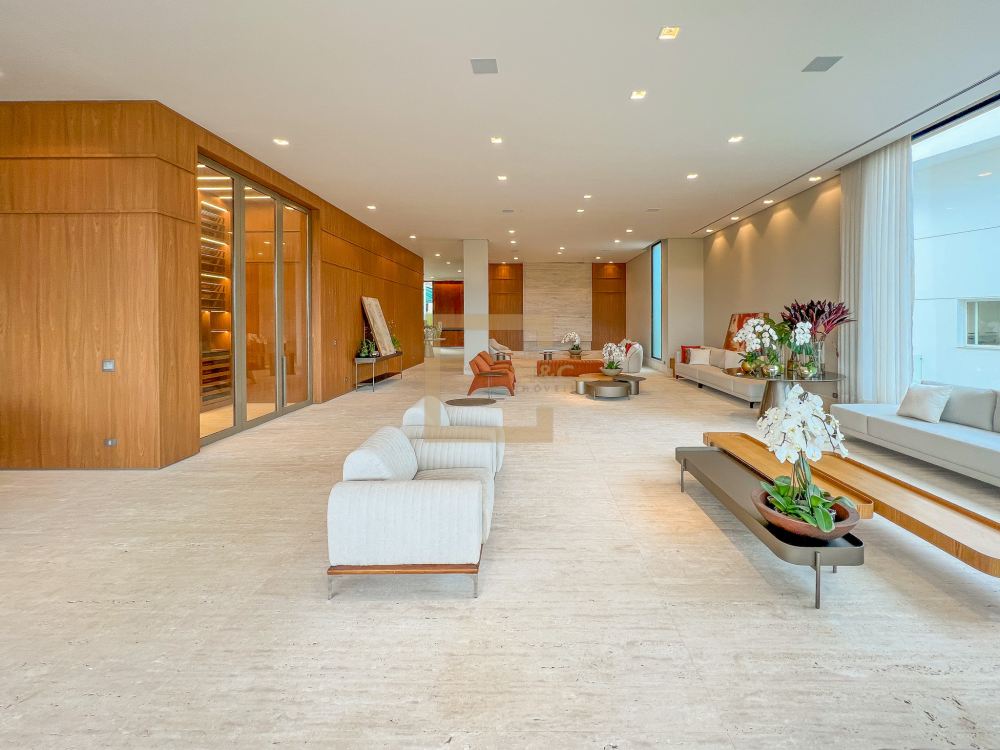 Amplo living integrado com lareira e sala de jantar; 15 vagas para garagem; 4 pavimentos, e na cobertura um rooftop com vista para o parque; cinema, academia, sauna, quadra e bosque; Imóvel único; 11 banheiros; 2 dependências para funcionários.
