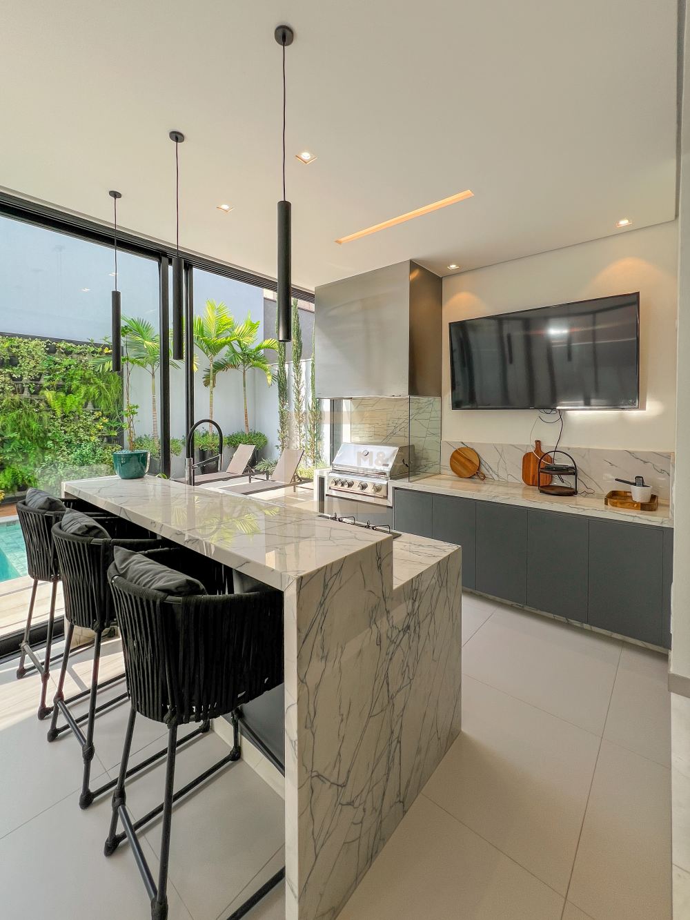 Cozinha moderna e equipada, integrado ao gourmet, e ao lazer. Piscina com prainha e lindo jardim vertical .