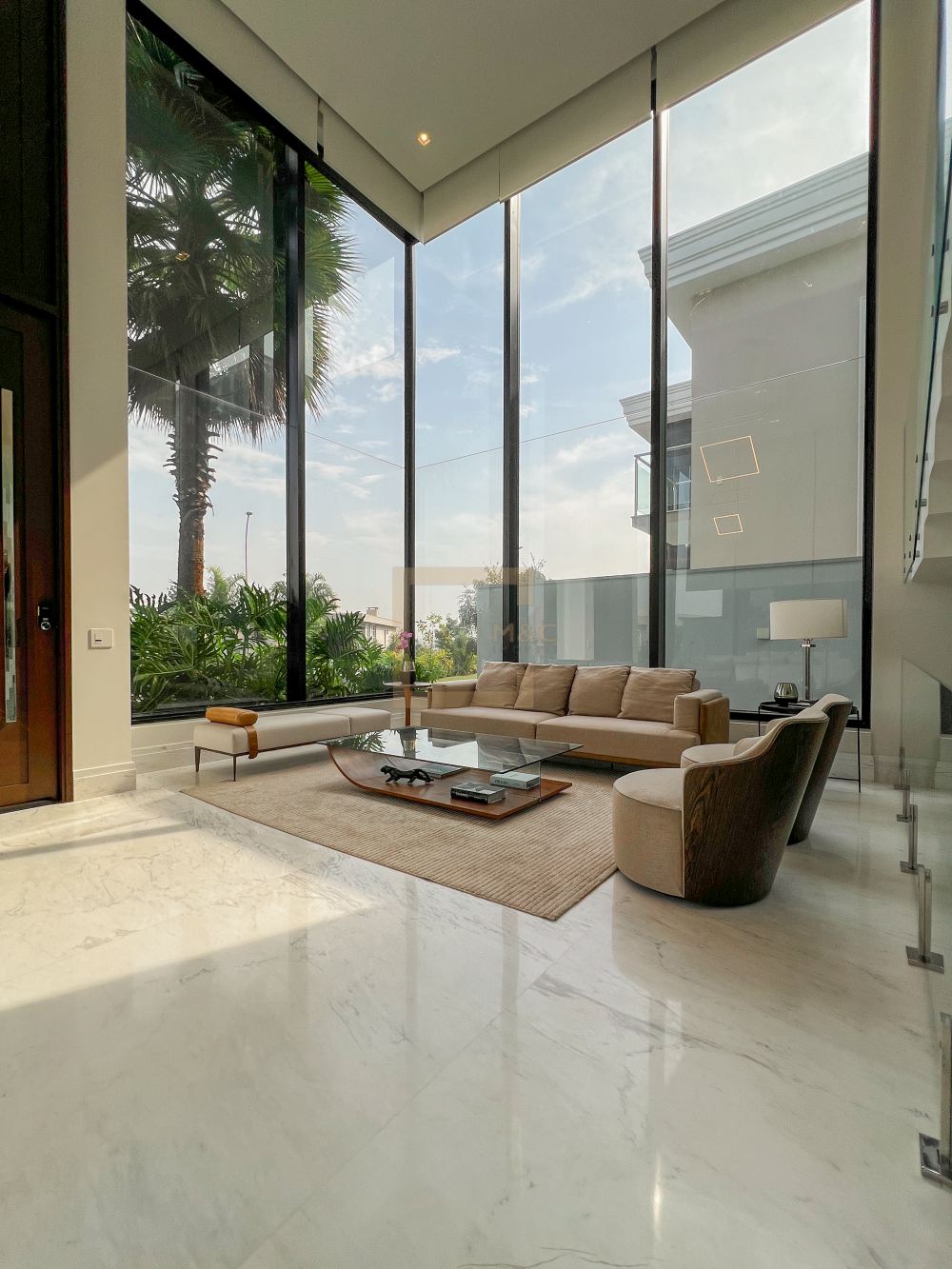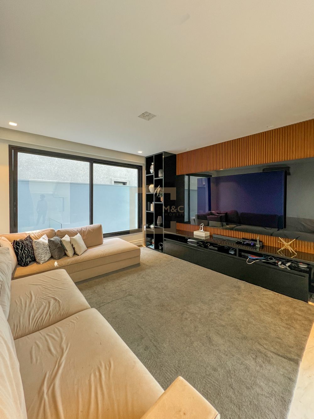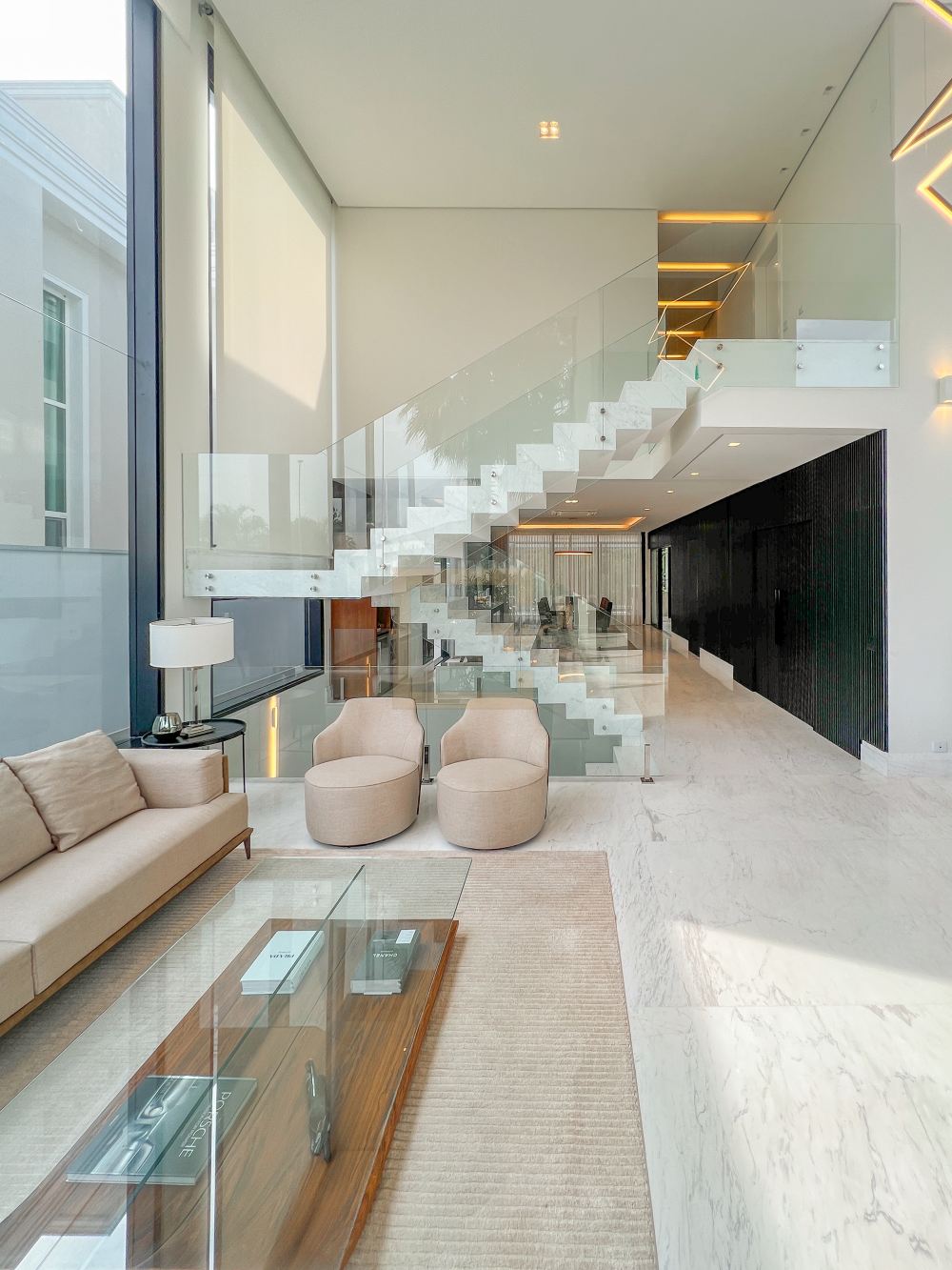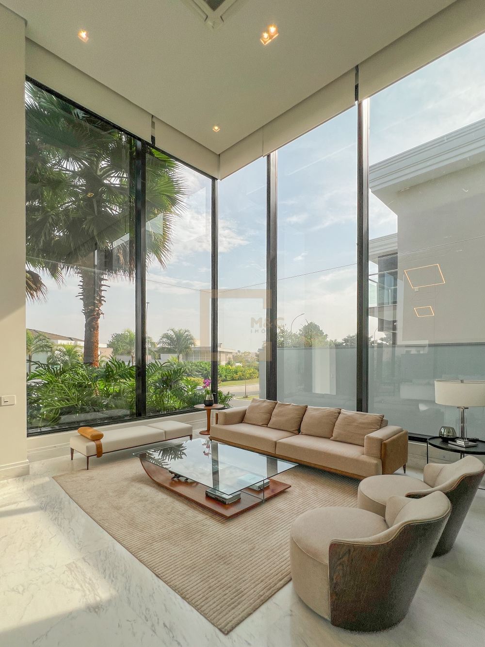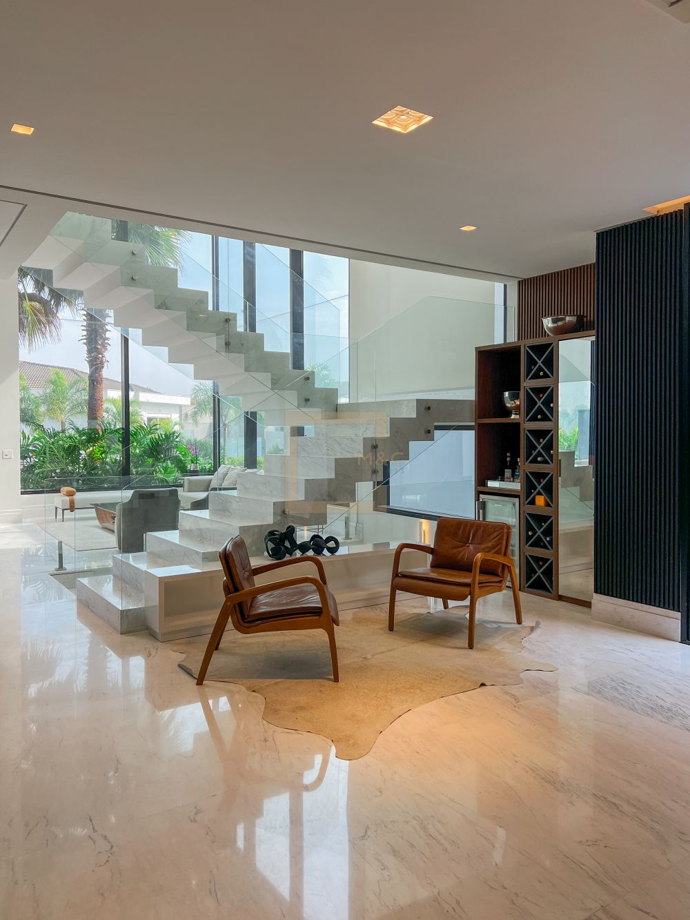 Living com pé direito duplo, enormes painéis de vidro q proporcionam iluminação natural em todos ambientes, lareira, adega