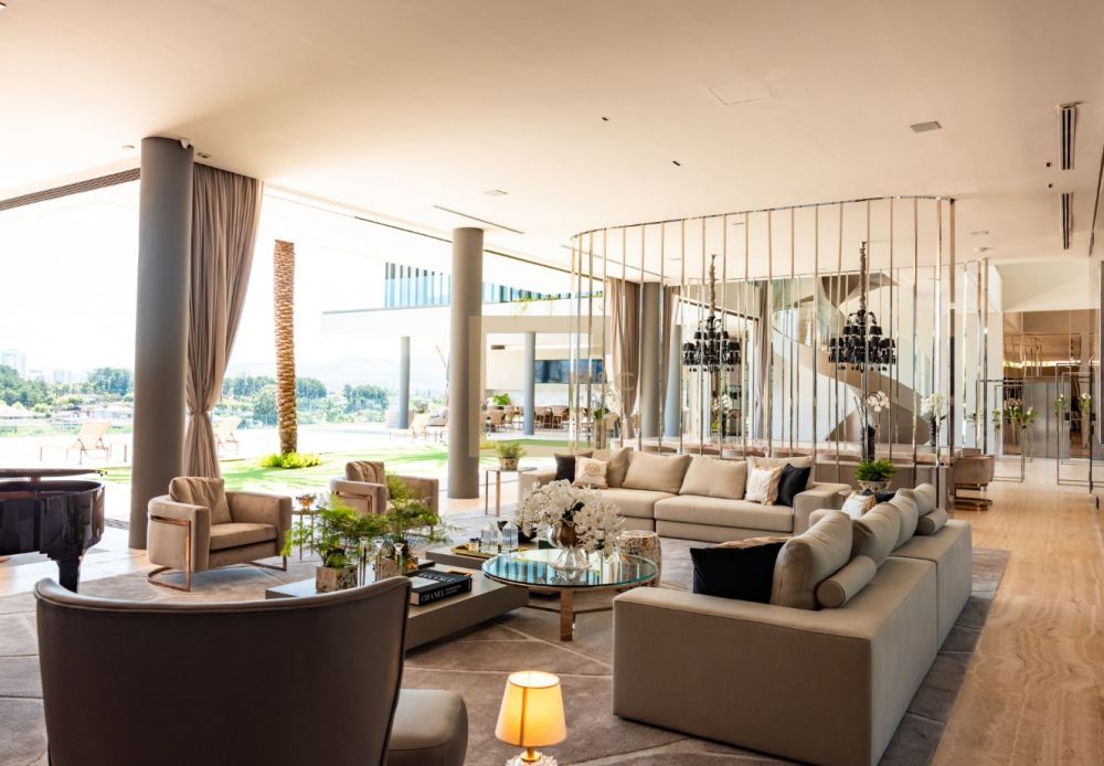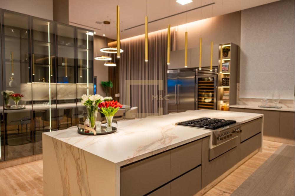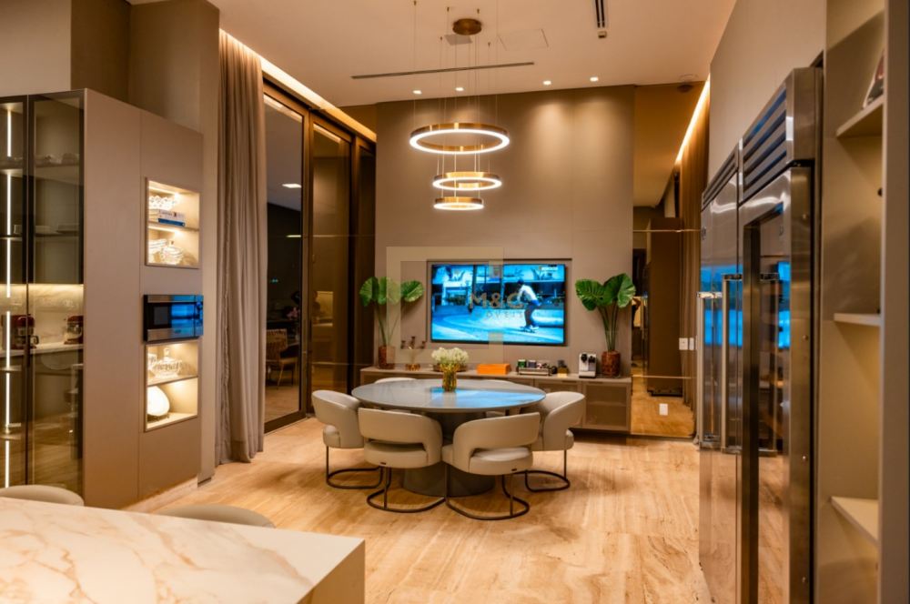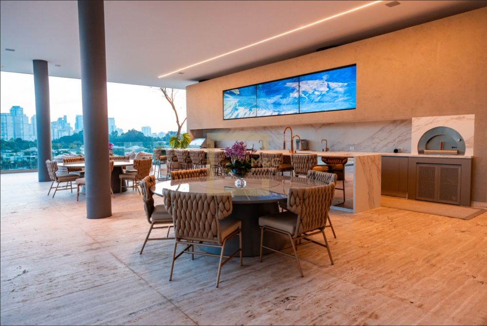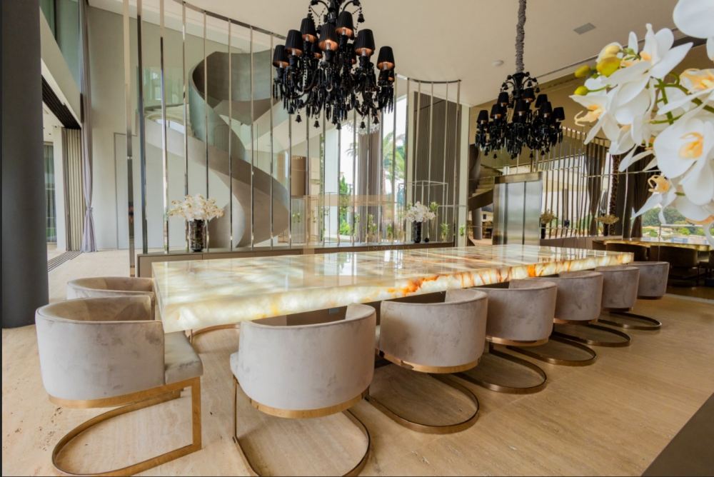 Há um piano bar, uma ilha de bar com pedra Ônix iluminada por uma cascata de 48 pendentes dourados suspensos. A sala de jantar possui um lustre estilo Baccarat e uma mesa de jantar exclusiva de pedra Ônix com mais de 5 metros. O amplo espaço gourmet tem uma ilha em Calacata com quase 8 metros de comprimento e uma mega tela de vídeo de 5 metros para um espetáculo de imagem.