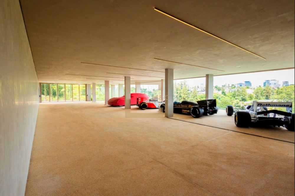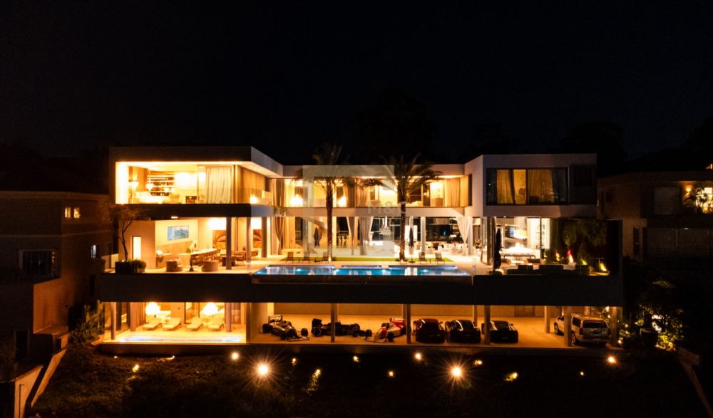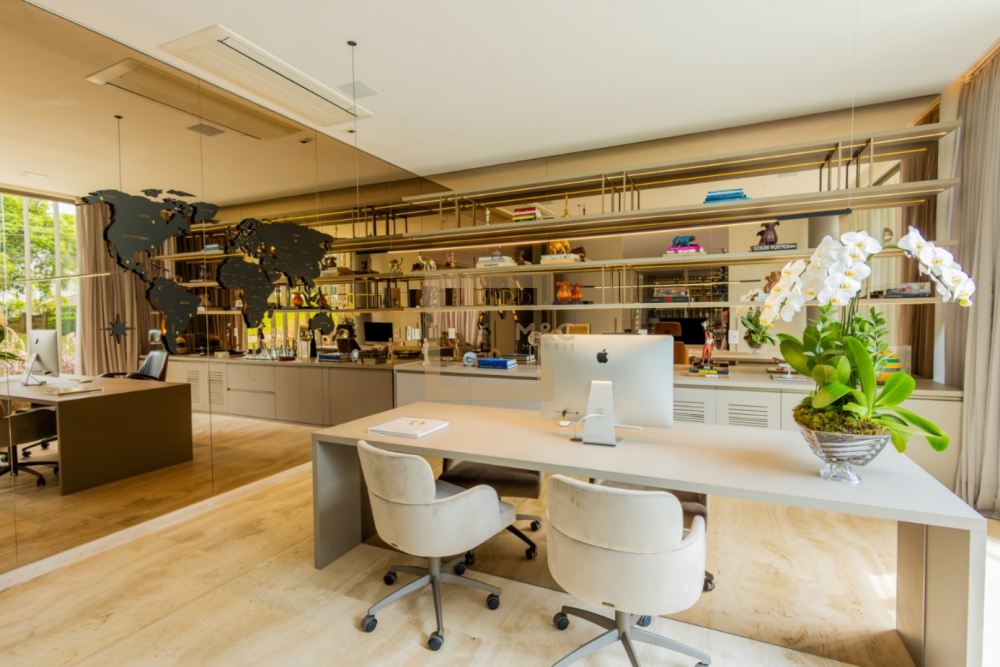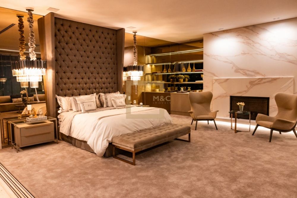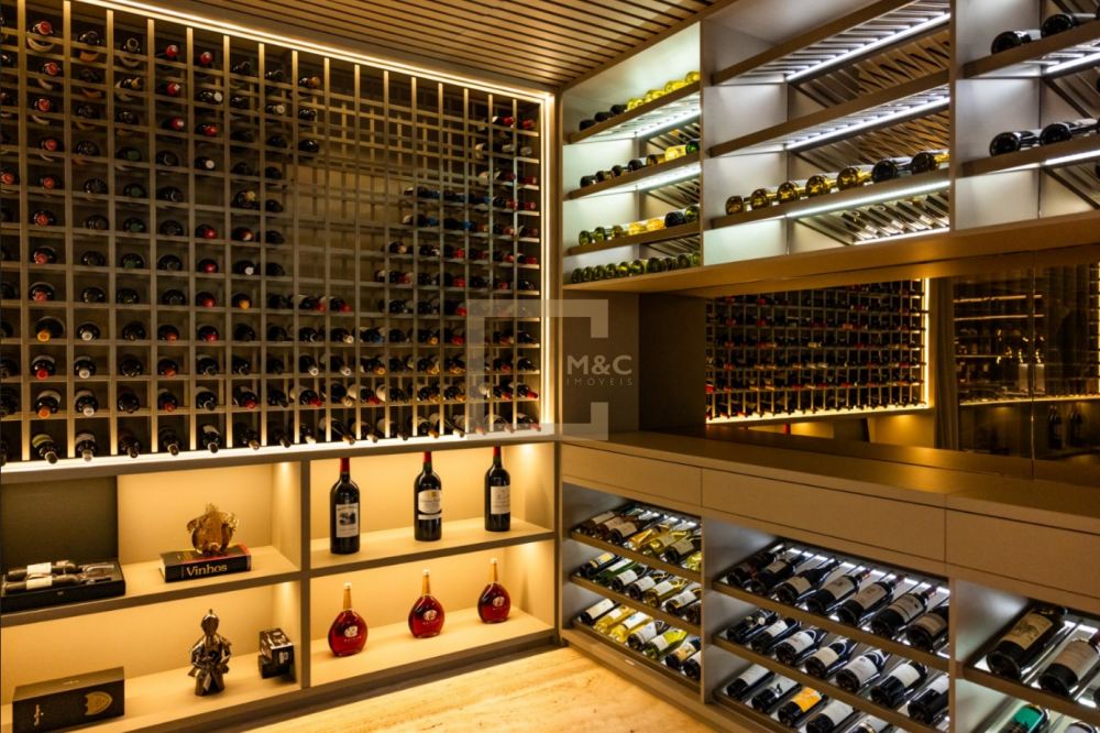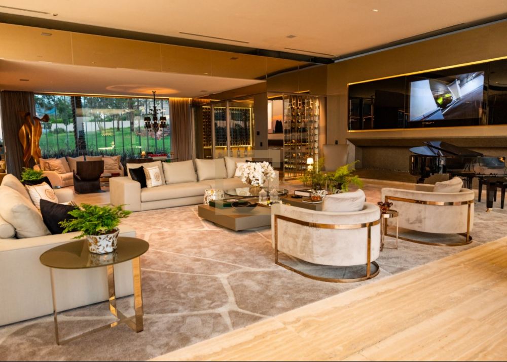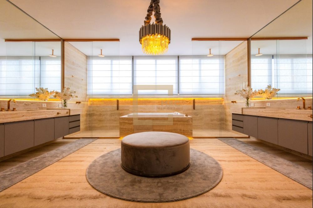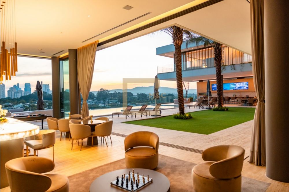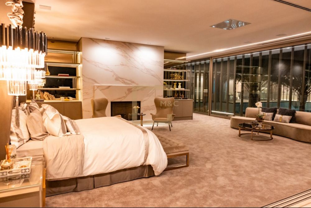 2 elevadores, um home cinema bar, sauna, piano bar e uma varanda com vista para toda a casa. O escritório possui uma adega walk-in e há 6 suítes, incluindo uma super suíte máster com lareira revestida em Calacata, closet com 2 ilhas e um camarim. A garagem vitrine no subsolo oferece vista panorâmica e acomoda 9 vagas. Tudo foi pensado para proporcionar privacidade aos moradores, com espaços e circulação social e de serviço separados.