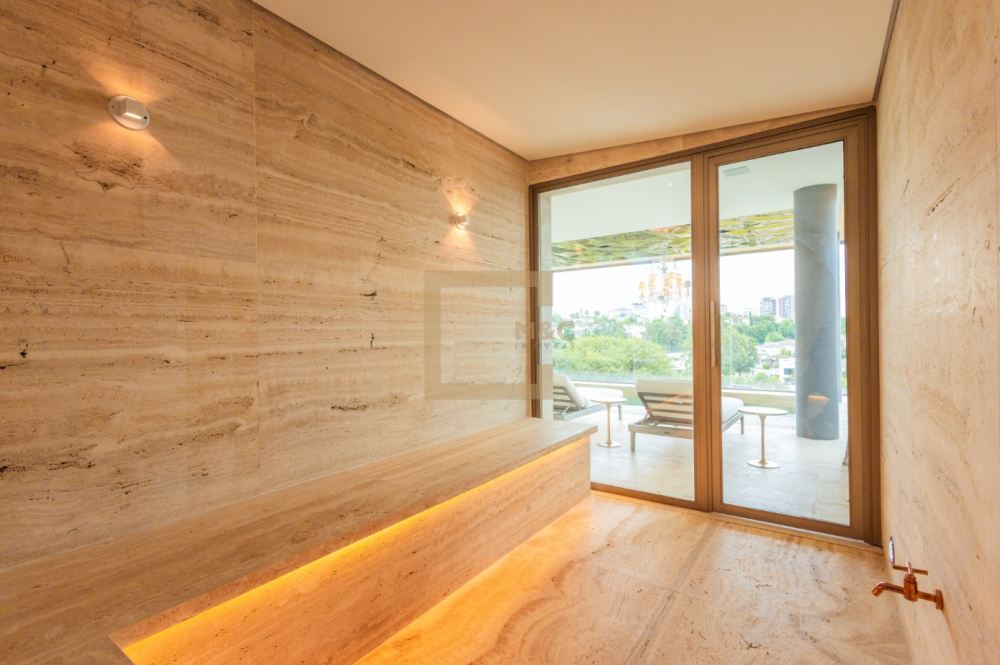 O espaço é todo revestido em mármore italiano Navona, incluindo a piscina de borda infinita. SPA no piso inferior com piscina aquecida, sala de massagem, e jardim vertical, proporcionando um ambiente revitalizante para momentos de relaxamento.